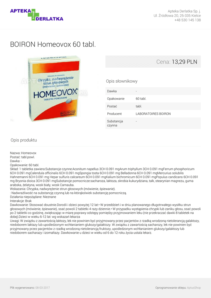 Apteka Derlatka Sp. j. Ul. Źródłowa 20, 25-335 Kielce +48 530 145 138 BOIRON Homeovox 60 tabl. Cena: 13,29 PLN Opis słownikowy Dawka - Opakowanie 60 tabl. Postać tabl. Producent LABORATOIRES BOIRON Substancja czynna - Opis produktu Nazwa: Homeovox Postać: tabl.powl. Dawka: Opakowanie: 60 tabl. Skład: 1 tabletka zawiera:Substancje czynne:Aconitum napellus 3CH 0.091 mgArum triphyllum 3CH 0.091 mgFerrum phosphoricum 6CH 0.091 mgCalendula officinalis 6CH 0.091 mgSpongia tosta 6CH 0.091 mg Belladonna 6CH 0.091 mgMercurius solubilis Hahnemanni 6CH 0.091 mg Hepar sulfuris calcareum 6CH 0.091 mgKalium bichromicum 6CH 0.091 mgPopulus candicans 6CH 0.091 mg Bryonia dioica 3CH 0.091 mgSubstancje pomocnicze:sacharoza, laktoza, skrobia kukurydziana, talk, stearynian magnezu, guma arabska, żelatyna, wosk biały, wosk Carnauba. Wskazania: Chrypka, nadwyrężenie strun głosowych (mówienie, śpiewanie). : Nadwrażliwość na substancję czynną lub na którąkolwiek substancję pomocniczą. Działania niepożądane: Nieznane Interakcje: Brak Dawkowanie: Stosować doustnie.Dorośli i dzieci powyżej 12 lat:• W przeddzień i w dniu planowanego długotrwałego wysiłku strun głosowych (mówienie, śpiewanie), ssać powoli 2 tabletki 4 razy dziennie.• W przypadku wystąpienia chrypki lub zaniku głosu, ssać powoli po 2 tabletki co godzinę, zwiększając w miarę poprawy odstępy pomiędzy przyjmowaniem leku (nie przekraczać dawki 8 tabletek na dobę).Dzieci w wieku 6-12 lat: wg wskazań lekarza Uwagi: W związku z zawartością laktozy, lek nie powinien być przyjmowany przez pacjentów z rzadką wrodzoną nietolerancją galaktozy, niedoborem laktazy lub upośledzonym wchłanianiem glukozy/galaktozy. W związku z zawartością sacharozy, lek nie powinien być przyjmowany przez pacjentów z rzadką wrodzoną nietolerancją fruktozy, upośledzonym wchłanianiem glukozy/galaktozy lub niedoborem sacharazy i izomaltazy. Dawkowanie u dzieci w wieku od 6 do 12 roku życia ustala lekarz. Plik wygenerowano: 08-03-2017 Powered by TCPDF (www.tcpdf.org) Oprogramowanie sklepu: AptusShop