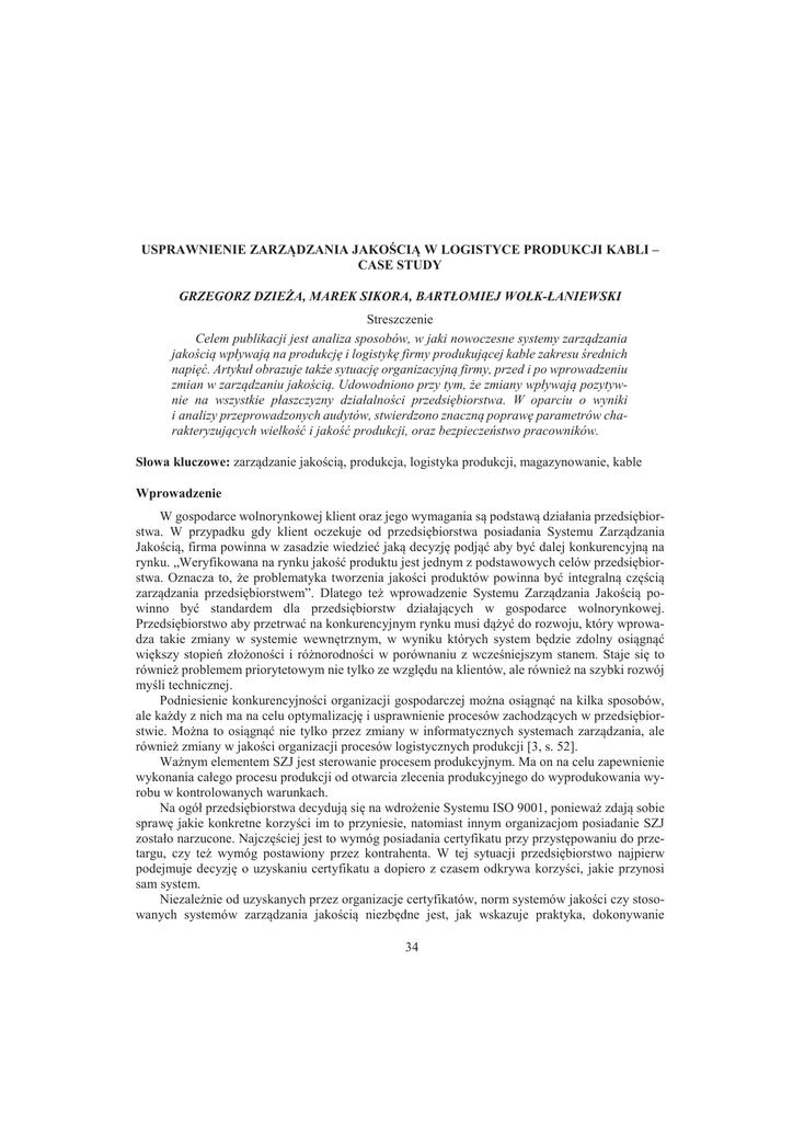 USPRAWNIENIE ZARZDZANIA JAKO CI W LOGISTYCE PRODUKCJI KABLI – CASE STUDY GRZEGORZ DZIEĩA, MAREK SIKORA, BARTŁOMIEJ WOŁK-ŁANIEWSKI Streszczenie Celem publikacji jest analiza sposobów, w jaki nowoczesne systemy zarzdzania jakoci wpływaj na produkcj i logistyk firmy produkujcej kable zakresu rednich napi. Artykuł obrazuje take sytuacj organizacyjn firmy, przed i po wprowadzeniu zmian w zarzdzaniu jakoci. Udowodniono przy tym, e zmiany wpływaj pozytywnie na wszystkie płaszczyzny działalnoci przedsibiorstwa. W oparciu o wyniki i analizy przeprowadzonych audytów, stwierdzono znaczn popraw parametrów charakteryzujcych wielko i jako produkcji, oraz bezpieczestwo pracowników. Słowa kluczowe: zarzdzanie jakoci, produkcja, logistyka produkcji, magazynowanie, kable Wprowadzenie W gospodarce wolnorynkowej klient oraz jego wymagania s podstaw działania przedsibiorstwa. W przypadku gdy klient oczekuje od przedsibiorstwa posiadania Systemu Zarzdzania Jakoci, firma powinna w zasadzie wiedzie jak decyzj podj aby by dalej konkurencyjn na rynku. „Weryfikowana na rynku jako produktu jest jednym z podstawowych celów przedsibiorstwa. Oznacza to, e problematyka tworzenia jakoci produktów powinna by integraln czci zarzdzania przedsibiorstwem”. Dlatego te wprowadzenie Systemu Zarzdzania Jakoci powinno by standardem dla przedsibiorstw działajcych w gospodarce wolnorynkowej. Przedsibiorstwo aby przetrwa na konkurencyjnym rynku musi dy do rozwoju, który wprowadza takie zmiany w systemie wewntrznym, w wyniku których system bdzie zdolny osign wikszy stopie złoonoci i rónorodnoci w porównaniu z wczeniejszym stanem. Staje si to równie problemem priorytetowym nie tylko ze wzgldu na klientów, ale równie na szybki rozwój myli technicznej. Podniesienie konkurencyjnoci organizacji gospodarczej mona osign na kilka sposobów, ale kady z nich ma na celu optymalizacj i usprawnienie procesów zachodzcych w przedsibiorstwie. Mona to osign nie tylko przez zmiany w informatycznych systemach zarzdzania, ale równie zmiany w jakoci organizacji procesów logistycznych produkcji [3, s. 52]. Wanym elementem SZJ jest sterowanie procesem produkcyjnym. Ma on na celu zapewnienie wykonania całego procesu produkcji od otwarcia zlecenia produkcyjnego do wyprodukowania wyrobu w kontrolowanych warunkach. Na ogół przedsibiorstwa decyduj si na wdroenie Systemu ISO 9001, poniewa zdaj sobie spraw jakie konkretne korzyci im to przyniesie, natomiast innym organizacjom posiadanie SZJ zostało narzucone. Najczciej jest to wymóg posiadania certyfikatu przy przystpowaniu do przetargu, czy te wymóg postawiony przez kontrahenta. W tej sytuacji przedsibiorstwo najpierw podejmuje decyzj o uzyskaniu certyfikatu a dopiero z czasem odkrywa korzyci, jakie przynosi sam system. Niezalenie od uzyskanych przez organizacje certyfikatów, norm systemów jakoci czy stosowanych systemów zarzdzania jakoci niezbdne jest, jak wskazuje praktyka, dokonywanie 34 Studies & Proceedings of Polish Association for Knowledge Management Nr 78, 2016 usprawnie organizacji zaczynajc od poprawy funkcjonowania najbardziej podstawowych jej elementów. Rozwizaniem które to umoliwia jest wdroenie koncepcji Kaizen, która realizuje zasad organizacji stanowiska pracy (zasada 5S) oraz zasad eliminacji marnotrawstwa (muda). Celem publikacji jest zaprezentowanie, w jaki sposób techniki Kaizen wspomagaj procesy logistyczne w produkcji i jak przebiega ich implementacja do systemu produkcyjnego przedsibiorstwa z brany produkcji kabli. 1. Rola zarzdzania jakoci w procesach logistycznych Rozumienie jakoci samej w sobie, a take jakoci „wytworów”, definiowanych jako: przedmioty materialne, usługi, wytwory intelektualne czy materiały przetworzone zmieniało si wraz z upływem czasu, aczkolwiek jakoci zawsze okrelano cechy wyrobów [11, s. 27]. Wiodc rol w systemach zarzdzania jakoci pełni normy oraz okrelone standardy. Definicja norm technologicznych ISO 9000 okrela jako jako stopie, w jakim ogół nieodłcznych właciwoci produktu lub usługi spełnia wymagania klienta, natomiast W. Edwards Deming okrelił j jako „zaspokojenie aktualnych i przyszłych potrzeb klienta” [9, s. 15]. Jako jest jednak pojciem relatywnym, dlatego wysoki standard wyrobu lub usługi dla jednych nie musi by zadowalajcy dla innych. Celem do którego naley dy jest wic nie wyrób o najwyszym poziomie jakoci, lecz wyrób o optymalnym poziomie jakoci (niszy od maksymalnego, czyli doskonałoci) [7, s. 43]. W celu wypracowania uniwersalnych form spełniania potrzeb i oczekiwa klientów, wdroono systemy zarzdzania jakoci. Istot takich systemów jest poprawa jakoci produkowanych wyrobów lub wiadczonych usług oraz poprawa obsługi klientów. Efektem wdraania systemów zarzdzania jakoci jest zmniejszenie iloci niezgodnoci, braków wewntrznych oraz reklamacji klientów. Firmy maj pełn wiadomo, e wdraanie systemów zarzdzania jakoci nie tylko polepsza ogóln rentowno, ale równie umacnia ich pozycj na rynku i zwiksza zaufanie klientów. Mimo, e producent współuczestniczy w tworzeniu produktu wraz z innymi podmiotami, to włanie on pełni w tym procesie rol inicjatywn oraz jest odpowiedzialny za jako. Sukces producenta, satysfakcja klientów i innych podmiotów z otoczenia zale nie tyle od statystycznie rozpatrywanej jakoci wyrobu jako przedmiotu materialnego, ile od jakoci procesów pełnego cyklu istnienia wyrobu. Jako produktu musi, bowiem uwzgldnia wszystkie prognozowane, programowane i planowane procesy, jakim bdzie on podlega w całym cyklu jego ycia [2, s. 133], [4, s. 123], [5, s. 85]. Jedn z koncepcji wdraanych dla poprawy jakoci w logistyce produkcji jest filozofia Kaizen, która zakłada nie tylko wyprodukowanie produktów okrelonej jakoci, ale przede wszystkim funkcjonowanie organizacji w formule cigłego procesu ulepszania. Podstawow reguł jest stałe zaangaowanie oraz ch do ustawicznego podnoszenia jakoci tak produktu, jak i całego przedsibiorstwa, w tym np. skrócenia c