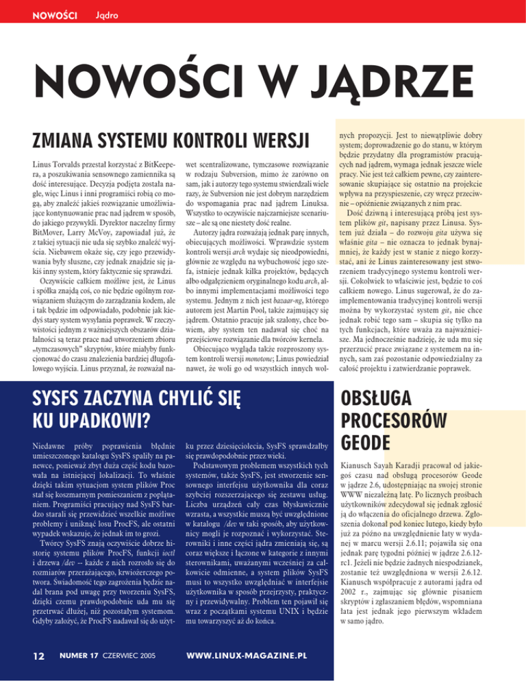NOWOŚCI Jądro NOWOŚCI W JĄDRZE ZMIANA SYSTEMU KONTROLI WERSJI Linus Torvalds przestał korzystać z BitKeepera, a poszukiwania sensownego zamiennika są dość interesujące. Decyzja podjęta została nagle, więc Linus i inni programiści robią co mogą, aby znaleźć jakieś rozwiązanie umożliwiające kontynuowanie prac nad jądrem w sposób, do jakiego przywykli. Dyrektor naczelny firmy BitMover, Larry McVoy, zapowiadał już, że z takiej sytuacji nie uda się szybko znaleźć wyjścia. Niebawem okaże się, czy jego przewidywania były słuszne, czy jednak znajdzie się jakiś inny system, który faktycznie się sprawdzi. Oczywiście całkiem możliwe jest, że Linus i spółka znajdą coś, co nie będzie ogólnym rozwiązaniem służącym do zarządzania kodem, ale i tak będzie im odpowiadało, podobnie jak kiedyś stary system wysyłania poprawek. W rzeczywistości jednym z ważniejszych obszarów działalności są teraz prace nad utworzeniem zbioru „tymczasowych” skryptów, które miałyby funkcjonować do czasu znalezienia bardziej długofalowego wyjścia. Linus przyznał, że rozważał na- wet scentralizowane, tymczasowe rozwiązanie w rodzaju Subversion, mimo że zarówno on sam, jak i autorzy tego systemu stwierdzali wiele razy, że Subversion nie jest dobrym narzędziem do wspomagania prac nad jądrem Linuksa. Wszystko to oczywiście najczarniejsze scenariusze – ale są one niestety dość realne. Autorzy jądra rozważają jednak parę innych, obiecujących możliwości. Wprawdzie system kontroli wersji arch wydaje się nieodpowiedni, głównie ze względu na wybuchowość jego szefa, istnieje jednak kilka projektów, będących albo odgałęzieniem oryginalnego kodu arch, albo innymi implementacjami możliwości tego systemu. Jednym z nich jest bazaar-ng, którego autorem jest Martin Pool, także zajmujący się jądrem. Ostatnio pracuje jak szalony, chce bowiem, aby system ten nadawał się choć na przejściowe rozwiązanie dla twórców kernela. Obiecująco wygląda także rozproszony system kontroli wersji monotone; Linus powiedział nawet, że woli go od wszystkich innych wol- SYSFS ZACZYNA CHYLIĆ SIĘ KU UPADKOWI? Niedawne próby poprawienia błędnie umieszczonego katalogu SysFS spaliły na panewce, ponieważ zbyt duża część kodu bazowała na istniejącej lokalizacji. To właśnie dzięki takim sytuacjom system plików Proc stał się koszmarnym pomieszaniem z poplątaniem. Programiści pracujący nad SysFS bardzo starali się przewidzieć wszelkie możliwe problemy i uniknąć losu ProcFS, ale ostatni wypadek wskazuje, że jednak im to grozi. Twórcy SysFS znają oczywiście dobrze historię systemu plików ProcFS, funkcji ioctl i drzewa /dev -- każde z nich rozrosło się do rozmiarów przerażającego, krwiożerczego potwora. Świadomość tego zagrożenia będzie nadal brana pod uwagę przy tworzeniu SysFS, dzięki czemu prawdopodobnie uda mu się przetrwać dłużej, niż pozostałym systemom. Gdyby założyć, że ProcFS nadawał się do użyt- 12 NUMER 17 CZERWIEC 2005 ku przez dziesięciolecia, SysFS sprawdzałby się prawdopodobnie przez wieki. Podstawowym problemem wszystkich tych systemów, także SysFS, jest stworzenie sensownego interfejsu użytkownika dla coraz szybciej rozszerzającego się zestawu usług. Liczba urządzeń cały czas błyskawicznie wzrasta, a wszystkie muszą być uwzględnione w katalogu /dev w taki sposób, aby użytkownicy mogli je rozpoznać i wykorzystać. Sterowniki i inne części jądra zmieniają się, są coraz większe i łączone w kategorie z innymi sterownikami, uważanymi wcześniej za całkowicie odmienne, a system plików SysFS musi to wszystko uwzględniać w interfejsie użytkownika w sposób przejrzysty, praktyczny i przewidywalny. Problem ten pojawił się wraz z początkami systemu UNIX i będzie mu towarzyszyć aż do końca. WWW.LINUX-MAGAZINE.PL nych propozycji. Jest to niewątpliwie dobry system; doprowadzenie go do stanu, w którym będzie przydatny dla programistów pracujących nad jądrem, wymaga jednak jeszcze wiele pracy. Nie jest też całkiem pewne, czy zainteresowanie skupiające się ostatnio na projekcie wpływa na przyspieszenie, czy wręcz przeciwnie – opóźnienie związanych z nim prac. Dość dziwną i interesującą próbą jest system plików git, napisany przez Linusa. System już działa – do rozwoju gita używa się właśnie gita – nie oznacza to jednak bynajmniej, że każdy jest w stanie z niego korzystać, ani że Linus zainteresowany jest stworzeniem tradycyjnego systemu kontroli wersji. Cokolwiek to właściwie jest, będzie to coś całkiem nowego. Linus sugerował, że do zaimplementowania tradycyjnej kontroli wersji można by wykorzystać system git, nie chce jednak robić tego sam – skupia się tylko na tych funkcjach, które uważa za najważniejsze. Ma jednocześnie nadzieję, że uda mu się przerzucić prace związane z systemem na innych, sam zaś pozostanie odpowiedzialny za całość projektu i zatwierdzanie poprawek. OBSŁUGA PROCESORÓW GEODE Kianusch Sayah Karadji pracował od jakiegoś czasu nad obsługą procesorów Geode w jądrze 2.6, udostępniając na swojej stronie WWW niezależną łatę. Po licznych prośbach użytkowników zdecydował się jednak zgłosić ją do włączenia do oficjalnego drzewa. Zgłoszenia dokonał pod koniec lutego, kiedy było już za późno na uwzględnienie łaty w wydanej w marcu wersji 2.6.11; pojawiła się ona jednak parę tygodni później w jądrze 2.6.12rc1. Jeżeli nie będzie żadnych niespodzianek, zostanie też uwzględniona w wersji 2.6.12. Kianusch współpracuje z autorami jądra od 2002 r., zajmując się głównie pisaniem skryptów i zgłaszaniem błędów, wspomniana łata jest jednak jego pierwszym wkładem w samo jądro. Jądro SZYBSZY HOTPLUG Greg Kroah-Hartman jest autorem działającego w przestrzeni użytkownika projektu, odpowiedzialnego za podłączanie urządzeń podczas pracy
