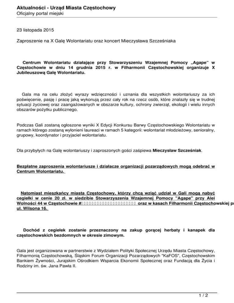 Aktualności - Urząd Miasta Częstochowy Oficjalny portal miejski 23 listopada 2015 Zaproszenie na X Galę Wolontariatu oraz koncert Mieczysława Szcześniaka Centrum Wolontariatu działające przy Stowarzyszeniu Wzajemnej Pomocy „Agape” w Częstochowie w dniu 14 grudnia 2015 r. w Filharmonii Częstochowskiej organizuje X Jubileuszową Galę Wolontariatu. Gala ma na celu złożyć wyrazy wdzięczności i uznania dla wszystkich wolontariuszy za ich poświęcenie, pasję i pracę jaką wykonują przez cały rok na rzecz osób, które znalazły się w trudnej sytuacji życiowej oraz zaangażowanych w obszarze kultury, ochrony zwierząt, ekologii i wielu innych obszarów pożytku publicznego. Podczas Gali zostaną ogłoszone wyniki X Edycji Konkursu Barwy Częstochowskiego Wolontariatu w ramach którego zostaną wyłonieni laureaci w ramach 5 kategorii: wolontariat młodzieżowy, senioralny, grupowy, koordynator i przyjaciel wolontariatu. Dla przybyłych na Galę wolontariuszy i zaproszonych gości zaśpiewa Mieczysław Szcześniak. Bezpłatne zaproszenia wolontariusze i działacze organizacji pozarządowych mogą odebrać w Centrum Wolontariatu. Natomiast mieszkańcy miasta Częstochowy, którzy chcą wziąć udział w Gali mogą nabyć cegiełki w cenie 20 zł. w siedzibie Stowarzyszenia Wzajemnej Pomocy "Agape" przy Alei Wolności 44 w Częstochowie #℣佐⌡⌀琀攀氀⸀㌀㐀㌀㘀㈀㜀㠀㘀㘀⌡⍃倣℣ oraz w kasach Filharmonii Częstochowskiej pr ul. Wilsona 16. Dochód z cegiełek zostanie przeznaczony na zakup gorącej herbaty i kanapek dla częstochowskich bezdomnych w okresie zimowym. Gala jest organizowana w partnerstwie z Wydziałem Polityki Społecznej Urzędu Miasta Częstochowy, Filharmonią Częstochowską, Śląskim Forum Organizacji Pozarządowych "KaFOS", Częstochowskim Bankiem Żywności, Jurajskim Ośrodkiem Wsparcia Ekonomii Społecznej oraz Fundacją dla Życia i Rodziny im. św. Jana Pawła II. 1/2 Aktualności - Urząd Miasta Częstochowy Oficjalny portal miejski Patronat honorowy nad Galą objął Krzysztof Matyjaszczyk, Prezydent Miasta Częstochowy oraz dr Ryszard Majer Senator RP. Natomiast patronat medialny objęła TV Orion, Radio Fiat, Radio Jura oraz Częstochowskie24. Plakat Gali znajduje się poniżej w załączniku Pliki do pobrania: Plakat (225.2 KB) Pozostałe aktualności 2/2 Powered by TCPDF (www.tcpdf.org)