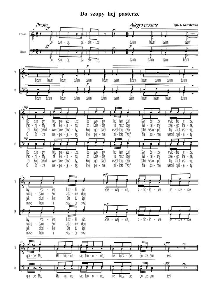 Do szopy hej pasterze Presto ƒ j 3Œ V8 ¿ J Tenor ƒ ? 38 Œ Bass ¿ ¿ Do szo - py, j ¿ J ¿ Do ¿ B V œœ ?œ œ P V œ ≈ ¿ szo - py, bzum bzum f œœ bzum bzum œœ œ j œ œ J bzum œœ œœ œœ œœ œœ V œ œœ œœ œœ œœ œ by zba - wić wdzię - czno - ści jak słod - ko masz tron i ? œœ œœ œœ ludz złóż On służ - ki - my tu - bę ród. dług. śpi! swą. by zba - wić wdzię - czno - ści jak słod - ko masz tron i ludz złóż On służ - ki - my tu - bę ród. dług. śpi! swą. œœ œœ œœ œ œ œœ œœ P ? œœ szo - py, hej, pa - ste - nij - my na ko - la Bóg przed - wie - cznej chwa Bo - że nie - po - ję - szo - py, hej, pa - ste - nij - my na ko - la Bóg przed - wie - cznej chwa Bo - że nie - po - ję - œ #œ œ V œ œ œ graj - cie Mu, B j œœ J bzum j œœ J bzum œœ œ œœ œœ œœ 24 T bzum œœ bzum f œœ j œœ J bzum œ œ ? œœ œœ œœ graj - cie Mu, U Œ. bzum œœ 19 B œ œ Œ. pa - ste - rze, œœ bzum ¿ ‰ œ œ œ œ Do Pad Ten O T bzum ¿ œœ Do Pad Ten O B œœ ‰ œœ 13 T œ ¿ pa - ste - rze, 7 T ¿ ≈ ¿ Allegro pesante p j .. œ œœ œ œœ J bzum bzum bzum p j .. œ œ œœ œ œ J U rze, na, ły, ty, œœ œœ kła - niaj - cie œœ rze, na, ły, ty, œœ kła - niaj - cie do to Bóg kto do to Bóg kto œ œ œ œ œœ œœ j œœ J œœ bzum bzum j œ œ J œœ bzum bzum œœ œœ œ szo - py Dzie - cię go - dzien poj - mie szo - py Dzie - cię go - dzien poj - mie bo tam to nasz wszel - kiej mi - łość cud; Bóg; czci, Twą? œœ œœ œœ bo tam to nasz wszel - kiej mi - łość cud; Bóg; czci, Twą? F œ œœ œœ F œœ œœ Śpie - waj - cie, œœ œœ Śpie - waj - cie, bzum bzum œ œ bzum j œœ J bzum œœ bzum bzum œ œ œ œ bzum ‰ ‰ œœ ‰ œœ bzum œ œ œœ œœ œœ œœ œœ œœ œœ ‰ bzum œ œœ œœ œœ œœ œœ œœ œœ œ œ œœ a - nio - ło - wie pa - ste - rze, œœ œœ œœ œœ œ œ Syn Bo - ży Wi - taj - my patrz wszo - pie Na sia - mie Syn Bo - ży Wi - taj - my patrz wszo - pie Na sia - mie a - nio - ło - wie œœ œœ œ się, kró - lo - wie, œœ œœ nie budź - cie Go ze snu. œœ œœ œœ œœ œœ œœ œœ œœ œœ nie budź - cie bzum bzum œ się, kró - lo - wie, j œœ J bzum œœ œ opr. J. Kowalewski Go ze snu. w*żło - bie le swe - go Pa tej zbut - wia wśród byd - lę - w*żło - bie le swe - go Pa tej zbut - wia wśród byd - lę - œœ ży, na, łej, ty œœ ży, na, łej, ty œ œ œ œ œ œ pa - ste - rze, ,π ¿ ‰ U Œ. .. U .. ćśś! , π¿ . ćśś! Œ.
