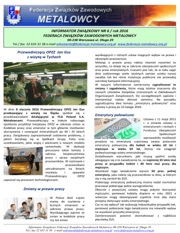 INFORMATOR ZWIĄZKOWY NR 6 / rok 2016 FEDERACJI ZWIĄZKÓW ZAWODOWYCH METALOWCY 00-238 Warszawa ul. Długa 29 Tel./ fax 22 635 31 38 e-mail [email protected] www.federacja-metalowcy.org.pl Przewodniczący OPZZ Jan Guz z wizytą w Tychach W dniu 8 stycznia 2016 Przewodniczący OPZZ Jan Guz przebywający z wizytą na Śląsku spotkał się z przedstawicielami działającymi w FCA Poland S.A. Metalowcami. Przewodniczący w trakcie roboczego spotkania przybliżył inicjatywy OPZZ w zakresie zmian w Kodeksie pracy oraz emerytur w tym głównie możliwości skorzystania z rozwiązań emerytalnych po 40 i 35 latach pracy. Związkowcy zaprezentowali codzienne problemy, z jakimi borykają się w Spółkach Grupy Fiata oraz oczekiwaniami, jakie wiążą z wieściami o nowym modelu samochodu. W dyskusji poruszano także tematy z zakresu bezpieczeństwa pracy i spraw socjalnych pracowników. W rozmowie z pracownikami zatrudnionymi na liniach montażu i spawalni Przewodniczący OPZZ zapoznał się procesem technologicznym. Zmiany w prawie pracy W Polsce dość często mamy do czynienia z licznych zmianami w zakresie prawa pracy. Wynikającego wprost ze zmian w kodeksie pracy czy też zmian wynikających z różnych ustaw mających wpływ na prawa i obowiązki pracownicze. Mówiąc o prawie pracy należy również rozumieć to wszystko, co dzieje się w zakresie ubezpieczeń społecznych oraz praw emerytalnych. Czasami jest tak, że w toku zajęć dnia codziennego wiele istotnych zamian ucieka naszej uwadze lub też różne instytucje publiczne nie prowadzą szerokiej kampanii informacyjnej. W naszym Informatorze zamierzamy sygnalizować te zmiany i zagadnienia, które mają istotne znaczenia dla naszych członków Związków zrzeszonych w Zakładowych Organizacjach Związkowych. Do szczegółowych zapisów i interpretacji należy dotrzeć samemu. Na początku sygnalizujemy dwa tematy „emerytury połowiczne” oraz umowy o pracę po 22 lutego 2016. Emerytury połowiczne Ustawa z 11 maja 2012 r. o zmianie ustawy o emeryturach i rentach z Funduszu Ubezpieczeń Społecznych wprowadziła możliwość przejścia na emeryturę częściową zwana potocznie emeryturą połowiczną dla kobiet w wieku 62 lat i mężczyzn w wieku 65 lat, którzy nie osiągnęli podwyższonego wieku emerytalnego. Dodatkowym warunkiem, jaki muszą spełnić osoby ubiegające się o to świadczenie to, co najmniej 35 letni staż pracy w przypadku kobiet i 40 letni staż pracy dla mężczyzn. Wysokość tego świadczenia wynosi 50 proc. pełnej emerytury, jaka należy się pracownikowi w dniu, w którym się o nią zwrócił do ZUS. Pobierając emeryturę połowiczną można nadal normalnie pracować pobierając pełne wynagrodzenie. Obecnie z powyższej ustawy mogą jedynie skorzystać mężczyźni, ponieważ kobiety dopiero w roku 2021 a wówczas mogą obowiązywać zupełnie inne oby stare przepisy dotyczące wieku emerytalnego. Czy to się opłaca? Jak wskazują indywidualne przypadki tak, ponieważ pobieranie tego świadczenia ma niewielki wpływ na wysokość przyszłej emerytury. Zainteresowani powinni skontaktować z najbliższa placówką ZUS. --------------------------------------------------------------------------------------------------------------------------------------------------------------------------Informator Związkowy Federacji Związków Zawodowych Metalowcy 00-238 Warszawa ul. Długa 29 Tel./ fax 22 635 31 38 e-mail [email protected] www.federacja-metalowcy.org.pl Umowy o pracę po 22 lutego 2016 W tym dniu zamieniają się zapisy art. 25(1) par. 1 Kodeksu pracy – mówiący o okresach zatrudnienia na podstawie umowy o pracę na czas określony, który nie może przekraczać 33 miesięcy, a łączna liczba tych umów nie może przekraczać trzech. Po tym okresie umowa o pracę zawarta pomiędzy tym samymi stronami stosunku pracy z automatu przekształci się w umowę o pracę na czas nieokreślony. W ten sposób nie powinno dochodzić do absurdów, że umowy o pracę na czas określony są zawierane na bardzo długi czas np. 5, 10 czy 15 lat. Kolejną ważną zmianą warunków zatrudnienia na czas określony jest odejście od krótkiego, zawsze 2 tygodniowego okresu wypowiedzenia umowy na czas określony. W miejsce tego krótkiego i wygodne dla pracodawcy wypowiedzenia, zastosowanie znajdą przepisy dotyczące okresów wypowiedzenia umowy na czas nieokreślony i zgodnie z art. 36 K.p. będą one wynosić: • 2 tygodnie - przy zatrudnieniu w danym zakładzie poniżej 6 miesięcy, • 1 miesiąc - przy stażu zakładowym wynoszącym, co najmniej 6 miesięcy, • 3 miesiące - przy zatrudnieniu w danym zakładzie, przez co najmniej 3 lata. Powyższe zamiany powinny korzystnie wpłynąć na rynek pracy i stabilizację zatrudnienia. Rada Federacji Związków Zawodowych METALOWCY 16 12 2015 W dniu 16 grudnia 2015 w siedzibie Federacji obradowała Rada Federacji. Posiedzeniu przewodniczył kol. Romuald Wojtkowiak. Członkowie Rady zostali zapoznani z przebiegiem remontów budynków w Skarżysku Kamiennym i w Warszawie. Rada przyjęła uchwały dotyczące funkcjonowania Federacji oraz o ewentualnej realizacji kolejnych projektów unijnych „Przemysł i struktury negocjacyjne” i „Bardziej efektywne społeczeństwo obywatelskie „ ( realizacja 2016 – 2017). Rada zdecydowała, że przyszłoroczny Ogólnopolski Dzień Metalowca zostanie zorganizowany przez Radę Okręgu Opole w dniach 21-23 kwietnia 2015 w miejscowości Jarnołtówek. Zarząd Federacji poinformował o zorganizowaniu przez Federacje kolejnego szkolenia dla członków Federacji w dniach 18-19 luty 2016 w Warszawie ( szczegóły zaprezentują Szefowie Okręgów na spotkaniach okręgowych, informacja będzie również dostępna na naszej stronie internetowej) W trakcie dyskusji Rada podsumowała mijający rok w kontekście tegorocznych wyborów parlamentarnych i zapowiadanych przez Rząd zmian. Na zakończenie Rady uczestnicy łamiąc się trady