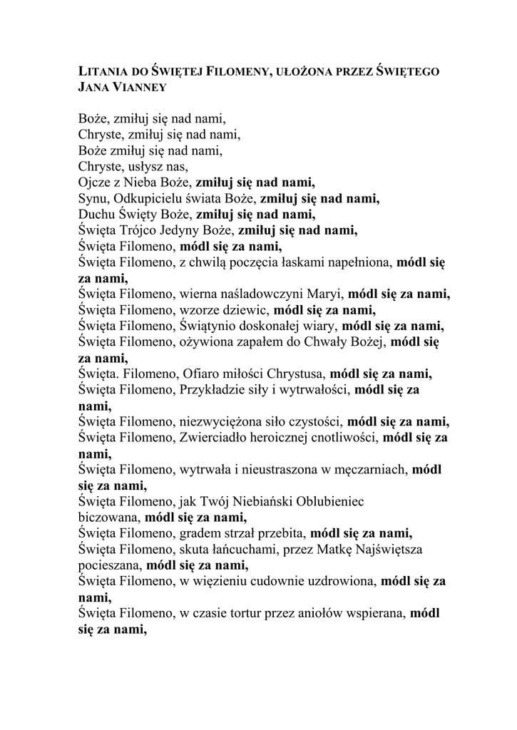 LITANIA DO ŚWIĘTEJ FILOMENY, UŁOŻONA PRZEZ ŚWIĘTEGO JANA VIANNEY Boże, zmiłuj się nad nami, Chryste, zmiłuj się nad nami, Boże zmiłuj się nad nami, Chryste, usłysz nas, Ojcze z Nieba Boże, zmiłuj się nad nami, Synu, Odkupicielu świata Boże, zmiłuj się nad nami, Duchu Święty Boże, zmiłuj się nad nami, Święta Trójco Jedyny Boże, zmiłuj się nad nami, Święta Filomeno, módl się za nami, Święta Filomeno, z chwilą poczęcia łaskami napełniona, módl się za nami, Święta Filomeno, wierna naśladowczyni Maryi, módl się za nami, Święta Filomeno, wzorze dziewic, módl się za nami, Święta Filomeno, Świątynio doskonałej wiary, módl się za nami, Święta Filomeno, ożywiona zapałem do Chwały Bożej, módl się za nami, Święta. Filomeno, Ofiaro miłości Chrystusa, módl się za nami, Święta Filomeno, Przykładzie siły i wytrwałości, módl się za nami, Święta Filomeno, niezwyciężona siło czystości, módl się za nami, Święta Filomeno, Zwierciadło heroicznej cnotliwości, módl się za nami, Święta Filomeno, wytrwała i nieustraszona w męczarniach, módl się za nami, Święta Filomeno, jak Twój Niebiański Oblubieniec biczowana, módl się za nami, Święta Filomeno, gradem strzał przebita, módl się za nami, Święta Filomeno, skuta łańcuchami, przez Matkę Najświętsza pocieszana, módl się za nami, Święta Filomeno, w więzieniu cudownie uzdrowiona, módl się za nami, Święta Filomeno, w czasie tortur przez aniołów wspierana, módl się za nami, Święta Filomeno, która wybrałaś mękę i śmierć nad wspaniałości tronu królewskiego, módl się za nami, Święta Filomeno, która nawróciłaś świadków swego męczeństwa, módl się za nami, Święta Filomeno, która znosiłaś furię swoich oprawców, módl się za nami, Święta Filomeno, Opiekunko niewinnych, módl się za nami, Święta Filomeno, Patronko młodzieży, módl się za nami, Święta Filomeno, Ucieczko nieszczęśliwych, módl się za nami, Święta Filomeno, Zdrowie chorych i słabych, módl się za nami, Święta Filomeno, nowe Światło Kościoła Walczącego, módl się za nami, Święta Filomeno, która zwalczasz bezbożność świata, módl się za nami, Święta Filomeno, która przywracasz wiarę i dajesz odwagę jej wyznawania, módl się za nami, Święta Filomeno, której imię sławione jest w niebie, a straszne dla piekieł, módl się za nami, Święta Filomeno, wspaniałymi cudami sławiona, módl się za nami, Święta Filomeno, mocą Bożą wzmocniona, módl się za nami, Święta Filomeno, panująca w chwale, módl się za nami, Święta Filomeno, patronko Dzieci Maryi, módl się za nami, Święta Filomeno, patronko Żywego Różańca, módl się za nami, Baranku Boży, który gładzisz grzechy świata, zachowaj nas Panie. Baranku Boży, który gładzisz grzechy świata, wysłuchaj nas Panie. Baranku Boży, który gładzisz grzechy świata, zmiłuj się nad nami. K. Módl się za nami Św. Filomeno. W. Abyśmy się stali godnymi obietnic Chrystusowych. Módlmy się: Błagamy Cię, Panie, przez wstawiennictwo Świętej Filomeny, Dziewicy i Męczennicy, zawsze Ci miłej przez jej nieskalaną czystość i praktykowanie wszelkich cnót, przebacz nam grzechy nasze i udziel nam łask nam potrzebnych (nazwij łaskę, której specjalnie potrzebujesz). Amen.