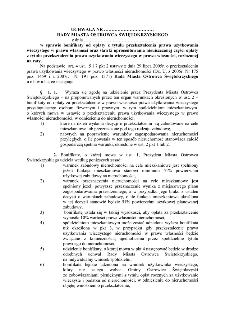 UCHWAŁA NR …………………………… RADY MIASTA OSTROWCA ŚWIĘTOKRZYSKIEGO z dnia ………………………………………. w sprawie bonifikaty od opłaty z tytułu przekształcenia prawa uŜytkowania wieczystego w prawo własności oraz stawki oprocentowania nieuiszczonej części opłaty z tytułu przekształcenia prawa uŜytkowania wieczystego w prawo własności, rozłoŜonej na raty. Na podstawie art. 4 ust. 5 i 7 pkt 2 ustawy z dnia 29 lipca 2005r. o przekształceniu prawa uŜytkowania wieczystego w prawo własności nieruchomości (Dz. U. z 2005r. Nr 175 poz. 1459 i z 2007r. Nr 191 poz. 1371) Rada Miasta Ostrowca Świętokrzyskiego u c h w a l a, co następuje: § 1. 1. WyraŜa się zgodę na udzielenie przez Prezydenta Miasta Ostrowca Świętokrzyskiego – na proponowanych przez ten organ warunkach określonych w ust. 2 – bonifikaty od opłaty za przekształcenie w prawo własności prawa uŜytkowania wieczystego przysługującego osobom fizycznym i prawnym, w tym spółdzielniom mieszkaniowym, o których mowa w ustawie o przekształceniu prawa uŜytkowania wieczystego w prawo własności nieruchomości, w odniesieniu do nieruchomości: 1) które na dzień wydania decyzji o przekształceniu są zabudowane na cele mieszkaniowe lub przeznaczone pod tego rodzaju zabudowę, 2) nabytych na poprawienie warunków zagospodarowania nieruchomości przyległych, o ile powstała w ten sposób nieruchomość stanowiąca całość gospodarczą spełnia warunki, określone w ust. 2 pkt 1 lub 2. 2. Bonifikaty, o której mowa w ust. 1, Prezydent Miasta Ostrowca Świętokrzyskiego udziela według poniŜszych zasad: 1) warunek zabudowy nieruchomości na cele mieszkaniowe jest spełniony jeŜeli funkcja mieszkaniowa stanowi minimum 51% powierzchni uŜytkowej zabudowy na nieruchomości, 2) warunek przeznaczenia nieruchomości na cele mieszkaniowe jest spełniony jeŜeli powyŜsze przeznaczenie wynika z miejscowego planu zagospodarowania przestrzennego, a w przypadku jego braku z ustaleń decyzji o warunkach zabudowy, o ile funkcja mieszkaniowa określona w tej decyzji stanowić będzie 51% powierzchni uŜytkowej planowanej zabudowy, 3) bonifikatę ustala się w takiej wysokości, aby opłata za przekształcenie wynosiła 10% wartości prawa własności nieruchomości, 4) spółdzielniom mieszkaniowym moŜe zostać udzielona wyŜsza bonifikata niŜ określona w pkt 3, w przypadku gdy przekształcenie prawa uŜytkowania wieczystego nieruchomości w prawo własności będzie związane z koniecznością ujednolicenia przez spółdzielnie tytułu prawnego do nieruchomości, 5) udzielenie bonifikaty, o której mowa w pkt 4 następować będzie w drodze odrębnych uchwał Rady Miasta Ostrowca Świętokrzyskiego, na indywidualny wniosek spółdzielni, 6) bonifikata będzie udzielona na wniosek uŜytkownika wieczystego, który nie zalega wobec Gminy Ostrowiec Świętokrzyski ze zobowiązaniami pienięŜnymi z tytułu opłat rocznych za uŜytkowanie wieczyste i podatku od nieruchomości, w odniesieniu do nieruchomości objętej wnioskiem o przekształcenie, 7) 8) w przypadku wielofunkcyjnego wykorzystywania nieruchomości, bonifikaty udziela się proporcjonalnie do powierzchni uŜytkowej zabudowy wykorzystywanej lub przeznaczonej wyłącznie na cele mieszkaniowe, termin składania wniosków o udzielenie bonifikaty upływa wraz z ustawowym terminem składania wniosków o przekształcenie. § 2. WyraŜa się zgodę na oprocentowanie nieuiszczonej części opłaty rozłoŜonej na raty zgodnie z art. 4 ust. 3 ustawy o przekształceniu prawa uŜytkowania wieczystego w prawo własności, przy zastosowaniu stopy procentowej równej stopie referencyjnej ustalanej przez Komisję Europejską i publikowanej w Dzienniku Urzędowym Wspólnot Europejskich. § 3. 1. Bonifikaty określone w § 1 stosuje się w postępowaniach prowadzonych w trybie przepisów ustawy o przekształceniu prawa uŜytkowania wieczystego w prawo własności, które do dnia wejścia w Ŝycie niniejszej uchwały nie zostały zakończone decyzją ostateczną, z zastrzeŜeniem ust. 2. 2. Bonifikaty określonej w § 1 pkt 3 nie stosuje się w przypadku, gdy osoby fizyczne wystąpią z wnioskiem o udzielenie bonifikaty określonej w art. 4 ust. 8 – 9 ustawy o przekształceniu prawa uŜytkowania wieczystego w prawo własności. § 4. Traci moc uchwała Rady Miasta Ostrowca Św. Nr XLIX/536/2006 z dnia 10 lutego 2006r. w sprawie udzielenia bonifikaty od opłaty z tytułu przekształcenia prawa uŜytkowania wieczystego w prawo własności. § 5. Wykonanie Świętokrzyskiego. uchwały powierza się Prezydentowi Miasta Ostrowca § 6. Uchwała podlega ogłoszeniu na tablicy ogłoszeń w siedzibie Urzędu Miasta Ostrowca Świętokrzyskiego, na stronach internetowych Urzędu Miasta Ostrowca Świętokrzyskiego i w prasie lokalnej. § 7. Uchwała wchodzi w Ŝycie z dniem podjęcia. Uzasadnienie Z dniem 01 stycznia 2008 roku znowelizowana została ustawa z dnia 29 lipca 2005 roku wieczystego w prawo własności o przekształceniu prawa uŜytkowania (Dz. U. z 2005r. Nr 175 poz. 1459). Zmieniły się między innymi przepisy stanowiące podstawę prawną uchwały nr XLIX/536/2006 Rady Miasta Ostrowca Świętokrzyskiego z dnia 10 lutego 2006r. w sprawie udzielenia bonifikaty od opłat z tytułu przekształcenia prawa uŜytkowania wieczystego w prawo własności. W związku z powyŜszym Prezydent Miasta Ostrowca Świętokrzyskiego nie moŜe obecnie udzielać wynikającej z w/w uchwały bonifikaty od opłat za przekształcenie. Nadmienić naleŜy, iŜ na podstawie powyŜszej uchwały bonifikata ustalana była w takiej wysokości, aby opłata za przekształcenie wynosiła 10% wartości prawa własności nieruchomości. Ponadto spółdzielnie mieszkaniowe, w przypadku przekształceń prawa uŜytkowania wieczystego w prawo własności nieruchomości, związanych z koniecznością ujednolicenia tytułu prawnego do nieruchomości mogły uzyskać bonifikat