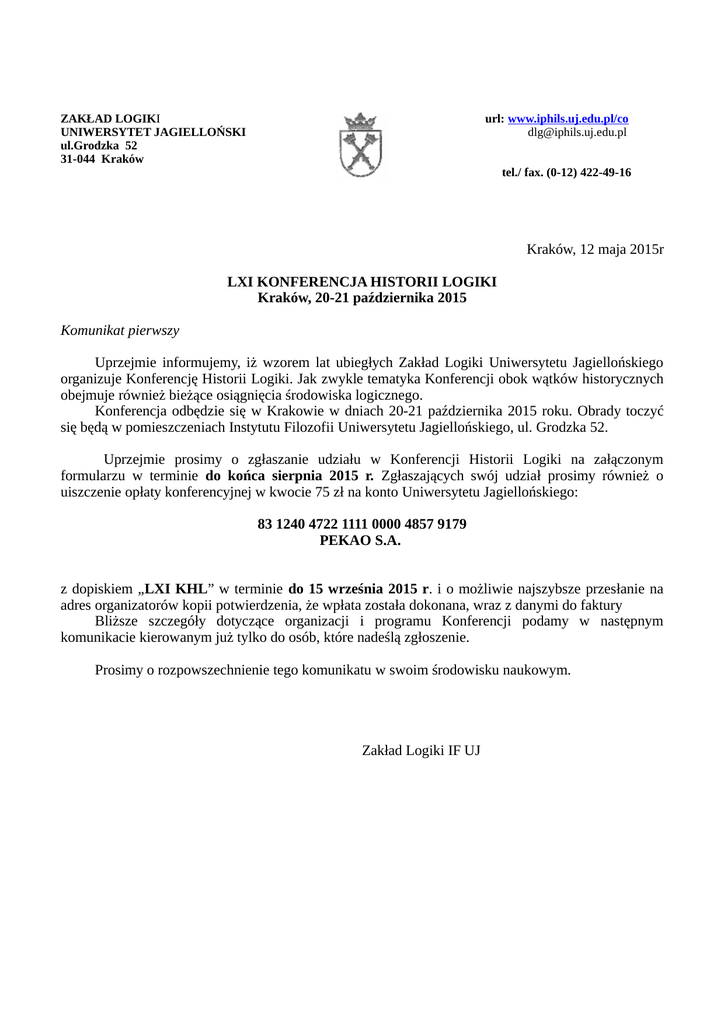Kraków, 12 maja 2015r LXI KONFERENCJA HISTORII LOGIKI