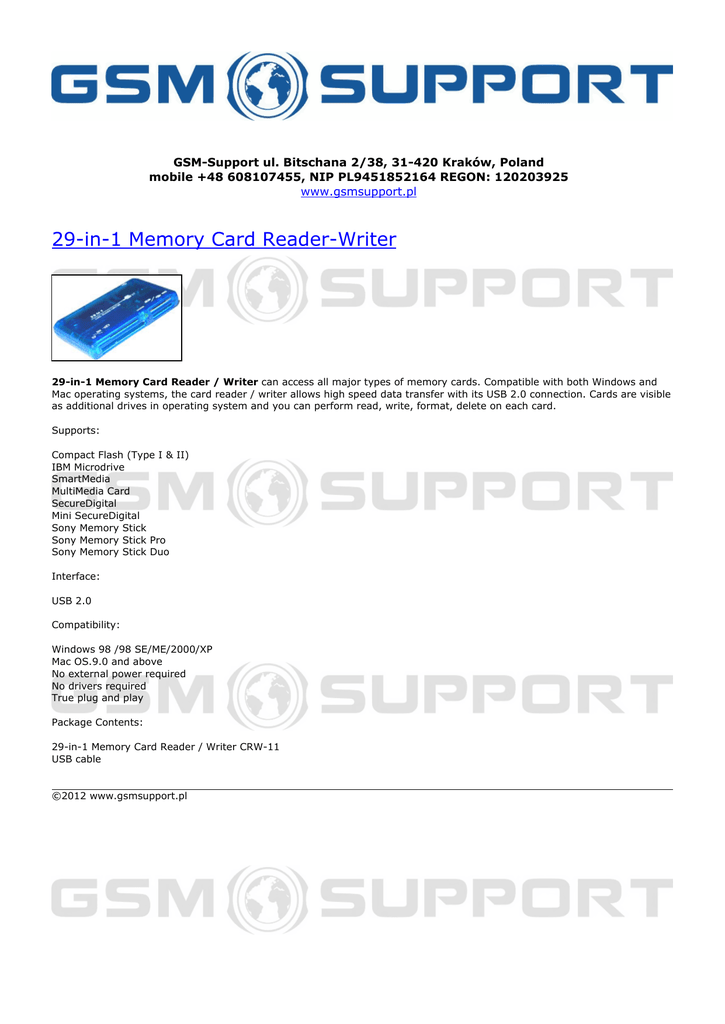 GSM-Support ul. Bitschana 2/38, 31-420 Kraków, Poland mobile +48 608107455, NIP PL9451852164 REGON: 120203925 www.gsmsupport.pl 29-in-1 Memory Card Reader-Writer 29-in-1 Memory Card Reader / Writer can access all major types of memory cards. Compatible with both Windows and Mac operating systems, the card reader / writer allows high speed data transfer with its USB 2.0 connection. Cards are visible as additional drives in operating system and you can perform read, write, format, delete on each card. Supports: Compact Flash (Type I & II) IBM Microdrive SmartMedia MultiMedia Card SecureDigital Mini SecureDigital Sony Memory Stick Sony Memory Stick Pro Sony Memory Stick Duo Interface: USB 2.0 Compatibility: Windows 98 /98 SE/ME/2000/XP Mac OS.9.0 and above No external power required No drivers required True plug and play Package Contents: 29-in-1 Memory Card Reader / Writer CRW-11 USB cable ©2012 www.gsmsupport.pl Powered by TCPDF (www.tcpdf.org)