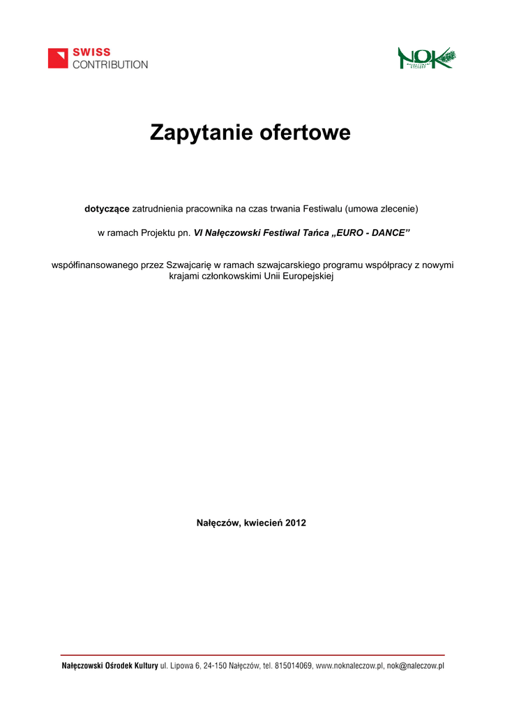 Zapytanie ofertowe dotyczące zatrudnienia pracownika na czas trwania Festiwalu (umowa zlecenie) w ramach Projektu pn. VI Nałęczowski Festiwal Tańca „EURO - DANCE” współfinansowanego przez Szwajcarię w ramach szwajcarskiego programu współpracy z nowymi krajami członkowskimi Unii Europejskiej Nałęczów, kwiecień 2012 PRZEDMIOT ZAMÓWIENIA 1. Przedmiotem zamówienia jest zatrudnienie osoby na czas trwania VI Nałęczowskiego Festiwalu Tańca „EURO – DANCE” (umowa zlecenie). Zatrudniona osoba będzie pracowała przy organizacji Festiwalu w dniach od 22 czerwca do 24 czerwca zgodnie z przygotowanym zakresem obowiązków. TERMIN WYKONANIA ZAMÓWIENIA od 22 czerwca 2012 roku do 24 czerwca 2012 roku INFORMACJA O OŚWIADCZENIACH I DOKUMENTACH, JAKIE MAJĄ DOSTARCZYĆ WYKONAWCY Ofertę należy sporządzić na formularzu ofertowym w kolorze, którego wzór stanowi Załącznik nr 1 do Zapytania Ofertowego wraz z niezbędnymi Załącznikami, takimi jak: a. Oświadczenie, że Wykonawca posiada niezbędną wiedzę i doświadczenie oraz dysponuje potencjałem technicznym i osobami zdolnymi do wykonania zamówienia; Uwaga: Formularz ofertowy i oświadczenia muszą być przedstawione w formie oryginału w kolorze i podpisane przez upoważnionego przedstawiciela Wykonawcy. OSOBA UPRAWNIONA DO POROZUMIEWANIA SIĘ Z WYKONAWCAMI Osoba do kontaktu: Małgorzata Weszka Tel: 81 50 14 069; fax 81 50 14 069; e-mail: [email protected] OPIS SPOSOBU PRZYGOTOWANIA OFERTY Oferta musi mieć formę pisemną i być sporządzona w języku polskim. Oferta powinna zawierać: - imię, nazwisko, firmę, nazwę i dokładny adres Wykonawcy, datę sporządzenia oferty oraz imię i nazwisko osoby uprawnionej do reprezentowania Wykonawcy; - wszystkie wymagane w niniejszym Zapytaniu Ofertowym dokumenty, oświadczenia i załączniki; - własnoręczny podpis wykonawcy bądź osób mających prawo zaciągać zobowiązania w jego imieniu. Ofertę należy umieścić w zamkniętej, zapieczętowanej kopercie. Koperta powinna być oznaczona następująco: Oferta na zapytanie dotyczące zatrudnienia pracownika na czas trwania Festiwalu (umowa zlecenie) w ramach Projektu pn. VI Nałęczowski Festiwal Tańca „EURO-DANCE” Adres: Nałęczowski Ośrodek Kultury ul. Lipowa 6, 24-150 Nałęczów MIEJSCE ORAZ TERMIN SKŁADANIA OFERT Ofertę należy złożyć na piśmie do dnia 4 maja 2012, do godz. 15.00 w Nałęczowskim Ośrodku Kultury ul. Lipowa 6, 24-150 Nałęczów. OPIS KRYTERIÓW, KTÓRYMI ZAMAWIAJĄCY BĘDZIE KIEROWAŁ SIĘ PRZY WYBORZE OFERTY, WRAZ Z PODANIEM ZNACZENIA TYCH KRYTERIÓW Zamawiający przyzna kontrakt Wykonawcy który zaoferował najkorzystniejszą cenę i posiada odpowiednie doświadczenie oraz brał udział w przygotowaniu tego typu imprez. Zamawiający: Nałęczowski Ośrodek Kultury ul. Lipowa 6 24-50 Nałęczów OFERTA na zatrudnienie pracownika na czas trwania Festiwalu (umowa zlecenie) w ramach Projektu VI Nałęczowski Festiwal Tańca „EURO – DANCE” współfinansowanego przez Szwajcarię w ramach szwajcarskiego programu współpracy z nowymi krajami członkowskimi Unii Europejskiej. Dane dotyczące oferenta: Nazwa................................................................................................................ Siedziba............................................................................................................. Nr telefonu/faksu................................................................................................ NIP: …………………………………………………………………………….......... Oferujemy realizację całości zamówienia zgodnie z Zapytaniem Ofertowym za cenę ............................ netto (słownie ............................... zł) cena brutto ..................................... (słownie ..................... zł) w tym podatek VAT w wysokości: .............% tj. .............................................. zł. Oświadczamy, że oferowana cena za całość zamówienia zawiera wszystkie koszty związane z realizacją przedmiotu zamówienia. Oświadczamy, że zapoznaliśmy się z treścią zapytania i nie wnosimy do niej zastrzeżeń. Oświadczamy, że posiadamy niezbędną wiedzę i doświadczenie oraz dysponujemy potencjałem technicznym i osobami zdolnymi do wykonania zamówienia. Data ................................ ………………………………………….. (podpis upoważnionego przedstawiciela oferenta)