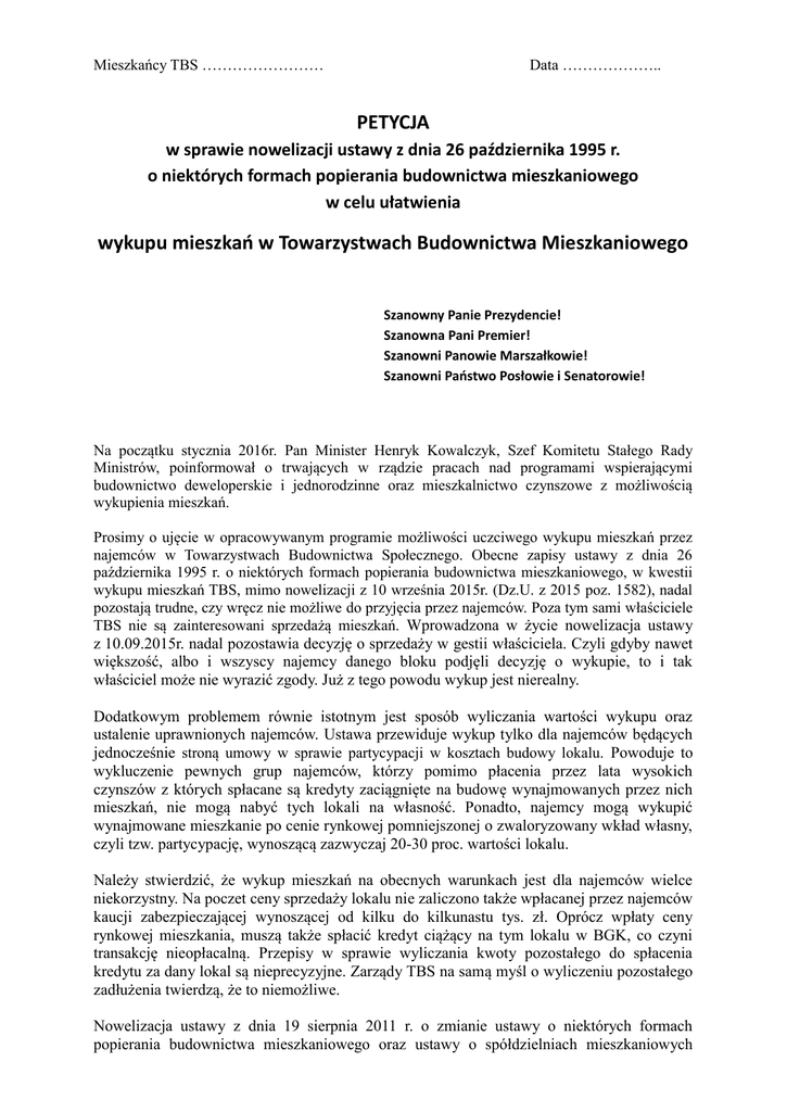 Mieszkańcy TBS …………………… Data ……………….. PETYCJA w sprawie nowelizacji ustawy z dnia 26 października 1995 r. o niektórych formach popierania budownictwa mieszkaniowego w celu ułatwienia wykupu mieszkań w Towarzystwach Budownictwa Mieszkaniowego Szanowny Panie Prezydencie! Szanowna Pani Premier! Szanowni Panowie Marszałkowie! Szanowni Państwo Posłowie i Senatorowie! Na początku stycznia 2016r. Pan Minister Henryk Kowalczyk, Szef Komitetu Stałego Rady Ministrów, poinformował o trwających w rządzie pracach nad programami wspierającymi budownictwo deweloperskie i jednorodzinne oraz mieszkalnictwo czynszowe z możliwością wykupienia mieszkań. Prosimy o ujęcie w opracowywanym programie możliwości uczciwego wykupu mieszkań przez najemców w Towarzystwach Budownictwa Społecznego. Obecne zapisy ustawy z dnia 26 października 1995 r. o niektórych formach popierania budownictwa mieszkaniowego, w kwestii wykupu mieszkań TBS, mimo nowelizacji z 10 września 2015r. (Dz.U. z 2015 poz. 1582), nadal pozostają trudne, czy wręcz nie możliwe do przyjęcia przez najemców. Poza tym sami właściciele TBS nie są zainteresowani sprzedażą mieszkań. Wprowadzona w życie nowelizacja ustawy z 10.09.2015r. nadal pozostawia decyzję o sprzedaży w gestii właściciela. Czyli gdyby nawet większość, albo i wszyscy najemcy danego bloku podjęli decyzję o wykupie, to i tak właściciel może nie wyrazić zgody. Już z tego powodu wykup jest nierealny. Dodatkowym problemem równie istotnym jest sposób wyliczania wartości wykupu oraz ustalenie uprawnionych najemców. Ustawa przewiduje wykup tylko dla najemców będących jednocześnie stroną umowy w sprawie partycypacji w kosztach budowy lokalu. Powoduje to wykluczenie pewnych grup najemców, którzy pomimo płacenia przez lata wysokich czynszów z których spłacane są kredyty zaciągnięte na budowę wynajmowanych przez nich mieszkań, nie mogą nabyć tych lokali na własność. Ponadto, najemcy mogą wykupić wynajmowane mieszkanie po cenie rynkowej pomniejszonej o zwaloryzowany wkład własny, czyli tzw. partycypację, wynoszącą zazwyczaj 20-30 proc. wartości lokalu. Należy stwierdzić, że wykup mieszkań na obecnych warunkach jest dla najemców wielce niekorzystny. Na poczet ceny sprzedaży lokalu nie zaliczono także wpłacanej przez najemców kaucji zabezpieczającej wynoszącej od kilku do kilkunastu tys. zł. Oprócz wpłaty ceny rynkowej mieszkania, muszą także spłacić kredyt ciążący na tym lokalu w BGK, co czyni transakcję nieopłacalną. Przepisy w sprawie wyliczania kwoty pozostałego do spłacenia kredytu za dany lokal są nieprecyzyjne. Zarządy TBS na samą myśl o wyliczeniu pozostałego zadłużenia twierdzą, że to niemożliwe. Nowelizacja ustawy z dnia 19 sierpnia 2011 r. o zmianie ustawy o niektórych formach popierania budownictwa mieszkaniowego oraz ustawy o spółdzielniach mieszkaniowych miała umożliwić kilkusettysięcznej grupie najemców i partycypantów wykup na własność wynajmowanych mieszkań. Po czterech latach od wejścia ustawy w życie, wykup mieszkań w TBS praktycznie nie istnieje. Mimo petycji najemców TBS z lutego 2015 roku podpisanej przez 1751 osób (zorganizowanej przez portal www.tbs24.pl) pragnących ułatwienia wykupu mieszkań nowelizacja z 10.09.2015r nie rozwiązała jednak naszych problemów. Dlatego też przypominamy o tej petycji i uszczegółowiamy prośbę proponując następujące rozwiązanie, które winno zachęcić do wykupu mieszkań: 1. Przeniesienie własności lokalu mieszkalnego przez towarzystwo budownictwa społecznego może nastąpić, na rzecz każdego najemcy bez względu na to, czy był stroną umowy w sprawie partycypacji w kosztach budowy tego lokalu. 2. Właściciel mieszkań za każdym razem wyraża zgodę na sprzedaż mieszkania najemcy po wyliczeniu i wpłaceniu kwoty zadłużenia kredytowego przypadającego na dany lokal. 3. Kwotę tego zadłużenia proponujemy liczyć w następujący sposób: a. Przyjąć jako podstawę do obliczenia kwoty zadłużenia wartość lokalu z dnia podpisania umowy najmu przez pierwszego najemcę lokalu, nawet jeżeli składający wniosek o wykup jest kolejnym najemcą. Propozycja ta wynika z faktu, że kredyt na mieszkanie był spłacany także przez poprzednich najemców. b. Jeżeli wartość lokalu nie uwzględniała kosztu działki proporcjonalnie przypadającego na lokal, to dodać do tej wartości, ten koszt z dnia podpisania pierwszej umowy najmu na dany lokal. W sytuacji konieczności ustalenia wartości działki i podziału tej wartości pomiędzy poszczególne lokale winna istnieć możliwość powołania biegłego na koszt TBS lub wniosek zainteresowanych wykupem najemców TBS, tak aby można było koszt usługi biegłego podzielić proporcjonalnie pomiędzy zainteresowanych wykupem. c. Od tak ustalonej wartości lokalu odjąć koszt kaucji i partycypacji, jeżeli miała miejsce, ustalając w ten sposób sumę zadłużenia na dzień podpisania umowy najmu pierwszego najemcy. d. Dla sumy zadłużenia obliczyć wartość kredytu pozostającego do spłaty z uwzględnieniem, comiesięcznych spłat rat kapitałowo-odsetkowych wchodzących w skład opłaty czynszowej. e. Ze względu na możliwe problemy i utrudnienia ze strony właścicieli TBS proponujemy, aby nowelizacja ustawy: i. zawierała wzór arkusza kalkulacyjnego generującego takie obliczenia, ii. ustalała procentowy udział wartości rat kapitałowo-odsetkowych w wysokości płaconego czynszu w poszczególnych latach. 4. Dla najemców, którzy wykupili mieszkanie w ustawie winien znajdować się też zapis regulujący wysokość czynszu dla mieszkań wykupionych. Czynsz ten winien obejmować tylko pokrycie kosztów eksploatacji i remontów. Zapis ten winien chronić najemców, którzy wykupili lokale, przed stosowaniem przez TBS’y zawyżonych stawek czynszu, w których mogłyby być ukryte nadal koszty spłacania pr