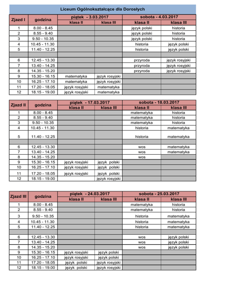 Liceum Ogólnokształcące dla Dorosłych piątek - 3.03.2017 sobota - 4.03.2017 klasa II klasa III Zjazd I godzina 1 2 3 4 5 8.00 - 8.45 8.55 - 9.40 9.50 - 10.35 10.45 - 11.30 11.40 - 12.25 język polski język polski język polski historia historia historia historia historia język polski język polski 6 7 8 9 10 11 12 12.45 - 13.30 13.40 - 14.25 14.35 - 15.20 15.30 - 16.15 16.25 - 17.10 17.20 - 18.05 18.15 - 19.00 przyroda przyroda przyroda język rosyjski język rosyjski język rosyjski Zjazd II godzina 1 2 3 4 8.00 - 8.45 8.55 - 9.40 9.50 - 10.35 10.45 - 11.30 matematyka matematyka matematyka historia historia historia historia matematyka 5 11.40 - 12.25 historia matematyka 6 7 8 9 10 12.45 - 13.30 13.40 - 14.25 14.35 - 15.20 15.30 - 16.15 16.25 - 17.10 wos wos wos matematyka matematyka 11 12 17.20 - 18.05 18.15 - 19.00 Zjazd III godzina 1 2 8.00 - 8.45 8.55 - 9.40 matematyka matematyka historia historia 3 9.50 - 10.35 historia matematyka 4 5 10.45 - 11.30 11.40 - 12.25 historia historia matematyka matematyka 6 7 8 9 10 11 12 12.45 - 13.30 13.40 - 14.25 14.35 - 15.20 15.30 - 16.15 16.25 - 17.10 17.20 - 18.05 18.15 - 19.00 wos wos wos język polski język polski język polski klasa II matematyka matematyka język rosyjski język rosyjski klasa III język rosyjski język rosyjski matematyka matematyka piątek - 17.03.2017 klasa II klasa III język rosyjski język rosyjski język polski język polski język rosyjski język polski język rosyjski piątek - 24.03.2017 klasa II klasa III język rosyjski język rosyjski język polski język polski język polski język polski język rosyjski język rosyjski sobota - 18.03.2017 klasa II klasa III sobota - 25.03.2017 klasa II klasa III