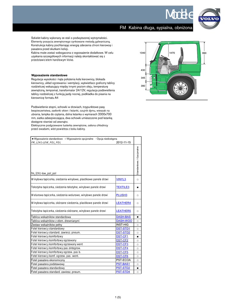 Modele przedstawicielem handlowym Volvo. przed owadami, wlot powietrza z boku kabiny. □ 2012-11-15 Standardowe / Opcjonalne ■ FM_L2H1-LOW_POL_POL fm_l2h1-low_pol_pol Winylowa tapicerka, siedzenia winylowe, plastikowe panele drzwi VINYL3 □ Tekstylna tapicerka, siedzenia tekstylne, winylowe panele drzwi TEXTILE3 ■ Welurowa tapicerka, siedzenia welurowe, winylowe panele drzwi PLUSH3 □ Winylowa tapicerka, skórzane siedzenia, plastikowe panele drzwi LEATHER4 □ Tekstylna tapicerka, siedzenia skórzane, winylowe panele drzwi LEATHER5 □ DASH-BAS DASH-WOO INST-HIG DST-STD1 DST-STD2 DST-CF1 DST-CF2 DST-CF3 DST-CF4 DST-CF5 DST-CF6 PST-ECOA PST-BAS1 PST-STD2 PST-STD4 ■ □ □ □ □ ■ □ □ □ □ □ □ □ ■ □ Fotel kierowcy standardowy Fotel kierowcy standard. zawiesz. pneum. Fotel kierowcy komfortowy Fotel kierowcy komfortowy ogrzewany Fotel kierowcy komfortowy ogrzewany went Fotel kierowcy komfortowy pas zintegrow. Fotel kierowcy komfortowy ogrzew. pas b. Fotel kierowcy komf. ogrzew. pas went. 1 (5) ■ □ 2012-11-15 Standardowe / Opcjonalne FM_L2H1-LOW_POL_POL Schowek na tunelu silnika, przód Schowek na tunelu silnika, bok Schowki na tunelu silnika przód-bok Dwie regulowane lampki do czytania Klimatyzacja manualna Klimatyzacja automatyczna Klimatyzacja manualna. Parkingowe ogrzewanie kabiny i silnika Parkingowe ogrzewanie kabiny Postojowy ogrzewacz kabiny Podgrzewanie bloku silnika 220V/1,5kW Bez wywietrznika dachowego Szyby barwione Centralny zamek z pilotem kierowcy Pakiet Audio Basic Pakiet Audio Medium Pakiet Audio Medium Plus Pakiet Audio Advanced PST-CF1 PST-CF2 PST-CF4 PST-CF5 ARMRE-DB ARMRE-PB ARMRE-BB BUNK70 MATL-SO MATL-SF MATL-FI MATL-FI2 OLMAT-BA OLMAT-PR SAFE ETSB-F ETSB-S ETSB-FS REF-IC19 INLI-NL ARL-FLX1 SWIND-PS COFMA-PK CU-MCC CU-ECC CU-ACMAN PH-ENGCA PH-CAB PH-SS SLCP-LUX 220EBH15 URHATCH GLAS-TIN AWIND-RF WLIFT-EB LOCK-MRP LOCK-REM LOCK-ALL GAUGE-AM □ □ □ □ □ □ □ ■ ■ □ □ □ □ □ □ □ □ □ □ □ □ □ □ □ □ □ □ □ □ □ □ ■ ■ □ ■ □ □ □ □ ISUNF-MD □ AUDPREP AUDBAS AUDMED AUDMED+ AUDADV ■ □ □ □ □ 2 (5) ■ □ 2012-11-15 Aktywny tempomat Tempomat I-cruise ACC CRUIS-S LCS FMS-PK LOADIND DOL24+12 AIRBAG SBD-RED SBPRE-DS SBPRE-PS PS-LIGHT IMMOBIL ALARM-B ALCOLOCK BUPALARM WARNVEST WARNTRI2 SAFEKIT WARNLAMP JACK-12T JACK-15T JACK-20T TOOLKIT INFLAHOS GAUGE-TP MAT-RUB CTILTP-E CABS-MEC CABS-FUA CABS-REA □ □ □ □ □ ■ □ □ □ □ □ □ □ □ □ □ □ □ □ □ □ □ □ □ □ ■ □ ■ □ □ MIRCOMF □ AMIR-F20 AMIRF-FI SUNV-SMO AD-CHASX GUARD-HL HL-BASIC HL-BHID UDRIVL DRIVL2 FOGL-WC HL-CLEAN CL-STAT RSENS-W ■ □ ■ □ □ ■ □ ■ □ ■ □ □ □ Standardowe / Opcjonalne FM_L2H1-LOW_POL_POL Przygotowanie do FMS Poduszka powietrzna w kierownicy Immobilizer Auto-alarm Alcolock Kamizelka ostrzegawcza Elektryczne podnoszenie kabiny Zawieszenie kabiny mechaniczne Zawieszenie kabiny pneumatyczne Zawieszenie kabiny mechan./pneumatyczne sterowane Lampy mijania soczewkowe Reflektory bi-ksenonowe Lampy przeciwmgielne w atrapie przedniej Spryskiwacze reflektorów Czujnik deszczu 3 (5) ■ □ 2012-11-15 Regulacja przednich reflektorów 3 lampy identyfikacyjne na dachu HL-ADJ IDLAMP HORN-JER UANTCB PAICS-C ELCE-CK AUXSW-6 WPRE-BOC LAMP-IN BULBKIT Standardowe / Opcjonalne FM_L2H1-LOW_POL_POL Bez anteny CB Lampa robocza 4 (5) □ □ ■ ■ □ □ □ □ □ □ 5 (5)
