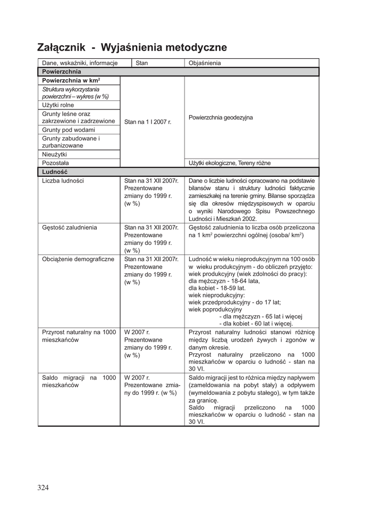 Załącznik - Wyjaśnienia metodyczne Dane, wskaźniki, informacje Powierzchnia Powierzchnia w km2 Struktura wykorzystania powierzchni – wykres (w %) Użytki rolne Grunty leśne oraz zakrzewione i zadrzewione Grunty pod wodami Grunty zabudowane i zurbanizowane Nieużytki Pozostała Ludność Liczba ludności Gęstość zaludnienia Obciążenie demograficzne Stan Stan na 1 I 2007 r. Powierzchnia geodezyjna Użytki ekologiczne, Tereny różne Stan na 31 XII 2007r. Prezentowane zmiany do 1999 r. (w %) Stan na 31 XII 2007r. Prezentowane zmiany do 1999 r. (w %) Stan na 31 XII 2007r. Prezentowane zmiany do 1999 r. (w %) Przyrost naturalny na 1000 mieszkańców W 2007 r. Prezentowane zmiany do 1999 r. (w %) Saldo migracji na 1000 mieszkańców W 2007 r. Prezentowane zmiany do 1999 r. (w %) 324 Objaśnienia Dane o liczbie ludności opracowano na podstawie bilansów stanu i struktury ludności faktycznie zamieszkałej na terenie gminy. Bilanse sporządza się dla okresów międzyspisowych w oparciu o wyniki Narodowego Spisu Powszechnego Ludności i Mieszkań 2002. Gęstość zaludnienia to liczba osób przeliczona na 1 km2 powierzchni ogólnej (osoba/ km2) Ludność w wieku nieprodukcyjnym na 100 osób w wieku produkcyjnym - do obliczeń przyjęto: wiek produkcyjny (wiek zdolności do pracy): dla mężczyzn - 18-64 lata, dla kobiet - 18-59 lat. wiek nieprodukcyjny: wiek przedprodukcyjny - do 17 lat; wiek poprodukcyjny - dla mężczyzn - 65 lat i więcej - dla kobiet - 60 lat i więcej. Przyrost naturalny ludności stanowi różnicę między liczbą urodzeń żywych i zgonów w danym okresie. Przyrost naturalny przeliczono na 1000 mieszkańców w oparciu o ludność - stan na 30 VI. Saldo migracji jest to różnica między napływem (zameldowania na pobyt stały) a odpływem (wymeldowania z pobytu stałego), w tym także za granicę. Saldo migracji przeliczono na 1000 mieszkańców w oparciu o ludność - stan na 30 VI. Rynek pracy Stan na 31 XII 2007 r. Pracujący Struktura pracujących – wykres (w %) Rolnictwo, łowiectwo i leśnictwo; rybactwo Przemysł i budownictwo Usługi rynkowe Usługi nierynkowe Wskaźnik zatrudnienia Stan na 31 XII 2007r. Prezentowane zmiany do 1999r. (w punktach procentowych) Pracujący dotyczą osób wykonujących pracę przynoszącą im zarobek lub dochód. Prezentowane dane dotyczą pracujących według faktycznego miejsca pracy; nie obejmują podmiotów gospodarczych o liczbie pracujących do 9 osób (w 1999 r. bez zakładów osób fizycznych do 9 osób), rolnictwa indywidualnego i duchowieństwa, fundacji, stowarzyszeń i innych organizacji oraz jednostek budżetowych prowadzących działalność w zakresie obrony narodowej i bezpieczeństwa publicznego. Sekcje PKD: Rolnictwo, łowiectwo i leśnictwo Rybactwo Sekcje PKD: • Przemysł: górnictwo, przetwórstwo przemysłowe, wytwarzanie i zaopatrywanie w energię elektryczną, gaz, wodę • Budownictwo Sekcje PKD: Handel hurtowy i detaliczny; naprawa pojazdów samochodowych, motocykli oraz artykułów użytku osobistego i domowego (skrót - Handel i naprawy); Hotele i restauracje; Transport, gospodarka magazynowa i łączność; Pośrednictwo finansowe; Obsługa nieruchomości, wynajem i usługi związane z prowadzeniem działalności gospodarczej (skrót - Obsługa nieruchomości i firm); Działalność usługowa komunalna, społeczna i indywidualna, pozostała oraz Gospodarstwa domowe zatrudniające pracowników. Sekcje PKD: Administracja publiczna i obrona narodowa; obowiązkowe ubezpieczenia społeczne i powszechne ubezpieczenia zdrowotne; Edukacja oraz Ochrona zdrowia i pomoc społeczna Wskaźnik zatrudnienia jest ilorazem pracujących i ludności w wieku produkcyjnym, do obliczeń przyjęto wiek: dla mężczyzn - 15-64 lata, dla kobiet - 15-59 lat (w %). Do przeliczeń przyjęto pracujących według faktycznego miejsca pracy; nie obejmują podmiotów gospodarczych o liczbie pracujących do 9 osób (w 1999 r. bez zakładów osób fizycznych do 9 osób), rolnictwa indywidualnego i duchowieństwa, fundacji, stowarzyszeń i innych organizacji oraz jednostek budżetowych prowadzących działalność w zakresie obrony narodowej i bezpieczeństwa publicznego. 325 Liczba bezrobotnych Stan na 31 XII 2007r. Prezentowane zmiany do 1999 r. (w %) Stopa bezrobocia Stan na 31 XII 2007 r. Prezentowane zmiany do 1999r. (w punktach procentowych) Odsetek bezrobotnych w liczbie ludności w wieku produkcyjnym Stan na 31 XII 2007 r. Prezentowane zmiany do 1999r. (w punktach procentowych) Stopa bezrobocia Stopa bezrobocia dla lat: 1999, 2002, 2004, 2007 – wykres (w %) Stan na 31 XII 1999, 2002, 2007 326 2004, Dane o bezrobotnych zarejestrowanych obejmują osoby niezatrudnione i niewykonujące innej pracy zarobkowej, zdolne i gotowe do podjęcia zatrudnienia w pełnym wymiarze czasu pracy (bądź co najmniej w połowie wymiaru czasu pracy - osoby niepełnosprawne), nieuczące się w szkole, w wyjątkiem szkół dla dorosłych lub szkół wyższych (wieczorowych, eksternistycznych lub zaocznych) zarejestrowane we właściwym dla miejsca zameldowania (stałego lub czasowego) powiatowym urzędzie pracy oraz poszukujące zatrudnienia lub innej pracy zarobkowej. Dane prezentowane dla województwa i powiatów. Stopę bezrobocia rejestrowanego obliczono jako stosunek liczby bezrobotnych zarejestrowanych do liczby cywilnej ludności aktywnej zawodowo tj. bez osób odbywających służbę wojskową oraz pracowników jednostek budżetowych prowadzących działalność zakresie obrony narodowej i bezpieczeństwa publicznego (w %). W 1999 r. stopa bezrobocia prezentowana jest zgodnie z obowiązującą w tym roku lokalizacją PUP: – powiat słupski łącznie z miastem Słupsk – powiat gdański łącznie z miastem Gdańsk – miasto Gdynia łącznie z miastem Sopot – powiat malborski łącznie w powiatem sztumskim (powstał z części powiatu malborskiego w 2002 r.) Odsetek bezrobotnych w liczbie ludności w wieku produkcyjnym jest t