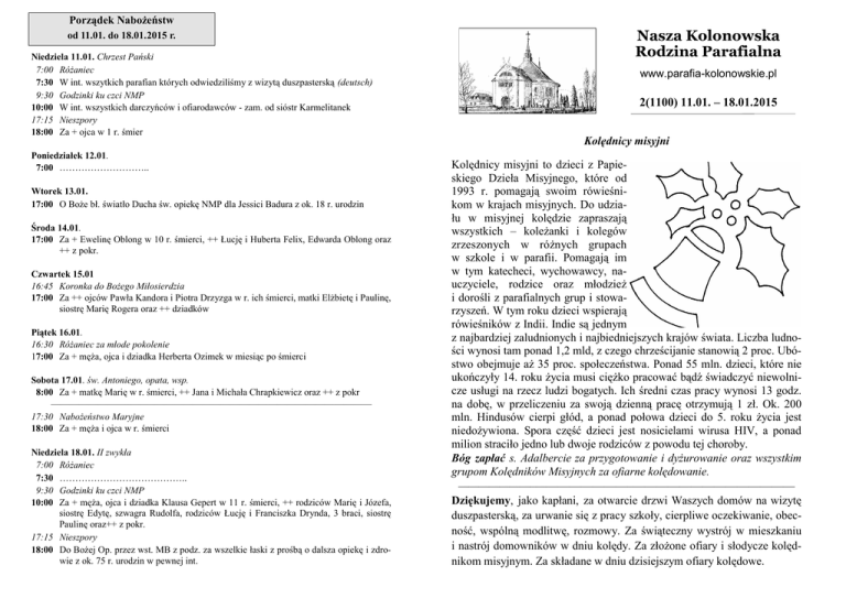 Porządek Nabożeństw od 11.01. do 18.01.2015 r. Niedziela 11.01. Chrzest Pański 7:00 Różaniec 7:30 W int. wszytkich parafian których odwiedziliśmy z wizytą duszpasterską (deutsch) 9:30 Godzinki ku czci NMP 10:00 W int. wszystkich darczyńców i ofiarodawców - zam. od sióstr Karmelitanek 17:15 Nieszpory 18:00 Za + ojca w 1 r. śmier Poniedziałek 12.01. 7:00 ……………………….. Wtorek 13.01. 17:00 O Boże bł. światło Ducha św. opiekę NMP dla Jessici Badura z ok. 18 r. urodzin Środa 14.01. 17:00 Za + Ewelinę Oblong w 10 r. śmierci, ++ Łucję i Huberta Felix, Edwarda Oblong oraz ++ z pokr. Czwartek 15.01 16:45 Koronka do Bożego Miłosierdzia 17:00 Za ++ ojców Pawła Kandora i Piotra Drzyzga w r. ich śmierci, matki Elżbietę i Paulinę, siostrę Marię Rogera oraz ++ dziadków Piątek 16.01. 16:30 Różaniec za młode pokolenie 17:00 Za + męża, ojca i dziadka Herberta Ozimek w miesiąc po śmierci Sobota 17.01. św. Antoniego, opata, wsp. 8:00 Za + matkę Marię w r. śmierci, ++ Jana i Michała Chrapkiewicz oraz ++ z pokr ————————–—–———————————————————————— 17:30 Nabożeństwo Maryjne 18:00 Za + męża i ojca w r. śmierci Niedziela 18.01. II zwykła 7:00 Różaniec 7:30 ………………………………….. 9:30 Godzinki ku czci NMP 10:00 Za + męża, ojca i dziadka Klausa Gepert w 11 r. śmierci, ++ rodziców Marię i Józefa, siostrę Edytę, szwagra Rudolfa, rodziców Łucję i Franciszka Drynda, 3 braci, siostrę Paulinę oraz++ z pokr. 17:15 Nieszpory 18:00 Do Bożej Op. przez wst. MB z podz. za wszelkie łaski z prośbą o dalsza opiekę i zdrowie z ok. 75 r. urodzin w pewnej int. Nasza Kolonowska Rodzina Parafialna www.parafia-kolonowskie.pl 2(1100) 11.01. – 18.01.2015 Kolędnicy misyjni Kolędnicy misyjni to dzieci z Papieskiego Dzieła Misyjnego, które od 1993 r. pomagają swoim rówieśnikom w krajach misyjnych. Do udziału w misyjnej kolędzie zapraszają wszystkich – koleżanki i kolegów zrzeszonych w różnych grupach w szkole i w parafii. Pomagają im w tym katecheci, wychowawcy, nauczyciele, rodzice oraz młodzież i dorośli z parafialnych grup i stowarzyszeń. W tym roku dzieci wspierają rówieśników z Indii. Indie są jednym z najbardziej zaludnionych i najbiedniejszych krajów świata. Liczba ludności wynosi tam ponad 1,2 mld, z czego chrześcijanie stanowią 2 proc. Ubóstwo obejmuje aż 35 proc. społeczeństwa. Ponad 55 mln. dzieci, które nie ukończyły 14. roku życia musi ciężko pracować bądź świadczyć niewolnicze usługi na rzecz ludzi bogatych. Ich średni czas pracy wynosi 13 godz. na dobę, w przeliczeniu za swoją dzienną pracę otrzymują 1 zł. Ok. 200 mln. Hindusów cierpi głód, a ponad połowa dzieci do 5. roku życia jest niedożywiona. Spora część dzieci jest nosicielami wirusa HIV, a ponad milion straciło jedno lub dwoje rodziców z powodu tej choroby. Bóg zapłać s. Adalbercie za przygotowanie i dyżurowanie oraz wszystkim grupom Kolędników Misyjnych za ofiarne kolędowanie. ———————–————————–—————————————— Dziękujemy, jako kapłani, za otwarcie drzwi Waszych domów na wizytę duszpasterską, za urwanie się z pracy szkoły, cierpliwe oczekiwanie, obecność, wspólną modlitwę, rozmowy. Za świąteczny wystrój w mieszkaniu i nastrój domowników w dniu kolędy. Za złożone ofiary i słodycze kolędnikom misyjnym. Za składane w dniu dzisiejszym ofiary kolędowe. 2/2015 Dwa opowiadania Zapytano kiedyś Uwajsa: Jak się czujesz dzisiejszego poranka? Uwajs odrzekł: Czuję się jak ktoś, kto wstał rano, a nie wie, czy dożyje wieczora. Usłyszał w odpowiedzi: Ależ wszyscy ludzie są w tej samej sytuacji! A Uwajs na to: Z pewnością - ale ilu z nich o tym wie? Był kiedyś człowiek, który nie wierzył w Boga i nie obawiał się głośno wyrażać swego zdania na temat religii. Miał żonę, która mimo jego pogardliwych komentarzy usiłowała wychować dzieci w wierze chrześcijańskiej. W któreś śnieżne Święta Bożego Narodzenia zabierała dzieci do kościoła. Zachęcała i jego, lecz on powiedział: „Już wiele razy słyszałem, że Jezus urodził się w Betlejem!” I pozostał w domu. Tymczasem na dworze rozpętała się silna śnieżyca. Człowiek ten usłyszał silne grzmotnięcie, coś uderzyło w okno jego domu. I znowu wyjrzał, lecz nic nie było widać ani na metr. Gdy trochę zelżało wyszedł zobaczyć, co mogło spowodować te uderzenia. Niedaleko domu, na polu zobaczył stadko dzikich gęsi. Widocznie były w drodze na południe, gdy zostały złapane przez śnieżycę. Zgubiły się i osiadły na jego farmie bez jedzenia i ochrony. Po prostu machały skrzydłami i krążyły nisko wokół jego pola, na oślep i bez celu. Zdaje się, że kilka z nich uderzyło w jego okno. Zrobiło mu się ich żal i pomyślał, że stodoła byłaby teraz świetnym miejscem dla gęsi. Jest ciepła i bezpieczna, mogłyby przeczekać tam noc. Wyszedł więc i otworzył drzwi stodoły na oścież, lecz gęsi nadal trzepotały się bez celu i zdawały się nie widzieć stodoły, ani tego, co dla nich znaczy. Wtedy usiłował zwrócić ich uwagę na siebie, lecz wystraszyły się i odleciały dalej. Poszedł więc do domu, przyniósł trochę chleba i okruchami wyznaczył drogę ——————–————————–—————————————— Na wesoło - Co mówi bombka do bombki? Chyba nas powieszą. - Wigilia. Facet gotowy, zwarty i czeka na pierwszą gwiazdkę. Oczywiście puste miejsce zostawił, a tu nagle dzwonek: Kto tam? Strudzony wędrowiec, czy jest miejsce? Jest. A mogę skorzystać? Nie! A czemu? Bo tradycyjnie musi być puste! - Kompozytora Camille'a Saint-Saensa poproszono, by posłuchał i ocenił grę na fortepianie dziewczyny uchodzącej za cudowne dziecko. Gdy już skończyła – mistrz powiedział: 