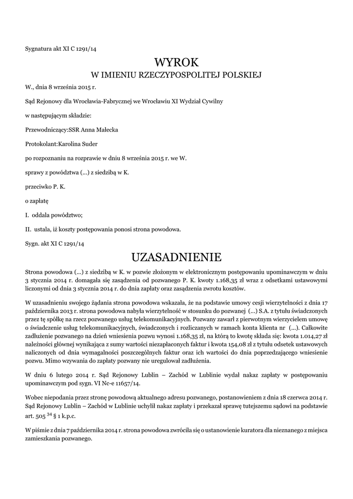 Sygnatura akt XI C 1291/14 WYROK W IMIENIU RZECZYPOSPOLITEJ POLSKIEJ W., dnia 8 września 2015 r. Sąd Rejonowy dla Wrocławia-Fabrycznej we Wrocławiu XI Wydział Cywilny w następującym składzie: Przewodniczący:SSR Anna Małecka Protokolant:Karolina Suder po rozpoznaniu na rozprawie w dniu 8 września 2015 r. we W. sprawy z powództwa (...) z siedzibą w K. przeciwko P. K. o zapłatę I. oddala powództwo; II. ustala, iż koszty postępowania ponosi strona powodowa. Sygn. akt XI C 1291/14 UZASADNIENIE Strona powodowa (...) z siedzibą w K. w pozwie złożonym w elektronicznym postępowaniu upominawczym w dniu 3 stycznia 2014 r. domagała się zasądzenia od pozwanego P. K. kwoty 1.168,35 zł wraz z odsetkami ustawowymi liczonymi od dnia 3 stycznia 2014 r. do dnia zapłaty oraz zasądzenia zwrotu kosztów. W uzasadnieniu swojego żądania strona powodowa wskazała, że na podstawie umowy cesji wierzytelności z dnia 17 października 2013 r. strona powodowa nabyła wierzytelność w stosunku do pozwanej (...) S.A. z tytułu świadczonych przez tę spółkę na rzecz pozwanego usług telekomunikacyjnych. Pozwany zawarł z pierwotnym wierzycielem umowę o świadczenie usług telekomunikacyjnych, świadczonych i rozliczanych w ramach konta klienta nr (...). Całkowite zadłużenie pozwanego na dzień wniesienia pozwu wynosi 1.168,35 zł, na którą to kwotę składa się: kwota 1.014,27 zł należności głównej wynikająca z sumy wartości niezapłaconych faktur i kwota 154,08 zł z tytułu odsetek ustawowych naliczonych od dnia wymagalności poszczególnych faktur oraz ich wartości do dnia poprzedzającego wniesienie pozwu. Mimo wzywania do zapłaty pozwany nie uregulował zadłużenia. W dniu 6 lutego 2014 r. Sąd Rejonowy Lublin – Zachód w Lublinie wydał nakaz zapłaty w postępowaniu upominawczym pod sygn. VI Nc-e 11657/14. Wobec niepodania przez stronę powodową aktualnego adresu pozwanego, postanowieniem z dnia 18 czerwca 2014 r. Sąd Rejonowy Lublin – Zachód w Lublinie uchylił nakaz zapłaty i przekazał sprawę tutejszemu sądowi na podstawie art. 505 34 § 1 k.p.c. W piśmie z dnia 7 października 2014 r. strona powodowa zwróciła się o ustanowienie kuratora dla nieznanego z miejsca zamieszkania pozwanego. Zarządzeniem z dnia 29 grudnia 2014 r. (k. 58) został ustanowiony kurator dla nieznanego z miejsca zamieszkania pozwanego. W odpowiedzi na pozew z dnia 25 marca 2015 r. (k. 71) kurator pozwanego wniosła o oddalenie powództwa w całości i obciążenie stronę powodową kosztami postępowania. Kurator pozwanego zarzuciła, że strona powodowa nie wykazała legitymacji w postępowaniu, nie wykazała bowiem, że przedstawiona umowa sprzedaży wierzytelności dotyczy również należności pozwanego, gdyż nie zostało do udowodnione dokumentem stanowiącym integralną część umowy przelewu. Kurator podniosła nadto, ze przedstawiona umowa jest warunkowa, gdyż wierzytelność przechodzi na nabywcę pod warunkiem uiszczenia przez niego kwoty nabycia, a fakt ten nie został wykazany. Kurator zarzuciła również, że zaoferowane przez stronę powodową dowody nie pozwalają na zweryfikowanie dochodzonej kwoty, gdyż nie wynika ona z treści umowy abonenckiej. Jednocześnie kurator wskazał, że w uzasadnieniu pozwu pod pozycjami 5 i 6, 7 i 8 oraz 12 i 13 wskazywane są te same należności. Odnosząc się do należności określonej w nocie obciążeniowej kurator P. K. wskazała, że strona powodowa nie wykazała wystąpienia okoliczności, które uzasadniałyby obciążenie pozwanego karą umowną. W piśmie przygotowawczym z dnia 24 kwietnia 2015 r. strona powodowa zwróciła się o zobowiązanie w trybie ary. 248 k.p.c. (...) S.A. o udostępnienie dokumentów, stanowiących podstawę naliczenia opłat za usługi telewizyjne oraz najem dekodera, regulaminu świadczeń telekomunikacyjnych. Strona powodowa wskazała, że pozwany posiadał zaległości, co uzasadniało zawieszenie świadczenia usług oraz rozwiązania umowy w oparciu o postanowienia regulaminu. Na skutek poszukiwań pozwanego prowadzonych w toku postępowania ustalono jego miejsce pobytu, w związku z czym doręczono pozwanemu odpis pozwu oraz pisma przygotowawczego strony powodowej z dnia 22 kwietnia 2015 , jak również kopię odpowiedzi na pozew złożonej przez kuratora. Sąd ustalił następujący stan faktyczny: W dniu 11 maja 2011 r. P. K. zawarł z (...) S.A. w W. umowę abonencką numer (...), której przedmiotem było świadczenie o świadczenie usług telekomunikacyjnych w ramach oferty promocyjnej (...). Umowa została zawarta na czas określony 36 miesięcy, przy czym wskazano, że po upływie okresu promocyjnego abonent będzie uiszczał opłaty abonamentowe w wysokości 79,90 zł miesięcznie. Wartość przyznanej abonentowi ulgi określono na kwotę 1.855,80 zł. W punkcie 7 umowy strony określiły, że umowa zawarta na czas określony przekształca się po upływie czasu, na jaki została zawarta, w umowę zawartą na czas określony nazywany Okresem Dodatkowym na kolejne 12 miesięcy, chyba że abonent przed upływem okresu, na który umowa została zawarta, zawiadomi operatora na piśmie, że nie zamierza korzystać z jego usług - na 3 okresy rozliczeniowe wcześniej. W punkcie 13 zastrzeżono, że w przypadku jednostronnego rozwiązania umowy abonenckiej przez abonenta albo (...) S.A. z winy abonenta przed upływem okresu podstawowego (to jest okresu, na jaki zawarto umowę), abonent będzie zobowiązany do zapłaty kary umownej w wysokości ulgi przyznanej abonentowi, pomniejszonej proporcjonalnie o jej wartość od dnia zawarcia umowy do dnia rozwiązania. /dowód: umowa z dnia 11.05.2011 r. – k. 43-48/ W dniu 18 grudnia 2012 r. (...) S.A. wystawił notę obciążeniową numer (...) na kwotę 861,86 zł z terminem płatności na dzień 8 stycznia 2013 r. tytułem kary umownej za rozwiązanie umowy numer (...). /dowód: wydruk noty obciążeniowej - k. 49/ W dniu 17 paź