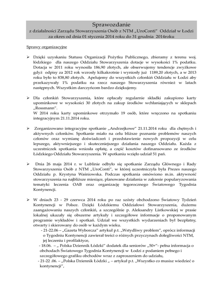 Sprawozdanie z działalności Zarządu Stowarzyszenia Osób z NTM „UroConti” Oddział w Łodzi za okres od dnia 01 stycznia 2014 roku do 31 grudnia 2014roku Sprawy organizacyjne Dzięki uzyskaniu Statusu Organizacji Pożytku Publicznego, zbieramy z terenu woj. łódzkiego dla naszego Oddziału Stowarzyszenia dotacje w wysokości 1% podatku. Dotacja w 2011 roku wynosiła 186,90 złotych, ale obserwujemy tendencje zwyżkowe gdyż odpisy za 2012 rok wzrosły kilkakrotnie i wyniosły już 1189,20 złotych, a w 2013 roku było to 838,80 złotych. Apelujemy do wszystkich członkiń Oddziału w Łodzi aby przekazywały 1% podatku na rzecz naszego Stowarzyszenia również w latach następnych. Wszystkim darczyńcom bardzo dziękujemy. Dla członkiń Stowarzyszenia, które opłacały regularnie składki zakupiono karty upominkowe w wysokości 30 złotych na zakup środków wchłaniających w sklepach „Rossmann”. W 2014 roku karty upominkowe otrzymało 19 osób, które wręczono na spotkaniu integracyjnym 21.11.2014 roku. Zorganizowano integracyjne spotkanie „Andrzejkowe” 21.11.2014 roku dla chętnych i aktywnych członków. Spotkanie miało na celu bliższe poznanie problemów naszych członów oraz wymianę doświadczeń i przedstawienie nowych propozycji w celu lepszego, aktywniejszego i skuteczniejszego działania naszego Oddziału. Każda z uczestniczek spotkania wniosła opłatę, a część kosztów dofinansowano ze środków Łódzkiego Oddziału Stowarzyszenia. W spotkaniu wzięło udział 51 pań. Dnia 26 maja 2014 r. w Lublinie odbyło się spotkanie Zarządu Głównego i Rady Stowarzyszenia Osób z NTM „UroConti”, w której uczestniczyła była Prezes naszego Oddziału p. Krystyna Waśniowska. Podczas spotkania omówiono m.in. aktywność stowarzyszenia na najbliższe miesiące, planowane działania w zakresie popularyzowania tematyki leczenia OAB oraz organizację tegorocznego Światowego Tygodnia Kontynencji. W dniach 23 - 29 czerwca 2014 roku po raz szósty obchodzono Światowy Tydzień Kontynencji w Polsce. Dzięki Łódzkiemu Oddziałowi Stowarzyszenia, dużemu zaangażowaniu naszych członkiń, a szczególnie p. Aleksandry Listkowskiej w prasie lokalnej ukazały się obszerne artykuły i szczegółowe informacje o proponowanym programie wykładów i spotkań. Udział we wszystkich wydarzeniach był bezpłatny, otwarty i skierowany do osób w każdym wieku. - 21-22.06 – „Gazeta Wyborcza” artykuł p.t. „Wstydliwy problem”, oprócz informacji o Tygodniu Kontynencji zawierał treści o różnych przyczynach dolegliwości NTM, jej leczeniu i profilaktyce, - 18.06. – „ Polska Dziennik Łódzki” dodatek dla seniorów „50+”- pełna informacja o obchodach Światowego Tygodnia Kontynencji w Łodzi z podaniem pełnego i szczegółowego grafiku obchodów wraz z zaproszeniem do udziału, - 21-22 .06. – „Polska Dziennik Łódzki „ – artykuł p.t. „Wszystko co musisz wiedzieć o kontynencji”, - czerwiec – „Express Ilustrowany „ - wywiad z dr. n. med. Zbigniewem Trzepizurem n.t. „Gdy piecze i boli” - propagowanie naszych działań z wykorzystaniem ulotek informacyjnych, które dzięki naszym aktywnym członkiniom zostały udostępnione: w różnych programach społecznych, Uniwersytetach Trzeciego Wieku, w wybranych przychodniach i aptekach. Realizacja obchodów: - 23.06.2014 r. – Uniwersytecki Szpital Kliniczny im. WAM w Łodzi pl. Hallera 1 – godz. 16.30 – wykład nt. „ Pęcherz nadreaktywny u kobiet. Objawy i postępowanie. Prof. dr n. med. Marek Sosnowski – godz. 17.30 – „Twój pierwszy krok w profilaktyce i leczeniu NTM” Mgr wychowania fizycznego Aleksandra Listkowska – godz. 17.45 - prezentacja środków wchłaniających różnych firm (próbki) Pani Anna Troczyńska – promocja Kampanii Corewellness (materiały szkoleniowe, płyty) – przedstawienie gościom wizerunku Stowarzyszenia „UroConti” zaproszenie do współdziałania oraz ćwiczeń gimnastycznych, jako podstawowego środka zapobiegawczego NTM. W spotkaniu uczestniczyło 86 osób. - w dniach 24, 25 i 26 czerwca odbyły się trzy dwugodzinne spotkania informacyjno - edukacyjne n.t. znaczenia treningu mięśni dna miednicy w profilaktyce i leczeniu NTM, połączone z instruktażowymi ćwiczeniami gimnastycznymi oraz nauką zachowań w życiu codziennym przeciwdziałającym dysfunkcjom mięśni dna miednicy, które prowadziła mgr Aleksandra Listkowska. Prezentacji Stowarzyszenia dokonały panie Nina Polka, Teresa Wiśniewska, Marzena Ostojska i Małgorzata Pawlak. W spotkaniach uczestniczyło 58 pań. Spotkania odbyły się w Centrum Medycyny NOWA EUROPA al. Kościuszki 106/116 w Łodzi. 23 czerwca 2014 roku w Uniwersyteckim Szpitalu Klinicznym im. WAM, odbyło się Walne Zebranie Sprawozdawcze Członków Łódzkiego Oddziału Stowarzyszenia „UroConti” W dniu 11 grudnia 2014 roku w Warszawie w Sali kolumnowej Sejmu odbyła się ogólnopolska konferencja organizowana przez Koalicję „Na pomoc niesamodzielnym” oraz Senacką Komisję Rodziny, Polityki Senioralnej i Społecznej, gdzie między innymi odbyła się prezentacja projektu ustawy „Pomoc osobom niesamodzielnym”, przygotowywana pod kierunkiem senatora Mieczysława Augustyna. Z naszego Oddziału w konferencji wzięła udział p. Małgorzata Pawlak. W dniu 12 grudnia 2014 roku również w Warszawie odbyło się spotkanie Zarządu Głównego z Radą Stowarzyszenia Osób z NTM „UroConti”. Podczas posiedzenia omówiono m.in. strategię działań na 2015 rok z zakresu promowania nowoczesnych terapii w leczeniu pęcherza nad reaktywnego wśród pacjentów, opinii publicznej oraz decydentów, a także kwestię dalszych działań w kierunku zmiany przepisów regulujących dostęp do leków na OAB. W spotkaniu uczestniczyła p. Małgorzata Pawlak. Zgodnie z wymogami ustawy o rachunkowości złożono do Urzędu Skarbowego ŁódźPolesie niżej wymagane dokumenty z działalności finansowej Ł