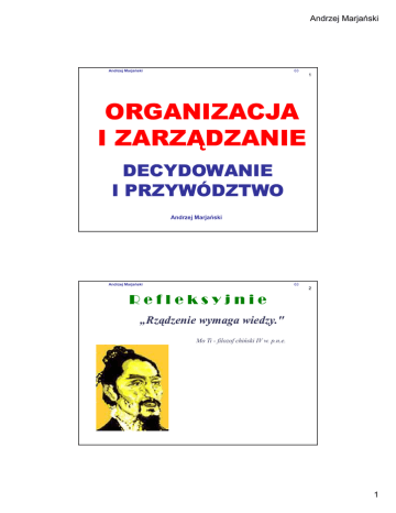 Andrzej Marjański Andrzej Marjański 63 1 ORGANIZACJA I ZARZĄDZANIE DECYDOWANIE I PRZYWÓDZTWO Andrzej Marjański Andrzej Marjański 63 2 Refleksyjnie „Rządzenie wymaga wiedzy." Mo Ti - filozof chiński IV w. p.n.e. 1 Andrzej Marjański Andrzej Marjański 63 3 DECYDOWANIE – jako uwieńczenie procesu planowania Zarządzanie to stały proces podejmowania decyzji. Nie ma sprawnie zarządzanej firmy bez decyzji podejmowanych szybko i skutecznie. Aby jednak tak postępować warto znać zasady: Formułowania problemów decyzyjnych Wyboru najlepszych działań JeŜeli się o nich zapomina, to następuje dramat. Był on, jest i będzie udziałem tysięcy firm, w których codziennie menedŜerowie – skądinąd ludzie inteligentni i wykształceni – podejmują decyzje najbardziej idiotyczne z moŜliwych. (K. Obłój) Andrzej Marjański 63 4 Decydowanie KaŜdy wie, jak trudno czasem jest podjąć decyzję, albo z powodu niedostatku informacji lub niemoŜności przewidzenia zakresu skutków dokonanego wyboru. Sam proces decydowania wydaje oczywistym i i naturalnym – jako przyrodzony przywilej rozumnego i wolnego człowieka Istnieje jednak przypadek, w którym pytanie jak naprawdę ludzie decydują staje się zasadne – gdy decyzja nie jest wyborem dokonywanym przez jednego człowieka, lecz przez grupę najczęściej zorganizowaną Rzeczywistość dostarcza wielu przykładów, które wydają się dziwne – jak do tego doszło, jak na to wpadli? 2 Andrzej Marjański Andrzej Marjański 63 5 Decydowanie Przedsiębiorstwo nie jest wolne od problemów jakie niesie decydowanie grupowe. Przedsiębiorstwo działa „tu i teraz” Tylko teoria ekonomii utoŜsamia przedsiębiorstwo z jednostką abstrakcyjną kierującą się informacjami rynkowymi i racjonalnie ustalającymi wielkość swojej produkcji i centy wyrobów Na wynik podejmowania decyzji wpływa wiele czynników podejmuje ją: dyrektor, zarząd, specjaliści funkcjonalni czy moŜe wszyscy? wyrazem czyjej woli jest podjęta decyzja? czy zmiany są przemyślane? Andrzej Marjański 63 Podejmowanie decyzji 6 wybór spośród dwóch lub więcej wariantów Podejmowanie decyzji – to w praktyce serce funkcji zarządzania takich jak: planowanie, organizowanie, kierowanie kontrolowanie. Aby podjąć logiczną, inteligentną i dobrze umotywowaną decyzję menedŜer wykonuje pięć kroków: 3 Andrzej Marjański Andrzej Marjański 63 7 Model racjonalnego podejmowania decyzji Zdefiniuj problem Zestaw warianty Zdecyduj, który z nich jest najlepszy Zrób to co zostało ustalone Zbadaj, czy decyzja była właściwa Andrzej Marjański 63 8 Model racjonalnego podejmowania decyzji Najlepsze decyzje opierają się na solidnej informacji. MenedŜerowie otrzymują dane zarówno z wnętrza organizacji jak i z zewnątrz. Jednak Ŝadne dane nie zastąpią twórczego menedŜera, który podejmuje błyskotliwe decyzje. Podejmowanie decyzji to bardziej sztuka niŜ umiejętność. Jest to umiejętność, której menedŜer najbardziej potrzebuje, poniewaŜ z niej wynikają wszystkie pozostałe funkcje zarządzania. 4 Andrzej Marjański Andrzej Marjański 63 9 Definicja podejmowania decyzji Podejmowanie decyzji moŜe mieć charakter konkretnego aktu, lub odnosić się do ogólnego procesu Proces decyzyjny jest czymś więcej niŜ podejmowaniem decyzji, stanowi bowiem jeden z kroków w procesie. Proces podejmowania decyzji obejmuje: rozpoznanie i zidentyfikowanie istoty sytuacji decyzyjnej określenie moŜliwości alternatywnych wybór „najlepszego” wariantu wprowadzenie go w Ŝycie Podejmowanie decyzji – akt wyboru jednej moŜliwości spośród ich zestawu Andrzej Marjański 63 10 Proces podejmowania decyzji Rozpoznanie problemu Ustalenie kryteriów decyzyjnych Ocena skuteczności decyzji WdroŜenie rozwiązania Przypisanie wag do kryteriów Wybór rozwiązania Opracowanie moŜliwych rozwiązań Analiza moŜliwych rozwiązań Proces podejmowania decyzji jako zbiór 8 kroków Znajduje zastosowanie w opisie indywidualnego i grupowego podejmowania decyzji 5 Andrzej Marjański Andrzej Marjański 63 11 „Najlepsza decyzja” Najlepsza czyli jaka? „Najlepsza” sugeruje skuteczność Skuteczne podejmowanie decyzji wymaga zrozumienia charakteru sytuacji w jakiej ją podejmujemy Wielu ludzi uznaje skuteczność za optymalizację pewnych zestawów czynników (zysk, sprzedaŜ, dobrobyt pracowników, udział w rynku, …) w innych sytuacjach słuszną decyzją będzie np.: minimalizacja strat, kosztów lub fluktuacji personelu. problemem jest czas, który musi upłynąć zanim przekonamy się czy decyzja była prawidłowa Andrzej Marjański 63 Typy decyzji 12 DECYZJE ZAPROGRAMOWANE mają kompletną strukturę lub powtarzające się z pewną częstotliwością (albo i jedno i drugie). mają jasną strukturę lub (i) powracają z pewną częstotliwością są to z reguły decyzje dotyczące podstawowych systemów i procedur operacyjnych standardowych transakcji zawieranych przez organizację 6 Andrzej Marjański Andrzej Marjański 63 13 Typy decyzji DECYZJE NIE ZAPROGRAMOWANE o niezbyt wyraźnej strukturze, podejmowane znacznie rzadziej niŜ decyzje zaprogramowane niepowtarzalne, pochłaniające niezmiernie wiele czasu, energii i zasobów niezbędnych do zbadania sytuacji decyzyjnej główne czynniki to intuicja i doświadczenie są z reguły podejmowane przez menedŜerów najwyŜszego szczebla dotyczą strategii oraz projektowania organizacji Andrzej Marjański 63 14 Warunki podejmowania decyzji Osoba podejmująca decyzję działa w warunkach pewności ryzyka niepewności Poziom niejasności i niebezpieczeństwa podjęcia błędnych decyzji NISKIE ŚREDNIE WYSOKIE 7 Andrzej Marjański Andrzej Marjański 63 15 Warunki podejmowania decyzji Stan pewności – sytuacja, w której podejmujący decyzję zna z rozsądnym zakresem pewności dostępne warianty wyboru oraz ich warunki. Stan ryzyka - sytuacja, w której dostępność poszczególnych moŜliwości i związane z ka