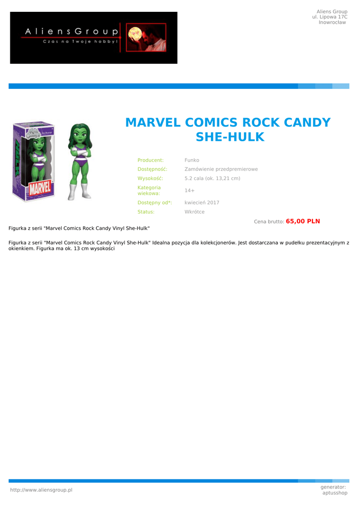 Aliens Group ul. Lipowa 17C Inowrocław MARVEL COMICS ROCK CANDY SHE-HULK Producent: Funko Dostępność: Zamówienie przedpremierowe Wysokość: 5.2 cala (ok. 13,21 cm) Kategoria wiekowa: 14+ Dostępny od*: kwiecień 2017 Status: Wkrótce Cena brutto: 65,00 PLN Figurka z serii "Marvel Comics Rock Candy Vinyl She-Hulk" Figurka z serii "Marvel Comics Rock Candy Vinyl She-Hulk" Idealna pozycja dla kolekcjonerów. Jest dostarczana w pudełku prezentacyjnym z okienkiem. Figurka ma ok. 13 cm wysokości http://www.aliensgroup.pl generator: aptusshop