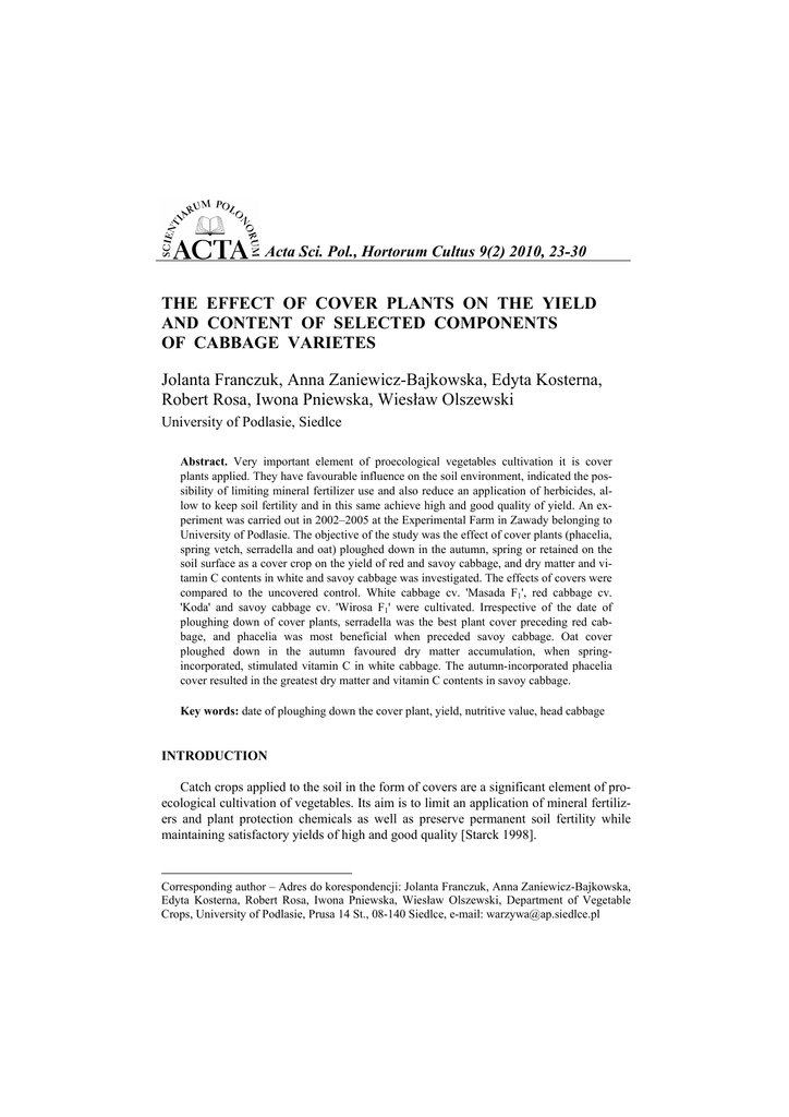 Acta Sci. Pol., Hortorum Cultus 9(2) 2010, 23-30 THE EFFECT OF COVER PLANTS ON THE YIELD AND CONTENT OF SELECTED COMPONENTS OF CABBAGE VARIETES Jolanta Franczuk, Anna Zaniewicz-Bajkowska, Edyta Kosterna, Robert Rosa, Iwona Pniewska, Wiesław Olszewski University of Podlasie, Siedlce Abstract. Very important element of proecological vegetables cultivation it is cover plants applied. They have favourable influence on the soil environment, indicated the possibility of limiting mineral fertilizer use and also reduce an application of herbicides, allow to keep soil fertility and in this same achieve high and good quality of yield. An experiment was carried out in 2002–2005 at the Experimental Farm in Zawady belonging to University of Podlasie. The objective of the study was the effect of cover plants (phacelia, spring vetch, serradella and oat) ploughed down in the autumn, spring or retained on the soil surface as a cover crop on the yield of red and savoy cabbage, and dry matter and vitamin C contents in white and savoy cabbage was investigated. The effects of covers were compared to the uncovered control. White cabbage cv. 'Masada F1', red cabbage cv. 'Koda' and savoy cabbage cv. 'Wirosa F1' were cultivated. Irrespective of the date of ploughing down of cover plants, serradella was the best plant cover preceding red cabbage, and phacelia was most beneficial when preceded savoy cabbage. Oat cover ploughed down in the autumn favoured dry matter accumulation, when springincorporated, stimulated vitamin C in white cabbage. The autumn-incorporated phacelia cover resulted in the greatest dry matter and vitamin C contents in savoy cabbage. Key words: date of ploughing down the cover plant, yield, nutritive value, head cabbage INTRODUCTION Catch crops applied to the soil in the form of covers are a significant element of proecological cultivation of vegetables. Its aim is to limit an application of mineral fertilizers and plant protection chemicals as well as preserve permanent soil fertility while maintaining satisfactory yields of high and good quality [Starck 1998]. Corresponding author – Adres do korespondencji: Jolanta Franczuk, Anna Zaniewicz-Bajkowska, Edyta Kosterna, Robert Rosa, Iwona Pniewska, Wiesław Olszewski, Department of Vegetable Crops, University of Podlasie, Prusa 14 St., 08-140 Siedlce, e-mail: [email protected] 24 J. Franczuk, A. Zaniewicz-Bajkowska, E. Kosterna, R. Rosa, I. Pniewska, W. Olszewski The influence of cover plants is reflected in many aspects which include: improved physico-chemical properties of the soil environment, increased biological activity of the soil, it also affects yields [Abdul-Baki et al. 1996, Jabłońska-Ceglarek et al. 2002, Grassbaugh et al. 2004, Kołota and Adamczewska-Sowińska 2004, Cherr et al. 2006] and makes it possible to introduce production simplifications [Songin 1989, Mazur 1999]. There are much less studies on an impact of plants retained in the field as covers on the crop biological value. The objective of this study was to determine the effect of catch crop plants applied to the soil as covers on the yields and contents of selected nutrients in white, red and Savoy cabbage. MATERIAL AND METHODS A field experiment was carried out in 2002–2005 under the conditions of centraleastern Poland on grey brown podzolic soil. Before the experimental set-up, soil pH determined in H2O was 5.73. The total phosphorus content in soil was 67 mg.kg-1 air dry matter (adm), potassium 108 mg.kg-1 a.d.m., magnesium 39 mg.kg-1 a.d.m., N-NO3 10 mg.kg-1 a.d.m., N-NH4 mg.kg-1 a.d.m., and calcium 380 mg.kg-1 a.d.m. It was set up as a split-block design in three replications. The effect of cover incorporation date: autumn-, spring-incorporated or retained as a cover crop without incorporation till the end of cabbage growth, was investigated. The following plants were selected as covers: phacelia, spring vetch, serradella and oat grown as catch crops. The effects of covers were compared to an uncovered control. The seeds of plants cover were sown in the 1st decade of August in the years 2002– –2004. The seeding rate for cover plants amounted to 15 kg.ha-1 for phacelia, 140 kg.ha-1 for spring vetch, 60 kg.ha-1 for serradella and 240 kg.ha-1 for oat. Autumn-incorporated plants cover were ploughed down in late October. Prior to incorporation, plant material samples were collected to determine the yield of fresh and dry matter of covers as well as nitrogen and mineral compound contents. The quantity of fresh and dry matter and macroelements (N, P, K, Ca, Mg) supplied to the soil with the investigated organic manures differed significantly. Among the cover plants the highest fertility value determined the quantity of NPK compounds entered to the soil was characterised biomass of oat, much less serradella [Jabłońska-Ceglarek et al. 2006, Franczuk et al. 2009]. Spring-incorporated covers were worked in mid-May. In the plots where covers were retained, disking was performed in the spring. In the years 2003-2005, the following species of head cabbage were planted: white cabbage cv. ‘Masada F1’, red cabbage cv. ‘Koda’, and savoy cabbage cv. ‘Wirosa F1’. The cabbages were planted in the first half of June, at the 50 cm × 50 cm row sparing. The mineral fertilizers applied included ammonium nitrate, triple superphosphate, and 60% potassium chloride. A uniform dose of 97 kg N, 90 kg P2O5, 146 kg K2O was applied to all plots before cabbage cultivation. The remaining 60 kg N was top dressed, when cabbage plants started contact by leaves. Chemical protection against diseases and pests was applied according to current Programme of Vegetables Protection. The cabbage harvest was performed manual in the 3rd decade of October. The plot area for _____________________________________________________________________________________________________________________________________________ Acta Sci. Pol. The effect of cover plants on the yield and content of select