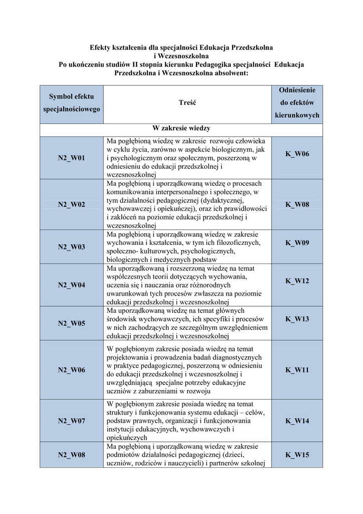 Efekty kształcenia dla specjalności Edukacja Przedszkolna i Wczesnoszkolna Po ukończeniu studiów II stopnia kierunku Pedagogika specjalności Edukacja Przedszkolna i Wczesnoszkolna absolwent: Symbol efektu specjalnościowego Odniesienie Treść do efektów kierunkowych W zakresie wiedzy N2_W01 N2_W02 N2_W03 N2_W04 N2_W05 N2_W06 N2_W07 N2_W08 Ma pogłębioną wiedzę w zakresie rozwoju człowieka w cyklu życia, zarówno w aspekcie biologicznym, jak i psychologicznym oraz społecznym, poszerzoną w odniesieniu do edukacji przedszkolnej i wczesnoszkolnej Ma pogłębioną i uporządkowaną wiedzę o procesach komunikowania interpersonalnego i społecznego, w tym działalności pedagogicznej (dydaktycznej, wychowawczej i opiekuńczej), oraz ich prawidłowości i zakłóceń na poziomie edukacji przedszkolnej i wczesnoszkolnej Ma pogłębioną i uporządkowaną wiedzę w zakresie wychowania i kształcenia, w tym ich filozoficznych, społeczno- kulturowych, psychologicznych, biologicznych i medycznych podstaw Ma uporządkowaną i rozszerzoną wiedzę na temat współczesnych teorii dotyczących wychowania, uczenia się i nauczania oraz różnorodnych uwarunkowań tych procesów zwłaszcza na poziomie edukacji przedszkolnej i wczesnoszkolnej Ma uporządkowaną wiedzę na temat głównych środowisk wychowawczych, ich specyfiki i procesów w nich zachodzących ze szczególnym uwzględnieniem edukacji przedszkolnej i wczesnoszkolnej W pogłębionym zakresie posiada wiedzę na temat projektowania i prowadzenia badań diagnostycznych w praktyce pedagogicznej, poszerzoną w odniesieniu do edukacji przedszkolnej i wczesnoszkolnej i uwzględniającą specjalne potrzeby edukacyjne uczniów z zaburzeniami w rozwoju W pogłębionym zakresie posiada wiedzę na temat struktury i funkcjonowania systemu edukacji – celów, podstaw prawnych, organizacji i funkcjonowania instytucji edukacyjnych, wychowawczych i opiekuńczych Ma pogłębioną i uporządkowaną wiedzę w zakresie podmiotów działalności pedagogicznej (dzieci, uczniów, rodziców i nauczycieli) i partnerów szkolnej K_W06 K_W08 K_W09 K_W12 K_W13 K_W11 K_W14 K_W15 N2_W09 N2_W10 N2_W11 N2_W12 N2_W13 N2_U01 N2_U02 N2_U03 N2_U04 N2_U05 edukacji (np. instruktorów harcerskich) oraz specyfiki funkcjonowania dzieci w wieku przedszkolnym i wczesnoszkolnym w kontekście prawidłowości i nieprawidłowości rozwojowych Ma uporządkowaną wiedzę na temat specyfiki funkcjonowania uczniów ze specjalnymi potrzebami edukacyjnymi, w tym uczniów szczególnie uzdolnionych Ma pogłębioną i uporządkowaną wiedzę w zakresie metodyki wykonywania zadań – norm, procedur i drobnych praktyk stosowanych w wybranym obszarze działalności pedagogicznej (wychowanie przedszkolne, nauczanie w szkołach ogólnodostępnych w klasach I - III, w klasach I – III integracyjnych) w zakresie rozszerzonym i pogłębionym Bezpieczeństwa i higieny pracy w instytucjach edukacyjnych, wychowawczych i opiekuńczych, do pracy w których uzyskuje przygotowanie w zakresie uporządkowanym Ma pogłębioną i uporządkowaną wiedzę w zakresie projektowania ścieżki własnego rozwoju i awansu zawodowego w zakresie rozszerzonym i pogłębionym Ma pogłębioną i uporządkowaną wiedzę w zakresie etyki zawodu nauczyciela W zakresie umiejętności Potrafi dokonywać obserwacji sytuacji i zdarzeń pedagogicznych w zakresie rozszerzonym i pogłębionym Potrafi wykorzystać wiedzę teoretyczną z zakresu pedagogiki oraz psychologii do analizowania i interpretowania określonego rodzaju sytuacji i zdarzeń pedagogicznych, a także motywów i wzorów zachowań uczestników tych sytuacji w zakresie rozszerzonym i pogłębionym W zakresie rozszerzonym i pogłębionym potrafi posługiwać się wiedzą teoretyczną z zakresu pedagogiki, psychologii oraz dydaktyki i metodyki szczegółowej edukacji przedszkolnej i wczesnoszkolnej w celu diagnozowania, analizowania i prognozowania sytuacji pedagogicznych oraz dobierania strategii realizowania działań praktycznych na poszczególnych etapach edukacyjnych Potrafi samodzielnie zdobywać wiedzę i rozwijać swoje profesjonalne umiejętności związane z działalnością pedagogiczną (dydaktyczną, wychowawcza i opiekuńczą), korzystając z różnych źródeł (w języku polskim i obcym) i nowoczesnych technologii w zakresie rozszerzonym i pogłębionym W zakresie rozszerzonym i pogłębionym posiada K_W11 K_W10 ------ ---------K_W16 K_U01 K_U02 K_U08 K_U03 K_U07 N2_U06 N2_U07 N2_U08 N2_U09 N2_U10 N2_U11 N2_U12 N2_U13 N2_U14 N2_U15 umiejętności diagnostyczne pozwalające na rozpoznawanie sytuacji uczniów ze specjalnymi potrzebami edukacyjnymi, opracowywanie wyników obserwacji i formułowanie wniosków W zakresie rozszerzonym i pogłębionym posiada rozwinięte kompetencje komunikacyjne: potrafi porozumiewać się z osobami pochodzącymi z różnych środowisk, będącymi w różnej kondycji emocjonalnej, dialogowo rozwiązywać konflikty i skonstruować dobrą atmosferę dla komunikacji w klasie szkolnej W zakresie rozszerzonym i pogłębionym potrafi ocenić przydatność typowych metod, procedur i dobrych praktyk do realizacji zadań dydaktycznych, wychowawczych i opiekuńczych związanych z edukacją przedszkolną i wczesnoszkolną W zakresie rozszerzonym i pogłębionym potrafi dobierać i wykorzystywać dostępne materiały, środki i metody pracy w celu projektowania i efektywnego realizowania działań pedagogicznych (dydaktycznych, wychowawczych i opiekuńczych) oraz wykorzystywać nowoczesne technologie do pracy dydaktycznej Potrafi sprawnie kierować procesami kształcenia i wychowania, posiada umiejętność pracy z grupą (zespołem wychowawczym, klasowym) Potrafi twórczo animować prace nad rozwojem uczestników procesów pedagogicznych w przedszkolu i klasach I - III. Wspierać ich samodzielność w zdobywaniu wiedzy oraz inspirować do działań na rzecz uczenia się przez całe życie Posiada rozwinięte umiejętności w