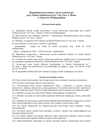 Regulamin korzystania z kortu tenisowego przy Szkole Podstawowej nr 7 im. Gen. J. Bema w Ostrowie Wielkopolskim Postanowienia ogólne §1. Regulamin określa zasady korzystania z kortu tenisowego położonego przy Szkole Podstawowej nr 7 im. Gen. J. Bema w Ostrowie Wielkopolskim. §2. Kort tenisowy jest obiektem sportowo – rekreacyjnym administrowanym przez Szkołę Podstawową nr 7 im. Gen. J. Bema. §3. Obsługą i wynajmem kortu zajmuje się Szkoła Podstawowa nr 7 im. Gen. J. Bema. §4. Kort tenisowy czynny jest w sezonie w godzinach: - poniedziałek – piątek od 16.00 do 20.00 (wrzesień) oraz 16.00 do 19.00 (październik), - sobota – niedziela od 10.00 – 18.00 (wrzesień - październik). §5. Regulamin rozpoczęcia i zakończenia sezonu podawany będzie na stronie Szkoły Podstawowej nr 7 im. Gen. J. Bema. §6. Z obiektu korzystać mogą szkoły, organizacje społeczne, zakłady pracy i osoby prywatne po uprzednim uzgodnieniu terminu ze Szkołą Podstawową nr 7 im. Gen. J. Bema. §7. Rezerwacji kortu trzeba dokonać bezpośrednio w Szkole Podstawowej nr 7 im. Gen. J. Bema lub telefonicznie od poniedziałku do piątku w godz. od 9.00 do 15.00, tel. 62 735 99 50. §8. W przypadku nieobecności kort zostanie wynajęty osobie oczekującej na wejście. Zasady korzystania z kortu §9. Pierwszeństwo korzystania z kortu mają osoby, które dokonały rezerwacji terminowej. §10. Na korcie obowiązuje obuwie i strój sportowy. §11. Nawierzchnie kortu można eksploatować tylko i wyłącznie w czystym obuwiu sportowym o płaskiej, elastycznej i jasnej podeszwie. Nie można używać butów sportowych do piłki nożnej typu korki, butów do zajęć lekkoatletycznych z kolcami oraz butów do golfa. §12. Zabrania się jazdy po nawierzchni rolkami, deskorolkami, wrotkami itp. §13. Zabrania się jazdy po nawierzchni pojazdami kołowymi (hulajnogi, rowery, motocykle i inne). §14. Zabrania się ustawiania na nawierzchni jakichkolwiek przedmiotów mogących wywierać duże naciski jednostkowe (np. ławki, krzesła, stoły, podium, rusztowania i inne). §15. Nie należy dopuszczać do zanieczyszczenia nawierzchni kortu piaskiem, ziemią, kamieniami itp. §16. Na korcie należy zachowywać porządek, czystość i spokój oraz podporządkować się decyzjom opiekuna kortu. §17. Na terenie obiektu obowiązuje całkowity zakaz spożywania alkoholu, palenia tytoniu i zachowywania naruszającego ogólne przyjęte normy społeczne. §18. Odpowiedzialność materialną za szkody powstałe podczas użytkowania kortu ponosi korzystający. §19. Administrator nie ponosi odpowiedzialności za rzeczy pozostawione na terenie kortu. §20. Wszelkie zauważone braki oraz usterki należy zgłaszać administratorowi obiektu. Postanowienia końcowe §21. Skargi i wnioski dotyczące funkcjonowania kortu należy składać w sekretariacie Szkoły Podstawowej nr 7 im. Gen. J. Bema. §22. Za wypadki spowodowane nieprzestrzeganiem niniejszego Regulaminu odpowiedzialność ponosi użytkownik. §23. Wejście i korzystanie z obiektu jest jednoznaczne z akceptacją zapisów niniejszego Regulaminu. Dyrektor Szkoły Urszula Twardowska