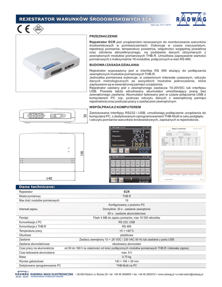 REJESTRATOR WARUNKÓW ŚRODOWISKOWYCH ECR data wyd. 23-11-2016 PRZEZNACZENIE Rejestrator ECR jest urządzeniem stosowanym do monitorowania warunków środowiskowych w pomieszczeniach. Dokonuje w czasie rzeczywistym, rejestracji pomiarów: temperatury powietrza, wilgotności względnej powietrza oraz ciśnienia atmosferycznego, na podstawie danych otrzymanych z zewnętrznych modułów pomiarowych THB.R. Umożliwia zapisywanie wartości pomiarowych z maksymalnie 16 modułów, połączonych w sieć RS 485. BUDOWA I ZASADA DZIAŁANIA Rejestrator wyposażony jest w interfejs RS 485 służący do podłączenia zewnętrznych modułów pomiarowych THB.R. Jednostka pomiarowa wykonuje, w ustawionym interwale czasowym, odczytu danych metrologicznych ze wszystkich modułów jednocześnie, które zapisywane są w wewnętrznej pamięci urządzenia. Rejestrator zasilany jest z zewnętrznego zasilacza 10-20VDC lub interfejsu USB. Posiada także wbudowany akumulator umożliwiający pracę bez zewnętrznego zasilania. Akumulator ładowany jest w czasie połączenia USB z komputerem PC (np. podczas odczytu danych z wewnętrznej pamięci rejestratora) oraz podczas pracy z zasilaczem zewnętrznym. Zastosowane interfejsy RS232 i USB, umożliwiają podłączenie urządzenia do komputera PC, z dedykowanym oprogramowaniem THB-Multi w celu podglądu i odczytu pomiarów warunków środowiskowych, zapisanych w rejestratorze. 106 39 WSPÓŁPRACA Z KOMPUTEREM 140 Dane techniczne: Rejestrator Moduł pomiarowy Max ilość modułów pomiarowych Interwał zapisu Pamięć Komunikacja z PC Komunikacja z THB.R Temperatura pracy Obudowa Zasilanie Zasilanie akumulatorowe Czas pracy na akumulatorze Czas ładowania akumulatora Masa Wymiar gabarytowe Dedykowane oprogramowanie PC ECR THB.R 16 Konfigurowany z poziomu PC Domyślnie: 30 s - zasilanie zewnętrzne 60 s - zasilanie akumulatorowe Flash 4 MB do zapisu pomiarów, max 10 000 rekordów RS 232, USB RS 485 +5 ÷ +40°C plastikowa Zasilacz zewnętrzny 10 ÷ 20 VDC / 230 VAC 50 Hz lub zasilanie z portu USB wbudowany akumulator od 50 do 160 h (w zależności od ilości podłączonych modułów pomiarowych THB.R i interwału zapisu) max. 8 h 0,75 kg 140 × 106 × 39 mm THB-Multi na PC • 26-600 Radom ul. Bracka 28 • tel. +48 48 3848800 • fax. +48 48 3850010 • www.radwag.pl • e-mail:[email protected]