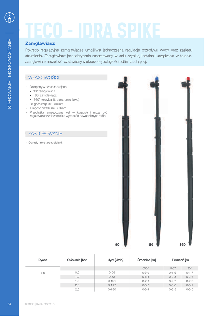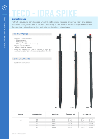 STEROWANIE - MICROZRASZANIE TECO - IDRA SPIKE Zamgławiacz Pokrętło regulacyjne zamgławiacza umożliwia jednoczesną regulację przepływu wody oraz zasięgu strumienia. Zamgławiacz jest fabrycznie zmontowany w celu szybkiej instalacji urządzenia w terenie. Zamgławiacz może być rozstawiony w określonej odległości od linii zasilającej. WŁAŚCIWOŚCI ? Dostępny w trzech rodzajach § 90° zamgławiacz § 180° zamgławiacz § 360° (głowica 18-sto strumieniowa) ? Długość korpusu: 310 mm ? Długość przedłużki: 300 mm ? Przedłużka umieszczona jest w korpusie i może być regulowana w zależności od wysokości nawadnianych roślin. ZASTOSOWANIE ? Ogrody i inne tereny zieleni. 90 54 12 Dysza Ciśnienie [bar] Przepływ [l/min] 1,5 0,5 1,0 1,5 2,0 2,5 0-58 0-82 0-101 0-117 0-130 DRAGO KATALOG 2010 180 Średnica [m] 360° 0-5,0 0-6,8 0-7,9 0-8,2 0-8,4 360 Promień [m] 180° 0-1,9 0-2,3 0-2,7 0-3,0 0-3,3 90° 0-1,7 0-2,5 0-2,9 0-3,2 0-3,5