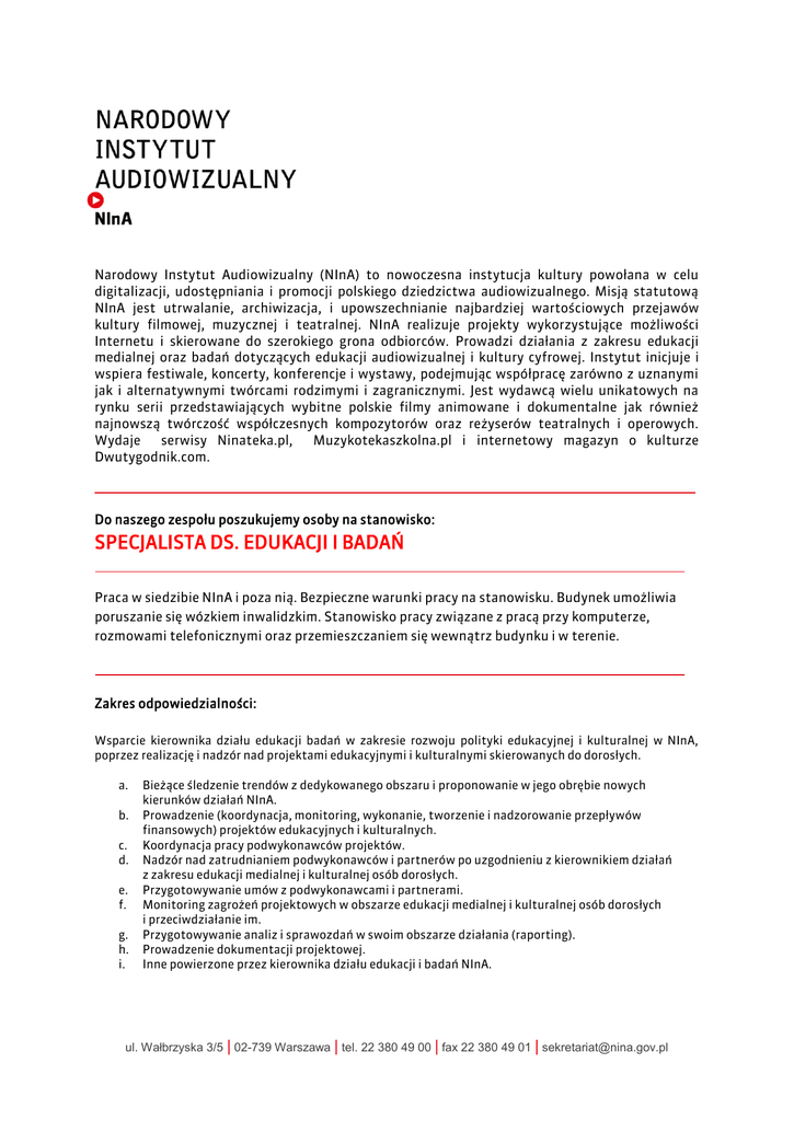 Narodowy Instytut Audiowizualny (NInA) to nowoczesna instytucja kultury powołana w celu digitalizacji, udostępniania i promocji polskiego dziedzictwa audiowizualnego. Misją statutową NInA jest utrwalanie, archiwizacja, i upowszechnianie najbardziej wartościowych przejawów kultury filmowej, muzycznej i teatralnej. NInA realizuje projekty wykorzystujące możliwości Internetu i skierowane do szerokiego grona odbiorców. Prowadzi działania z zakresu edukacji medialnej oraz badań dotyczących edukacji audiowizualnej i kultury cyfrowej. Instytut inicjuje i wspiera festiwale, koncerty, konferencje i wystawy, podejmując współpracę zarówno z uznanymi jak i alternatywnymi twórcami rodzimymi i zagranicznymi. Jest wydawcą wielu unikatowych na rynku serii przedstawiających wybitne polskie filmy animowane i dokumentalne jak również najnowszą twórczość współczesnych kompozytorów oraz reżyserów teatralnych i operowych. Wydaje serwisy Ninateka.pl, Muzykotekaszkolna.pl i internetowy magazyn o kulturze Dwutygodnik.com. Do naszego zespołu poszukujemy osoby na stanowisko: SPECJALISTA DS. EDUKACJI I BADAŃ Praca w siedzibie NInA i poza nią. Bezpieczne warunki pracy na stanowisku. Budynek umożliwia poruszanie się wózkiem inwalidzkim. Stanowisko pracy związane z pracą przy komputerze, rozmowami telefonicznymi oraz przemieszczaniem się wewnątrz budynku i w terenie. Zakres odpowiedzialności: Wsparcie kierownika działu edukacji badań w zakresie rozwoju polityki edukacyjnej i kulturalnej w NInA, poprzez realizację i nadzór nad projektami edukacyjnymi i kulturalnymi skierowanych do dorosłych. a. b. c. d. e. f. g. h. i. Bieżące śledzenie trendów z dedykowanego obszaru i proponowanie w jego obrębie nowych kierunków działań NInA. Prowadzenie (koordynacja, monitoring, wykonanie, tworzenie i nadzorowanie przepływów finansowych) projektów edukacyjnych i kulturalnych. Koordynacja pracy podwykonawców projektów. Nadzór nad zatrudnianiem podwykonawców i partnerów po uzgodnieniu z kierownikiem działań z zakresu edukacji medialnej i kulturalnej osób dorosłych. Przygotowywanie umów z podwykonawcami i partnerami. Monitoring zagrożeń projektowych w obszarze edukacji medialnej i kulturalnej osób dorosłych i przeciwdziałanie im. Przygotowywanie analiz i sprawozdań w swoim obszarze działania (raporting). Prowadzenie dokumentacji projektowej. Inne powierzone przez kierownika działu edukacji i badań NInA. ul. Wałbrzyska 3/5 | 02-739 Warszawa | tel. 22 380 49 00 | fax 22 380 49 01 | [email protected] Wymagania stanowiska: a. b. c. d. e. f. g. Wysokie umiejętności zarządzania projektami – wymagane min. 12 miesięczne doświadczenie w samodzielnej koordynacji projektów. Wykształcenie - studia uniwersyteckie lub równorzędna szkoła wyższa. Dobra znajomość środowiska nowych mediów i charakteru działań związanych z edukacją i edukacją kulturalną. Doświadczenie - więcej niż 2 lata – pracy w organizacjach związanych kulturą. Języki obce – wymagana znajomość języka obcego, preferowany j. angielski Wysoka kreatywność Umiejętność syntezy i analizy treści. Oferujemy: Umowę o pracę w państwowej, nowoczesnej instytucji kultury, Pracę w zaangażowanym i zmotywowanym zespole, Możliwość rozwoju zawodowego. Proces rekrutacji na w/w stanowisko będzie dwuetapowy. Etap pierwszy obejmuje analizę przesłanych zgłoszeń kandydatów w kontekście potrzeb organizacji i kontakt e-mailowy w wybranymi osobami. Etap drugi będzie polegał na rozmowie kwalifikacyjnej i wyborze osoby na wskazane w ogłoszeniu stanowisko. Wymagane dokumenty: CV z podanym przebiegiem nauki i pracy zawodowej List motywacyjny Oświadczenie o wyrażeniu zgody na przetwarzanie swoich danych osobowych zawartych w ofercie pracy dla potrzeb rekrutacji, zgodnie z ustawą z dnia 29.07.1997 o ochronie danych osobowych Dz.U. z 2002 r. Nr 101, poz. . 926 ze zm." Oświadczenie o prawdziwości danych zawartych w dokumentach aplikacyjnych : Potwierdzam prawdziwość powyższych danych i zgadzam się na podejmowanie czynności mających na celu ich weryfikację Oferty prosimy wysyłać na adres: [email protected] do dnia 10 sierpnia 2016 r. z dopiskiem „Rekrutacja” w tytule wiadomości. Informujemy, że skontaktujemy się z wybranymi osobami. ul. Wałbrzyska 3/5 | 02-739 Warszawa | tel. 22 380 49 00 | fax 22 380 49 01 | [email protected]