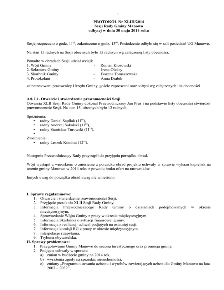 1 PROTOKÓŁ Nr XLIII/2014 Sesji Rady Gminy Manowo odbytej w dniu 30 maja 2014 roku Sesję rozpoczęto o godz. 1105, zakończono o godz. 1305. Posiedzenie odbyło się w sali posiedzeń UG Manowo. Na stan 15 radnych na Sesji obecnych było 15 radnych wg załączonej listy obecności. Ponadto w obradach Sesji udział wzięli: 1. Wójt Gminy 2. Sekretarz Gminy 3. Skarbnik Gminy 4. Protokolant - Roman Kłosowski Irena Oleksy Bożena Tomaszewska Anna Drabik zainteresowani pracownicy Urzędu Gminy, goście zaproszeni oraz sołtysi wg załączonych list obecności. Ad. I.1. Otwarcie i stwierdzenie prawomocności Sesji Otwarcia XLII Sesji Rady Gminy dokonał Przewodniczący Jan Prus i na podstawie listy obecności stwierdził prawomocność Sesji. Na stan 15, obecnych było 12 radnych. Spóźnienia: • radny Daniel Sapilak (1107), • radny Andrzej Sokalski (1112), • radny Stanisław Turowski (1115). • Zwolnienia: • radny Leszek Kondrat (1245). Następnie Przewodniczący Rady przystąpił do przyjęcia porządku obrad. Wójt wystąpił z wnioskiem o zniesienie z porządku obrad projektu uchwały w sprawie wykazu kąpielisk na terenie gminy Manowo w 2014 roku z powodu braku ofert na ratowników. Innych uwag do porządku obrad uwag nie wniesiono. I. Sprawy regulaminowe: 1. Otwarcie i stwierdzenie prawomocności Sesji. 2. Przyjęcie protokołu XLII Sesji Rady Gminy. 3. Informacja Przewodniczącego Rady Gminy o działaniach podejmowanych w okresie międzysesyjnym. 4. Sprawozdanie Wójta Gminy z pracy w okresie międzysesyjnym. 5. Informacja Skarbnika o sytuacji finansowej gminy. 6. Informacja z realizacji uchwał podjętych na ostatniej sesji. 7. Informacja komisji RG z pracy w okresie międzysesyjnym. 8. Interpelacje i zapytania. 9. Trybuna obywatelska. II. Sprawy problemowe: 1. Przygotowanie Gminy Manowo do sezonu turystycznego oraz promocja gminy. 2. Podjęcie uchwały w sprawie: a) zmian w budżecie gminy na 2014 rok, b) wyrażenia zgody na sprzedaż nieruchomości, c) zmiany „Programu usuwania azbestu i wyrobów zawierających azbest dla Gminy Manowo na lata 2007 – 2032”, 2 d) zmieniająca uchwałę w sprawie podziału Gminy Manowo na okręgi wyborcze, ustalenia ich granic i numerów oraz liczby radnych wybieranych w każdym okręgu, e) ustalenia opłat za usługi świadczone przez przedszkola prowadzone przez Gminę Manowo. 3. Wolne wnioski i informacje. 4. Odpowiedzi na interpelacje. 5. Zakończenie. Ad. I. 2. Przyjęcie protokołu XLII Sesji Rady Gminy Protokół XLII sesji przyjęty został 11 głosami za, przy 2 wstrzymujących się. Ad. I. 3 Informacja Przewodniczącego Rady Gminy o działaniach podejmowanych w okresie międzysesyjnym Jan Prus – Przewodniczący Rady poinformował, że w okresie międzysesyjnym zajmował się następującymi sprawami: 9, 16 i 23 maja pełniłem dyżur w UG Manowo. 26 kwietnia w kościele w Manowie uczestniczyłem w uroczystym koncercie z okazji 5 rocznicy powstania żeńskiego Chóru Kameralnego KANON z Cewlina. Również w tym dniu odbył się I wiosenny bieg – Manowo 2014. 1 maja uczestniczyłem w biegach organizowanych przez Stowarzyszenie Forma Rosnowo. 2 maja brałem udział w Majówce z Flagą w Cewlinie. 4 maja brałem udział w obchodach Dni Wyszewa. 16 maja uczestniczyłem w uroczystości wręczenia medali za długoletnie pożycie małżeńskie p. Danieli i Aleksandrowi Fil z Wyszewa oraz Bernardowi i Jadwidze Bobrowicz z Rosnowa. 17 maja brałem udział w rozpoczęciu sezonu turystycznego na Kamiennych Kręgach. 23 maja uczestniczyłem we wspólnym posiedzeniu stałych Komisji Rady Gminy Manowo. Ad. I. 4 Sprawozdanie Wójta Gminy z pracy w okresie międzysesyjnym Wójt przekazał następujące informacje: Aktualnie realizujemy 2 inwestycje: • Wodociąg w Wyszewie. • Adaptacja mieszkań komunalnych w Boninie - prace są już na ukończeniu. Podpisałem dwie umowy z p. Marszałkiem: • Fotowoltaika na dwa obiekty: sala gimnastyczna w Manowie i budynek sportowy na stadionie w Manowie, • Sieć wodociągową w Cewlinie (działki) i w Manowie (teren po boisku) oraz sieć kanalizacyjną w Manowie. Łącznie otrzymamy dofinansowanie ok. 700.000 zł. Odbył się przetarg na budowę drogi powiatowej w Wyszewie. Urząd Gminy Manowo jest inwestorem. Wpłynęły cztery oferty. Wygrała firma Skanska. Koszt inwestora – 3.200.000 zł, po przetargu kwota wynosi 2.286.000 zł. Do tej pory nie było odwołań od przetargu i należy się spodziewać, że bardzo szybko podpiszemy umowę. Kończymy adaptację mieszkań w Boninie, w związku z tym proszę Komisję Mieszkaniową o spotkanie 10-minutowe w przerwie sesji lub po sesji, w celu omówienia strategii przydziału mieszkań. Zapraszam Państwa na dzień 6 czerwca na godzinę 12.00 na otwarcie „Alei dębów” do Bonina (droga gminna prowadząca od starego ZDZ do Dzierżęcinki). Zostało posadzonych 187 dębów. Ad. I. 5. Informacja Skarbnika o sytuacji finansowej gminy Informację o stanie finansowym Gminy przedstawiła Bożena Tomaszewska – skarbnik gminy. Informacja stanowi załącznik do protokołu. Radny Sławomir Jamka: niepokojące są wysokie zaległości w stosunku do firmy Energa – ponad 125.000 zł i ok. 70.000 zł oraz w stosunku do MWiK i PKS. Jakie są perspektywy uregulowania tych zobowiązań? 3 Bożena Tomaszewska – skarbnik gminy: będziemy się starali te zobowiązania po jednej lub dwóch fakturach płacić na bieżąco. MWiK otrzymało od nas teraz częściowo środki zaległe za 2013 rok, natomiast zwiększyły się bieżące zobowiązania. Z PKS jest bardzo dużo rachunków, musimy w czerwcu zapłacić chociaż jedną fakturę. Wójt: jeśli chodzi o PKS, to jestem cały czas w kontakcie z p. główną księgową. Sytuacja jest bardzo trudna. Ad. I. 6. Informacja z realizacji uchwał podjętych na ostatniej sesji Roman Kłosowski – Wójt Gminy przedstawił informację z realizacji uchwał podjętych na ostatniej sesji: Lp. 1. Nr uchwały, Data uchwały