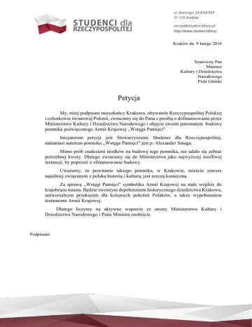 ul. Batorego 25/834/909 31-135 Kraków [email protected] http://www.studencidlarp. pl Kraków dn. 9 lutego 2016 Szanowny Pan Minister Kultury i Dziedzictwa Narodowego Piotr Gliński Petycja My, niżej podpisani mieszkańcy Krakowa, obywatele Rzeczypospolitej Polskiej i członkowie światowej Polonii, zwracamy się do Pana z prośbą o dofinansowanie przez Ministerstwo Kultury i Dziedzictwa Narodowego i objęcie swoim patronatem budowy pomnika poświęconego Armii Krajowej ,,Wstęga Pamięci". Inicjatorem petycji jest Stowarzyszenie Studenci dla Rzeczypospolitej, natomiast autorem pomnika ,,Wstęga Pamięci" jest p. Alexander Smaga. Mimo prób znalezieni środków na budowę tego pomnika, nie udało się zebrać potrzebnej kwoty. Dlatego zwracamy się do Ministerstwa jako najwyższej możliwej instancji, by poprosić o sfinansowanie budowy. Uważamy, że powstanie takiego pomnika, w Krakowie, mieście zawsze najsilniej związanym z polską historią i kulturą, jest rzeczą konieczną. Za sprawą ,,Wstęgi Pamięci" symbolika Armii Krajowej na stałe wejdzie do krajobrazu miasta. Będzie swoistym dopełnieniem historycznego dziedzictwa Krakowa, uniwersalnym przekazem dla kolejnych pokoleń Polaków, a także wypełnieniem testamentu Armii Krajowej. Dlatego liczymy na aktywne wsparcie ze strony Ministerstwa Kultury i Dziedzictwa Narodowego i Pana Ministra osobiście. Podpisano:
