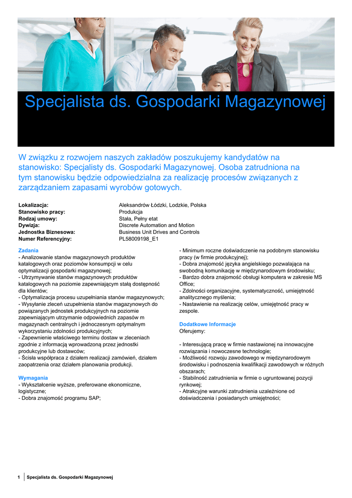 Specjalista ds. Gospodarki Magazynowej W związku z rozwojem naszych zakładów poszukujemy kandydatów na stanowisko: Specjalisty ds. Gospodarki Magazynowej. Osoba zatrudniona na tym stanowisku będzie odpowiedzialna za realizację procesów związanych z zarządzaniem zapasami wyrobów gotowych. Lokalizacja: Stanowisko pracy: Rodzaj umowy: Dywizja: Jednostka Biznesowa: Numer Referencyjny: Aleksandrów Łódzki, Lodzkie, Polska Produkcja Stała, Pełny etat Discrete Automation and Motion Business Unit Drives and Controls PL58009198_E1 Zadania - Analizowanie stanów magazynowych produktów katalogowych oraz poziomów konsumpcji w celu optymalizacji gospodarki magazynowej; - Utrzymywanie stanów magazynowych produktów katalogowych na poziomie zapewniającym stałą dostępność dla klientów; - Optymalizacja procesu uzupełniania stanów magazynowych; - Wysyłanie zleceń uzupełnienia stanów magazynowych do powiązanych jednostek produkcyjnych na poziomie zapewniającym utrzymanie odpowiednich zapasów m magazynach centralnych i jednoczesnym optymalnym wykorzystaniu zdolności produkcyjnych; - Zapewnienie właściwego terminu dostaw w zleceniach zgodnie z informacją wprowadzoną przez jednostki produkcyjne lub dostawców; - Ścisła współpraca z działem realizacji zamówień, działem zaopatrzenia oraz działem planowania produkcji. Wymagania - Wykształcenie wyższe, preferowane ekonomiczne, logistyczne; - Dobra znajomość programu SAP; 1 Specjalista ds. Gospodarki Magazynowej - Minimum roczne doświadczenie na podobnym stanowisku pracy (w firmie produkcyjnej); - Dobra znajomość języka angielskiego pozwalająca na swobodną komunikację w międzynarodowym środowisku; - Bardzo dobra znajomość obsługi komputera w zakresie MS Office; - Zdolności organizacyjne, systematyczność, umiejętność analitycznego myślenia; - Nastawienie na realizację celów, umiejętność pracy w zespole. Dodatkowe Informacje Oferujemy: - Interesującą pracę w firmie nastawionej na innowacyjne rozwiązania i nowoczesne technologie; - Możliwość rozwoju zawodowego w międzynarodowym środowisku i podnoszenia kwalifikacji zawodowych w różnych obszarach; - Stabilność zatrudnienia w firmie o ugruntowanej pozycji rynkowej; - Atrakcyjne warunki zatrudnienia uzależnione od doświadczenia i posiadanych umiejętności; - Miłą atmosferę pracy. Informacje dodatkowe: Osoby zainteresowane prosimy o przesyłanie CV za pośrednictwem naszej strony klikając na przycisk „Aplikuj”. Zastrzegamy sobie prawo odpowiedzi wyłącznie na wybrane oferty. Wszystkie oferty powinny zawierać klauzulę: „Wyrażam zgodę na przetwarzanie moich danych osobowych zawartych w ofercie pracy zgodnie z Ustawą z dnia 29 sierpnia 1997 o ochronie danych osobowych (tekst jednolity Dz. U. 2002.101.926. z późn. zm.) dla potrzeb niezbędnych do realizacji procesu rekrutacji”. ABB (www.abb.com) jest liderem w technologiach dla energetyki i automatyki, które pozwalają klientom przemysłowym oraz zakładom użyteczności publicznej zwiększyć swoją efektywność, jednocześnie minimalizując oddziaływanie na środowisko naturalne. Grupa ABB zatrudnia około 140 000 pracowników w blisko 100 krajach świata. Our ambition. Your legacy. 2 Specjalista ds. Gospodarki Magazynowej