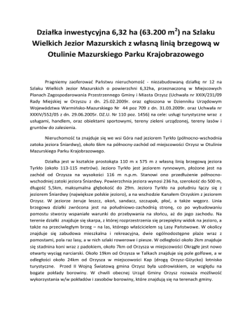 Działka inwestycyjna 6,32 ha (63.200 m2) na Szlaku Wielkich Jezior Mazurskich z własną linią brzegową w Otulinie Mazurskiego Parku Krajobrazowego Pragniemy zaoferować Państwu nieruchomość - niezabudowaną działkę nr 12 na Szlaku Wielkich Jezior Mazurskich o powierzchni 6,32ha, przeznaczoną w Miejscowych Planach Zagospodarowania Przestrzennego Gminy i Miasta Orzysz (Uchwała nr XXIX/231/09 Rady Miejskiej w Orzyszu z dn. 25.02.2009r. oraz ogłoszona w Dzienniku Urzędowym Województwa Warmińsko-Mazurskiego Nr 44 poz 709 z dn. 31.03.2009r. oraz Uchwała nr XXXIV/552/05 z dn. 29.06.2005r. DZ.U. Nr 110 poz. 1456) na cele: usługi turystyczne wraz z usługami, handlem, oraz obiektami sportowymi, tereny zieleni urządzonej, tereny lasów i gruntów do zalesienia. Nieruchomość ta znajduje się we wsi Góra nad jeziorem Tyrkło (północno-wschodnia zatoka jeziora Śniardwy), około 6km na północny-zachód od miejscowości Orzysz w Otulinie Mazurskiego Parku Krajobrazowego. Działka jest w kształcie prostokąta 110 m x 575 m z własną linią brzegową jeziora Tyrkło (około 113-115 metrów). Jezioro Tyrkło jest jeziorem rynnowym, płożone jest na zachód od Orzysza na wysokości 116 m n.p.m. Stanowi ono przedłużenie północnowschodniej zatoki jeziora Śniardwy. Powierzchnia jeziora wynosi 236 ha, szerokość do 500 m, długość 5,5km, maksymalna głębokość do 29m. Jezioro Tyrkło na południu łączy się z jeziorem Śniardwy (największe polskie jezioro), a na wschodzie Kanałem Orzyskim z jeziorem Orzysz. W jeziorze żeruje leszcz, okoń, sandacz, szczupak, płoć, a także węgorz. Linia brzegowa działki zwrócona jest na południowo-zachodnią stronę, co po wybudowaniu pomostu stworzy wspaniałe warunki do przebywania na słońcu, aż do jego zachodu. Na terenie działki znajduje się skarpa, z której rozprzestrzenia się przepiękny widok na jezioro, a także na przeciwległym brzeg – na las, którego właścicielem są Lasy Państwowe. W okolicy znajduje się zabudowa mieszkalna i rekreacyjna, dwie ogólnodostępne plaże wraz z pomostami, pola raz lasy, a w nich szlaki rowerowe i piesze. W odległości około 2km znajduje się stadnina koni wraz z padokiem, około 7km od Orzysza w miejscowości Okrągłe jest nowo otwarty wyciąg narciarski. Około 19km od Orzysza w Talkach znajduje się pole golfowe, a w odległości około 24km od Orzysza w miejscowości Kap (drogą Orzysz-Giżycko) lotnisko turystyczne. Przed II Wojną Światową gmina Orzysz była uzdrowiskiem, ze względu na bogate pokłady borowiny. W chwili obecnej Urząd Gminy Orzysz rozważa możliwość wykorzystania w/w pokładów i zasobów borowiny, które znajdują się na terenach gminy. Miasto i gmina Orzysz liczą około 10 000 mieszkańców. Miasto Orzysz leży przy głównych szlakach komunikacyjnych Mazur. Do Mikołajek jest około 32km, Giżycka około 31km i do miasta Pisz 24km. Warunki i możliwości zabudowy zgodnie z Planem Zagospodarowania Przestrzennego działki nr 13. 1/. Część – 3 UT i 4 UT: a/. 3 UT – 3420 m. km. powierzchnia działki b/. 4 UT – 3600 m. km. powierzchnia działki 3UT + 4UT = 3420+3600=7020 m. km. powierzchnia działek Pod zabudowę: 7020 m. kw. * 35% = 2400 m. kw. Parter: 2400 m. kw. I kondygnacja: 2400 m. kw. II kondygnacja: 2400 m. kw. Antresola/III kon.: 2400 m. kw. – 12,5% (na schody) = 2100 m. kw. RAZEM: 9300 m. kw. budowli naziemnej + 2400 m. kw. garaże CAŁOŚĆ: 11700 m. kw. 2/. Część – 6 UT i 8 UT a/. 6 UT – 6400 m. km. powierzchnia działki b/. 8 UT – 6400 m. km. powierzchnia działki 6 UT: Pod zabudowę: 6400 m. kw. * 35% = 2240 m. kw. Parter: 2240 m. kw. I kondygnacja: 2240 m. kw. II kondygnacja: 2240 m. kw. Antresola/III kon.: 2240 m. kw. – 12,5% (na schody) = 1960 m. kw. RAZEM: 8680 m. kw. budowli naziemnej + 2240 m. kw. garaże CAŁOŚĆ: 10920 m. kw. 8 UT: j.w. 6 UT + 8 UT = 8680 m. kw. budowli naziemnej + 8680 m. kw. = 17360 m. kw. budowli naziemnej Całość z garażami: 10920 m. kw. + 10920 m. kw. = 21840 m . kw. 3/. Część – 10 UT 10 UT – 7600 m. kw. powierzchni działki: Pod zabudowę: 7600 m. kw. * 30% = 2280 m. kw. Parter: 2280 m. kw. I kondygnacja: 2280 m. kw. Antresola/II kon.: 2280 m. kw. – 12,5% (na schody) = 1995 m. kw. RAZEM: 6555 m. kw. budowli naziemnej + 2280 m. kw. garaże CAŁOŚĆ: 8835 m. kw. 4/. Część – 11 UT 11 UT – 5100 m. kw. powierzchni działki: Pod zabudowę: 5100 m. kw. * 30% = 1530 m. kw. Parter: 1530 m. kw. I kondygnacja: 1530 m. kw. Antresola/II kon.: 1530 m. kw. – 12,5% (na schody) = 1340 m. kw. RAZEM: 4400 m. kw. budowli naziemnej + 1530 m. kw. garaże CAŁOŚĆ: 5930 m. kw. 5/. Część 1ZP: Zieleń urządzona, obiekty małej architektury. 6/. Część 2ZP, 5ZP, 7ZP, 9ZP Zieleń urządzona, obiekty małej architektury, terenowe urządzenia sportowe. 7/. Część ZL: Tereny lasów i gruntów do zalesienia. Powierzchnia całkowita wraz z garażami: 11700 m. kw. + 10920 m. kw. + 8835 m. kw. + 5930 m. kw. = 48305 m. kw. Powierzchnia naziemna-użytkowa: 9300 m .kw. + 8680 m. kw. + 6555 m. kw. + 4400 m. kw. = 37615 m. kw. Powierzchnia użytkowo-mieszkalna PUM: 37615 m. kw. – 25% = 28212 m. kw. PUM Media: Prąd, wodociąg i kanalizacja gminna. Dojazd: Orzysz-Góra droga asfaltowa, ostatnie 200 metrów droga gminna piaszczysta. Własność i stan prawny: Właścicielami nieruchomości są dwie osoby fizyczne (małżeństwo). Nieruchomość ta jest własnością hipoteczną i nie jest obciążona żadnymi zobowiązaniami, długami, ani prawami osób trzecich. Serdecznie polecamy Państwu w/w nieruchomość pod aparthotel, hotel, ośrodek wypoczynkowy spa, a także pod centrum konferencyjno-sportowe ze względów lokalizacyjnych, turystycznych (żeglarstwo, jeździectwo konne, golf, narty wodne i zimowe, turystyka rowerowa i piesza, lotnictwo, wędkarstwo itd.), a także ze względu na bardzo dobre warunki zabudowy w tym i kubaturowych obiektów sportowych. Dodając do tego piękn
