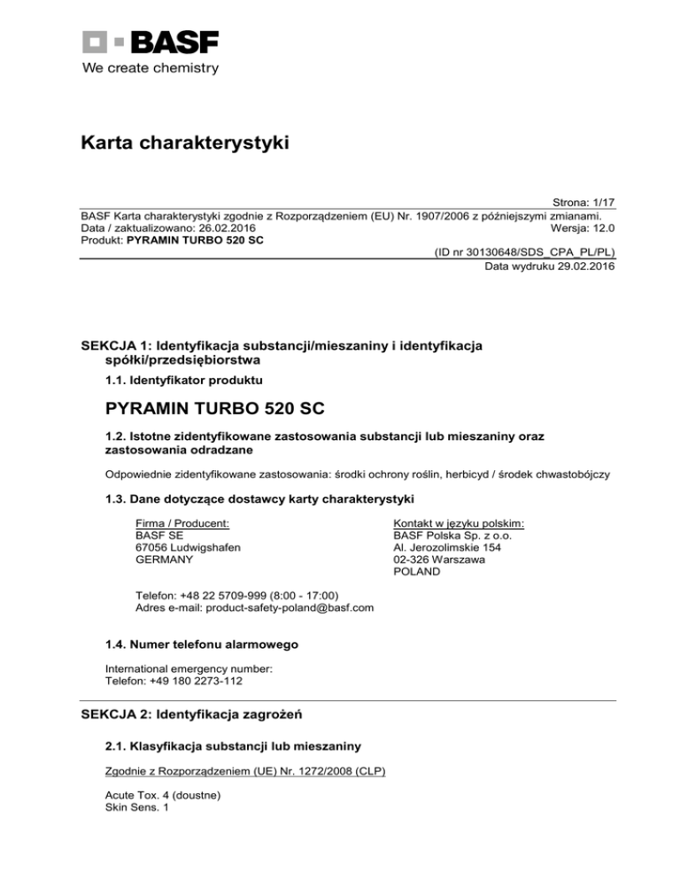 Karta charakterystyki Strona: 1/17 BASF Karta charakterystyki zgodnie z Rozporządzeniem (EU) Nr. 1907/2006 z późniejszymi zmianami. Data / zaktualizowano: 26.02.2016 Wersja: 12.0 Produkt: PYRAMIN TURBO 520 SC (ID nr 30130648/SDS_CPA_PL/PL) Data wydruku 29.02.2016 SEKCJA 1: Identyfikacja substancji/mieszaniny i identyfikacja spółki/przedsiębiorstwa 1.1. Identyfikator produktu PYRAMIN TURBO 520 SC 1.2. Istotne zidentyfikowane zastosowania substancji lub mieszaniny oraz zastosowania odradzane Odpowiednie zidentyfikowane zastosowania: środki ochrony roślin, herbicyd / środek chwastobójczy 1.3. Dane dotyczące dostawcy karty charakterystyki Firma / Producent: BASF SE 67056 Ludwigshafen GERMANY Telefon: +48 22 5709-999 (8:00 - 17:00) Adres e-mail: [email protected] 1.4. Numer telefonu alarmowego International emergency number: Telefon: +49 180 2273-112 SEKCJA 2: Identyfikacja zagrożeń 2.1. Klasyfikacja substancji lub mieszaniny Zgodnie z Rozporządzeniem (UE) Nr. 1272/2008 (CLP) Acute Tox. 4 (doustne) Skin Sens. 1 Kontakt w języku polskim: BASF Polska Sp. z o.o. Al. Jerozolimskie 154 02-326 Warszawa POLAND Strona: 2/17 BASF Karta charakterystyki zgodnie z Rozporządzeniem (EU) Nr. 1907/2006 z późniejszymi zmianami. Data / zaktualizowano: 26.02.2016 Wersja: 12.0 Produkt: PYRAMIN TURBO 520 SC (ID nr 30130648/SDS_CPA_PL/PL) Data wydruku 29.02.2016 Aquatic Chronic 1 H302, H317, H410, EUH401 Dla wszystkich klasyfikacji nie w pełni opisanych w tej sekcji zostały podane pełne teksty w sekcji 16. 2.2. Elementy oznakowania Zgodnie z Rozporządzeniem (UE) Nr. 1272/2008 (CLP) Piktogram: Hasło ostrzegawcze.: Uwaga Zwrot informujący o zagrożeniu: H302 Działa szkodliwie po połknięciu. H317 Może powodować reakcję alergiczną skóry. H410 Działa bardzo toksycznie na organizmy wodne, powodując długotrwałe skutki. EUH401 W celu uniknięcia zagrożeń dla zdrowia ludzi i środowiska, należy postępować zgodnie z instrukcją użycia. Hasło ostrzegawcze: P201 Przed użyciem zapoznać się ze specjalnymi środkami ostrożności. Zwroty wskazujące środki ostrożności (zapobieganie): P264 Dokładnie umyć dużą ilością wody z mydłem po użyciu. P280 Stosować rękawice ochronne Zwroty wskazujące środki ostrożności (reagowanie): P301 + P312 W PRZYPADKU POŁKNIĘCIA: w przypadku złego samopoczucia skontaktować się z OŚRODKIEM ZATRUĆ lub z lekarzem. P302 + P352 W PRZYPADKU KONTAKTU ZE SKÓRĄ: umyć dużą ilością wody z mydłem. P333 + P313 W przypadku wystąpienia podrażnienia skóry lub wysypki: Zasięgnąć porady/zgłosić się pod opiekę lekarza. P391 Zebrać wyciek. Zwroty wskazujące środki ostrożności (usuwanie): P501 Zawartość/pojemnik usuwać do punktów zbiórki odpadów niebezpiecznych lub specjalnych. Zgodnie z Rozporządzeniem (UE) Nr. 1272/2008 (CLP) Strona: 3/17 BASF Karta charakterystyki zgodnie z Rozporządzeniem (EU) Nr. 1907/2006 z późniejszymi zmianami. Data / zaktualizowano: 26.02.2016 Wersja: 12.0 Produkt: PYRAMIN TURBO 520 SC (ID nr 30130648/SDS_CPA_PL/PL) Data wydruku 29.02.2016 Składniki wpływające na stopień zagrożenia wymagające etykietowania: CHLORYDAZON 2.3. Inne zagrożenia Zgodnie z Rozporządzeniem (UE) Nr. 1272/2008 (CLP) Proszę patrzeć w sekcji 12 - Wyniki oceny PBT i vPvB Jeśli w tej sekcji zostaną wymienione dodatkowe dane odnośnie pozostałych zagrożeń, które nie wpłyną na klasyfikację, muszą być dodane do ogólnych zagrożeń substancji lub mieszaniny. SEKCJA 3: Skład/informacja o składnikach 3.1. Substancje Nie znajduje zastosowania 3.2. Mieszaniny Charakterystyka chemiczna środki ochrony roślin, herbicyd / środek chwastobójczy, koncentrat zawiesinowy (SC) zawiera: chlorydazon = 520 g/l Składniki niebezpieczne (GHS) zgodnie z Rozporządzeniem (UE) nr. 1272/2008 chlorydazon Zawartość (W/W): 43,3 % Numer CAS: 1698-60-8 Numer WE: 216-920-2 Numer INDEX: 606-035-00-3 Skin Sens. 1 Aquatic Acute 1 Aquatic Chronic 1 H317, H400, H410 Odmienna klasyfikacja zgodnie z aktualna wiedzą i kryteriami Załącznika I do Rozporządzenia Nr. 1272/2008 Skin Sens. 1B Aquatic Acute 1 Aquatic Chronic 1 polikondensat kwasu fenolosulfonowego i formaldehydu jako sól sodowa Strona: 4/17 BASF Karta charakterystyki zgodnie z Rozporządzeniem (EU) Nr. 1907/2006 z późniejszymi zmianami. Data / zaktualizowano: 26.02.2016 Wersja: 12.0 Produkt: PYRAMIN TURBO 520 SC (ID nr 30130648/SDS_CPA_PL/PL) Data wydruku 29.02.2016 Zawartość (W/W): < 5 % Eye Dam./Irrit. 2 Aquatic Chronic 3 H319, H412 1,2-propandiol (glikol propylenowy) Zawartość (W/W): < 10 % Numer CAS: 57-55-6 Numer WE: 200-338-0 Numer rejestracji REACH: 012119456809-23 Dla klasyfikacji nie w pełni opisanych w tej sekcji, w tym klas zagrożenia i zwrotów wskazujących rodzaj zagrożenia, pełne brzmienie podano w sekcji 16. SEKCJA 4: Środki pierwszej pomocy 4.1. Opis środków pierwszej pomocy Zdjąć zanieczyszczoną odzież. Wdychanie: Spokój, świeże powietrze, pomoc lekarska. Kontakt ze skórą: Zmyć dokładnie wodą z mydłem. Kontakt z oczami: Płukać przez 15 min pod bieżącą wodą przy szeroko otwartych oczach. Połknięcie: Natychmiast wypłukać jamę ustną i wypić 200-300 ml wody, konsultacja lekarska. 4.2. Najważniejsze ostre i opóźnione objawy oraz skutki narażenia Symptomy: najważniejsze znane symptomy i działania zostały opisane w sekcji 2 (Oznakowanie produktu) i/lub w sekcji 11., Dalsze ważne symptomy i działania nie są dotąd znane. 4.3. Wskazania dotyczące wszelkiej natychmiastowej pomocy lekarskiej i szczególnego postępowania z poszkodowanym Postępowanie: Leczenie objawowe (detoksykacja, podtrzymywanie funkcji życiowych), nie jest znane żadne specyficzne antidotum. SEKCJA 5: Postępowanie w przypadku pożaru 5.1. Środki gaśnicze Odpowiednie środki gaśnicze: Strona: 5/17 BASF Karta charakterystyki zgodnie z Rozporządzeniem (EU) Nr. 1907/2006 z późniejszymi zmianami. Data / zaktualizowano: 26.02.2016 Wersja: 12.0