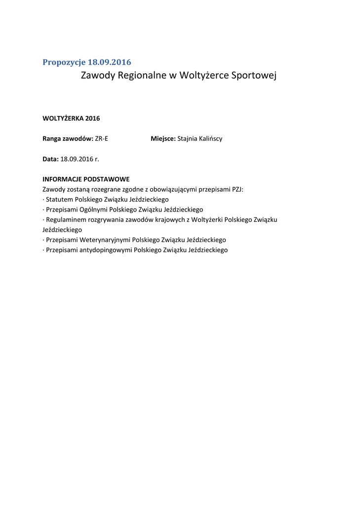 Propozycje 18.09.2016 Zawody Regionalne w Woltyżerce Sportowej WOLTYŻERKA 2016 Ranga zawodów: ZR-E Miejsce: Stajnia Kalińscy Data: 18.09.2016 r. INFORMACJE PODSTAWOWE Zawody zostaną rozegrane zgodne z obowiązującymi przepisami PZJ: · Statutem Polskiego Związku Jeździeckiego · Przepisami Ogólnymi Polskiego Związku Jeździeckiego · Regulaminem rozgrywania zawodów krajowych z Woltyżerki Polskiego Związku Jeździeckiego · Przepisami Weterynaryjnymi Polskiego Związku Jeździeckiego · Przepisami antydopingowymi Polskiego Związku Jeździeckiego Zatwierdzone w WZJ Poznań dnia: 09.09.201 – Ryszard Szymoniak WOLTYŻERKA 2016 I. INFORMACJE OGÓLNE 1. Ranga zawodów: Zawody Regionalne w Woltyżerce: ZR-E 2. Miejsce zawodów: Stajnia Kalińscy; ul. Chojnicka74, Poznań 3. Termin zawodów: 18.09.2016 r. (niedziela) 4. Organizator zawodów: LKJ Kiekrz, KS „Lotta” Lubasz 5. Komitet Organizacyjny: Przewodniczący: Mateusz Kaliński Dyrektor zawodów: Hubert Kaliński Biuro zawodów: Beata Izydor-Kułaga II. WARUNKI OGÓLNE 1. Osoby oficjalne: Komisja sędziowska: Sędzia główny zawodów: Elżbieta Dolińska Członkowie: Zuzanna Adamczyk, Agnieszka Cisek Komisarze zawodów: Alicja Borowska, Elżbieta Dolińska 2. Warunki techniczne: data: godzina: Otwarcie stajni 17.09.2016 16:00 Zebranie techniczne 18.09.2016 9:00 Zawody halowe: 18.09.2016 10:00 Arena Konkursowa Miejsce: kryta ujeżdżalnia Podłoże: piasek Wymiary: 18 m x 20 m Rozprężalnia 2 koła do lonżowania Miejsce: kryta ujeżdżalnia 18 m x 14 m odkryty lonżownik (średnica 20 m) III. WARUNKI UCZESTNICTWA 1.Uczestnictwo: Zgodnie z Art. 18 p. 1-5 i Art. 29 p. 1-2 Przepisów Ogólnych PZJ oraz Rozdział III Regulaminu Woltyżerki. 2.Zgłoszenia: Termin zgłoszeń wstępnych: 08.09.2016 Termin zgłoszeń ostatecznych: 12.09.2016 Zgłoszenia prosimy wysyłać na adres: [email protected] Zgłoszenia muszą zawierać: imię nazwisko zawodnika, rok urodzenia, nr licencji PZJ, imię i nazwisko lonżującego, nr licencji PZJ, imię i nr paszportu konia, rodzaj konkursu i kategorii 3.Warunki finansowe: Opłata organizacyjna - wpisowe: 30zł (od zawodnika) - startowe: 25zł (za 1 konkurs) Opłata organizacyjna za boks: 50zł, organizator zapewnia słomę i siano, boks dostępny od soboty 17.09.2016 r. Wraz ze zgłoszeniem ostatecznym należy przysłać kopię potwierdzenia wpłaty opłaty organizacyjnej – wpisowe za każdego zawodnika oraz w przypadku rezerwacji boksu – opłaty organizacyjnej za boks. Wpłaty należy dokonać na rachunek bankowy: ING Bank Śląski S.A. Mateusz Kaliński Chyby ul. Szamotulska 40 Konto nr 80 1050 1533 1000 0090 6482 1920 Opłata organizacyjna – wpisowe po terminie (12.09.2016) zgłoszeń ostatecznych 50zł, zmiany na listach startowych 20zł. 4.Zakwaterowanie Na koszt własny 5.Wyżywienie: Wejściówki do strefy zawodników oraz poczęstunek w ramach opłaty organizacyjnej: 1 zawodnik + 1 opiekun (w przypadku uczestnictwa zawodnika w ZR-E oraz ZT-E wydawany jest tylko jeden pakiet na obie imprezy) Pozostałe osoby towarzyszące jedynie wejście do strefy kibiców oraz wyżywienie na koszt własny – dostępne na terenie zawodów IV.RÓŻNE: 1. Kolejność startów ustalona zostanie przez Organizatora, po wpłynięciu zgłoszeń ostatecznych. Sprawdzenie dokumentów zawodników w dniu zawodów do godz. 9.00 2. Każdy szef ekipy musi przedstawić dokumenty zawodników, lonżującego oraz konia w biurze zawodów, uprawniające do startów w danych konkursach, dokumenty regulowane przepisami PZJ oraz Regulaminem Woltyżerki z aktualnymi wpisami. 3. Wraz z przesłaniem zgłoszenia wszyscy uczestnicy zawodów podporządkowują się niniejszym propozycjom oraz zarządzeniom Organizatora. 4. Zaleca się, aby konie oraz uczestnicy zawodów posiadali własne ubezpieczenie. 5. Udział w zawodach na własną odpowiedzialność lub opiekuna prawnego. Organizator nie ponosi odpowiedzialności za wypadki osób i koni. Organizator nie ponosi odpowiedzialności za nieumyślne wyrządzenie szkody, jak też czyny przestępcze osób trzecich (np. kradzieże). 6. Organizator zastrzega sobie prawo zmian wynikających z przyczyn obiektywnych, w programie zawodów. 7. Ostateczny program zawodów i lista startowa rozesłane zostaną do 16.09.2016 8. Początek konkursów 18.09.2016, godz. 10.00. Przewidywana godzina dekoracji ok. 16. V. PROGRAM ZAWODÓW Konkurs nr 1: Konkurs zespołowy Cz Program będzie wykonywany w jednej rundzie I runda: program obowiązkowy (galop w lewo) – test C, program dowolny (stęp w lewo) Konkurs nr 2: Konkurs zespołowy Dz Program będzie wykonywany w jednej rundzie I runda: program obowiązkowy (stęp w lewo) – test C, program dowolny (stęp w lewo) Konkurs nr 3: Konkurs indywidualny kobiet Ai-1* Program będzie wykonywany w jednej rundzie. I runda: program obowiązkowy (galop w lewo) – test 1, program dowolny (galop w lewo) Konkurs nr 4: Konkurs indywidualny Bi – 1* Program będzie wykonywany w jednej rundzie. I runda: program obowiązkowy (galop w lewo) – test 1, program dowolny (galop w lewo) Konkurs nr. 5: Konkurs par Cp – 1* Program będzie wykonywany w jednej rundzie. I runda: program obowiązkowy – test C(stęp w lewo), program dowolny (stęp w lewo)test 2 Konkurs nr. 6: Konkurs par Cp – 2* Program będzie wykonywany w jednej rundzie. I runda: program obowiązkowy – test C(galop w lewo), program dowolny (stęp w lewo)test 2 Programy dowolne w I rundzie będą wykonywane bezpośrednio po programach obowiązkowych, w trakcie tego samego startu. NAGRODY · Zawodnicy - nagrody rzeczowe, puchary / medale · Konie – flots · Lonżujący – medale KODEKS POSTĘPOWANIA Z KONIEM I. Polski Związek Jeździecki w ślad za Międzynarodową Federacją Jeździecką FEI oczekuje, że wszystkie osoby zaangażowane w jakikolwiek sposób w sporty konne, będą przestrzegać zasad niniejszego Kodeksu Postępowania z Koniem oraz przyjmą do wiadomości, że w każdym przyp