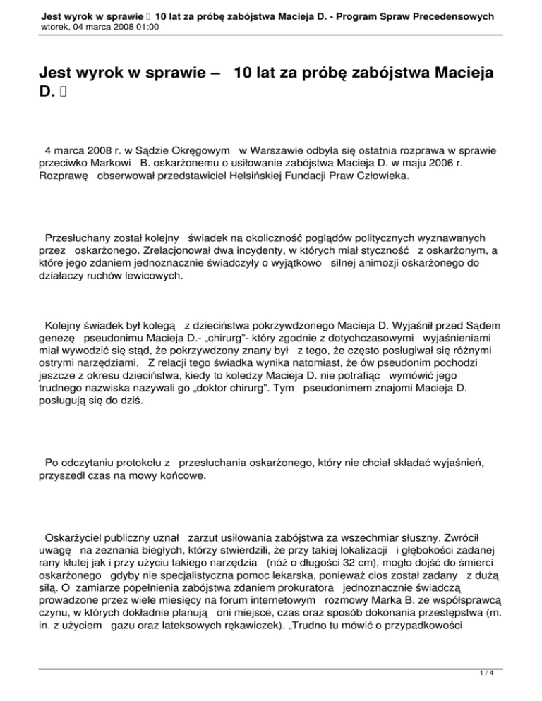 Jest wyrok w sprawie 10 lat za próbę zabójstwa Macieja D. - Program Spraw Precedensowych wtorek, 04 marca 2008 01:00 Jest wyrok w sprawie – 10 lat za próbę zabójstwa Macieja D. 4 marca 2008 r. w Sądzie Okręgowym w Warszawie odbyła się ostatnia rozprawa w sprawie przeciwko Markowi B. oskarżonemu o usiłowanie zabójstwa Macieja D. w maju 2006 r. Rozprawę obserwował przedstawiciel Helsińskiej Fundacji Praw Człowieka. Przesłuchany został kolejny świadek na okoliczność poglądów politycznych wyznawanych przez oskarżonego. Zrelacjonował dwa incydenty, w których miał styczność z oskarżonym, a które jego zdaniem jednoznacznie świadczyły o wyjątkowo silnej animozji oskarżonego do działaczy ruchów lewicowych. Kolejny świadek był kolegą z dzieciństwa pokrzywdzonego Macieja D. Wyjaśnił przed Sądem genezę pseudonimu Macieja D.- „chirurg”- który zgodnie z dotychczasowymi wyjaśnieniami miał wywodzić się stąd, że pokrzywdzony znany był z tego, że często posługiwał się różnymi ostrymi narzędziami. Z relacji tego świadka wynika natomiast, że ów pseudonim pochodzi jeszcze z okresu dzieciństwa, kiedy to koledzy Macieja D. nie potrafiąc wymówić jego trudnego nazwiska nazywali go „doktor chirurg”. Tym pseudonimem znajomi Macieja D. posługują się do dziś. Po odczytaniu protokołu z przesłuchania oskarżonego, który nie chciał składać wyjaśnień, przyszedł czas na mowy końcowe. Oskarżyciel publiczny uznał zarzut usiłowania zabójstwa za wszechmiar słuszny. Zwrócił uwagę na zeznania biegłych, którzy stwierdzili, że przy takiej lokalizacji i głębokości zadanej rany kłutej jak i przy użyciu takiego narzędzia (nóż o długości 32 cm), mogło dojść do śmierci oskarżonego gdyby nie specjalistyczna pomoc lekarska, ponieważ cios został zadany z dużą siłą. O zamiarze popełnienia zabójstwa zdaniem prokuratora jednoznacznie świadczą prowadzone przez wiele miesięcy na forum internetowym rozmowy Marka B. ze współsprawcą czynu, w których dokładnie planują oni miejsce, czas oraz sposób dokonania przestępstwa (m. in. z użyciem gazu oraz lateksowych rękawiczek). „Trudno tu mówić o przypadkowości 1/4 Jest wyrok w sprawie 10 lat za próbę zabójstwa Macieja D. - Program Spraw Precedensowych wtorek, 04 marca 2008 01:00 zdarzenia i miejsca samej rany, tak jak relacjonuje to oskarżony” - mówiła prokurator. W jej opinii zeznania świadków wskazują, że oskarżony „rażąco lekceważył wszystkich, którzy mają poglądy inne niż on sam.” Stąd prokuratura uznała, że oskarżony zdarzenie zaplanował, przygotował się do niego, i wykonał. Wniosła o uznanie winy oraz wymierzenie kary 12 lat pozbawienia wolności. Oskarżyciel posiłkowy stwierdził, że „to jedynie łud szcześcia, że pokrzywdzony jest obecny na sali rozpraw w charakterze oskarżyciela prywatnego, a nie protokołów z sekcji zwłok”. I jego zdaniem w tym przypadku nie może być mowy, że oskarżony działał przypadkowo. Jako człowiek inteligentny, wykształcony, musiał zdawać sobie sprawę, że ugodzenie nawet w udo – jak twierdził – może skutkować śmiercią. Użyte rękawiczki nie pozostawiają wątpliwości – działał z premedytacją. Postanowił wyeliminować człowieka, który był mu wrogi pod względem środowiskowym i światopoglądowym. Zdaniem oskarżyciela posiłkowego zeznania świadków uwiarygodniają przesłanki polityczne dopuszczenia się przestępstwa, mimo że nie dotyczą bezpośrednio zdarzenia na warszawskim Powiślu. Co do wcześniejszych zdarzeń z klubu Dwa Koła, gdzie pokrzywdzony miał przewodniczyć bójce, oskarżyciel twierdził, że rok po zdarzeniu nie można mówić o obronie koniecznej - oskarżony w sposób kalkulowany wykonał atak na osobie swojego przeciwnika politycznego. „Polska jako kraj doświadczony przez zbrodnie na tle ideologicznym, politycznym i rasowym, powinna w szczególny sposób napiętnować przestępstwa na tym tle. Zgodnie z orzecznictwem Europejskiego Trybunału Praw Człowieka Państwo ma obowiązek badać szczególnie wnikliwie te właśnie sprawy” - mówił adw. Mikołaj Pietrzak. W związku z tym postulował zmianę kwalifikacji prawnej czynu na art. 148 §2 pkt.3 k.k., tj. jako przestępstwo popełnione „w wyniku motywacji zasługującej na szczególne potępienie”. „To była próba zabójstwa z pobudek, które nasze społeczeństwo odrzuca w sposób stanowczy. Wyrok powinien być stosownie wysoki, ażeby odzwierciedlał motywacje oskarżonego” - podsumował. Również i obrona przekonywała do zmiany kwalifikacji prawnej czynu, na art. 156 §1 pkt.2 k.k., czyli spowodowania ciężkiego uszczerbka na zdrowiu, wymierzając oskarżonemu karę pozbawienia wolności z warunkowym zaiweszeniem jej wykonania. W ocenie obrony zdarzenie na Powiślu było niewątpliwie przypadkowe - „Oskarżony podjął nagłą decyzję, żeby tam i wtedy dać nauczkę Maciejowi D. W żadnym wypadku nie chciał odebrać mu życia. Była to swoista odpłata za zdarzenie z klubu Dwa Koła. Przecież zdarzenie miało miejsce w biały dzień, na oczach przechodnich, oskarżony miał możliwość i narzędzie, żeby wtedy odebrać mu życie, a jednak tego nie zrobił” - argumentował obrońca. Jego zdaniem oskarżony nie przewidywał śmierci Macieja D., nie godził się na taki skutek swojego czynu, a zatem nie może 2/4 Jest wyrok w sprawie 10 lat za próbę zabójstwa Macieja D. - Program Spraw Precedensowych wtorek, 04 marca 2008 01:00 być mowy o przestępstwie umyślnym jakim jest zabójstwo. Natomiast przypisywanie przyczynom tego czynu poglądów ideologicznych czy politycznych oskarżonego w żadnym stopniu nie znajduje w ocenie obrony odzwierciedlenia w zgromadzonym materiale dowodym. „Powiązanie osoby Marka B. ze stroną internetową Redwatch jest pomyłką” stwierdził obrońca. Sam oskarżony Marek B. przyznał - „Cieszę się, że w