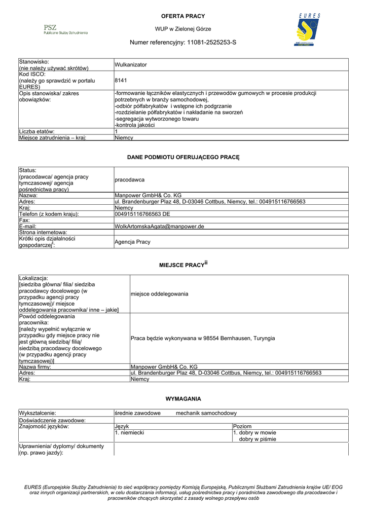 OFERTA PRACY WUP w Zielonej Górze Numer referencyjny: 11081-2525253-S Stanowisko: (nie należy używać skrótów) Kod ISCO: (należy go sprawdzić w portalu EURES) Opis stanowiska/ zakres obowiązków: Liczba etatów: Miejsce zatrudnienia – kraj: Wulkanizator 8141 -formowanie łączników elastycznych i przewodów gumowych w procesie produkcji potrzebnych w branży samochodowej, -odbiór półfabrykatów i wstępne ich podgrzanie -rozdzielanie półfabrykatów i nakładanie na sworzeń -segregacja wytworzonego towaru -kontrola jakości 1 Niemcy DANE PODMIOTU OFERUJĄCEGO PRACĘ Status: (pracodawca/ agencja pracy tymczasowej/ agencja pośrednictwa pracy) Nazwa: Adres: Kraj: Telefon (z kodem kraju): Fax: E-mail: Strona internetowa: Krótki opis działalności gospodarczeji: pracodawca Manpower GmbH& Co. KG ul. Brandenburger Plaz 48, D-03046 Cottbus, Niemcy, tel.: 004915116766563 Niemcy 004915116766563 DE [email protected] Agencja Pracy MIEJSCE PRACYii Lokalizacja: [siedziba główna/ filia/ siedziba pracodawcy docelowego (w przypadku agencji pracy tymczasowej)/ miejsce oddelegowania pracownika/ inne – jakie] Powód oddelegowania pracownika: [należy wypełnić wyłącznie w przypadku gdy miejsce pracy nie jest główną siedzibą/ filią/ siedzibą pracodawcy docelowego (w przypadku agencji pracy tymczasowej)] Nazwa firmy: Adres: Kraj: miejsce oddelegowania Praca będzie wykonywana w 98554 Bernhausen, Turyngia Manpower GmbH& Co. KG ul. Brandenburger Plaz 48, D-03046 Cottbus, Niemcy, tel.: 004915116766563 Niemcy WYMAGANIA Wykształcenie: Doświadczenie zawodowe: Znajomość języków: średnie zawodowe Język 1. niemiecki mechanik samochodowy Poziom 1. dobry w mowie dobry w piśmie Uprawnienia/ dyplomy/ dokumenty (np. prawo jazdy): EURES (Europejskie Służby Zatrudnienia) to sieć współpracy pomiędzy Komisją Europejską, Publicznymi Służbami Zatrudnienia krajów UE/ EOG oraz innych organizacji partnerskich, w celu dostarczania informacji, usług pośrednictwa pracy i poradnictwa zawodowego dla pracodawców i pracowników chcących skorzystać z zasady wolnego przepływu osób Inne istotne wymagania: Mile widziane doświadczenie w pracy związanej ze sprawnością manualną ( jako wulkanizator), zdolności manualne, gotowość do pracy na 3 zmiany, komunikatywna znajomość języka niemieckiego, Staż ogółem: 2.0 WYNAGRODZENIE I WARUNKI ZATRUDNIENIA Wysokość pensji brutto: Wysokość pensji netto: Waluta, w jakiej wypłacana jest pensja: Rodzaj stawki wynagrodzenia: (godzinowa/ tygodniowa/ miesięczna/ roczna/ inna) Premie: Dodatkowe świadczenia (zakwaterowanie, wyżywienie, koszty związane ze zmianą miejsca zamieszkania, koszty podróży itp.): Nazwa firmy, z którą zostanie podpisana umowa: Rodzaj umowy: (umowa o pracę, umowa zlecenia, wolontariat, praktyka zawodowa/ staż, praca zdalna, agencja pracy tymczasowej, inne): Wymiar czasu pracy (praca na pełen etat/ część etatu): Czas trwania umowy: (nieokreślony/ określony) 10,00 Liczba godzin tygodniowo: Zmiany i praca w dni wolne: Data rozpoczęcia: Inne informacje: 40,00 Praca na 3 zmiany. 2016-06-06 Praca na 3 zmiany. Euro Czasowy ze stawką godzinową tak Pracodawca pomaga w znalezieniu zakwaterowania. Gwarantuje bezpłatny dojazd z miejscowości Suhl. Manpower GmbH& Co. KG umowa o pracę pełny etat nieokreślony Data wygaśnięcia umowy (w przypadku umowy na czas określony): SPOSÓB SKŁADANIA WNIOSKU Wymagane dokumenty (list motywacyjny, CV itp.): Język, w którym muszą być sporządzone przedkładane dokumenty: Do kogo należy wysłać dokumenty: (do pracodawcy/ doradcy EURES) Gdzie należy wysłać dokumenty: (adres, adres e-mail, nr faksu z kodem kraju itp.) Dane teleadresowe doradcy EURES lub przedstawiciela pracodawcy: (nazwisko, adres, telefon, fax, e-mail itp.) CV niemiecki do pracodawcy drogą elektroniczną podając w tytule maila nazwę stanowiska Vulkanisation [email protected] DODATKOWE INFORMACJE Dodatkowych informacji udziela Pani Marta Maniarska-Wolska 0049 1726522876 WAŻNOŚĆ 2016-05-30 Data publikacji: Termin przedkładania podań o pracę / zakończenia ważności oferty: Uprzejmie informujemy, że skontaktujemy się wyłącznie z wybranymi kandydatami. UWAGA: 1. Umowa z zagranicznym pracodawcą jest zawierana, co do zasady, zgodnie z prawem kraju zatrudnienia. Oznacza to, że wszystkie roszczenia odnośnie warunków, które obejmuje umowa, można kierować wyłącznie do odpowiedniego sądu w kraju zatrudnienia. Publiczne służby zatrudnienia (EURES) nie mogą pośredniczyć ani reprezentować pracownika w sądzie kraju zatrudnienia w przypadku sporu z pracodawcą. 2. Publiczne służby zatrudnienia (EURES) dokładają wszelkich starań, aby zapewnić rzetelność i wiarygodność ofert pracy EURES (Europejskie Służby Zatrudnienia) to sieć współpracy pomiędzy Komisją Europejską, Publicznymi Służbami Zatrudnienia krajów UE/ EOG oraz innych organizacji partnerskich, w celu dostarczania informacji, usług pośrednictwa pracy i poradnictwa zawodowego dla pracodawców i pracowników chcących skorzystać z zasady wolnego przepływu osób zgłoszonych w lokalnym urzędzie pracy. Należy wyjaśnić, że oferta pracy została zgłoszona przez stronę trzecią i EURES nie odpowiada za ewentualne rozbieżności między warunkami pracy określonymi w ofercie pracy i warunkami oferowanymi przez potencjalnego pracodawcę. 3. Publiczne służby zatrudnienia (EURES) informują, że będą zbierać, przetwarzać i przekazywać potencjalnym pracodawcom zgodnie z przepisami dotyczącymi ochrony danych osobowych wszystkie dane osobowe dostarczone przez osoby poszukujące pracy. iInformacje o firmie, takie jak: status prawny, sektor, typ działalności, rodzaj produktów lub świadczonych usług, data rozpoczęcia działalności gospodarczej, liczba pracowników itp. iiMiejsce, w którym będzie wykonywana praca. Należy wypełnić w przypadku gdy: 1) miejsce wykonywania pracy jest inne niż 