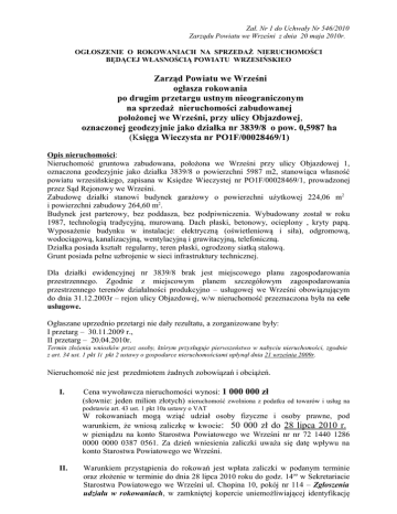 Zał. Nr 1 do Uchwały Nr 546/2010 Zarządu Powiatu we Wrześni z dnia 20 maja 2010r. OGŁOSZENIE O ROKOWANIACH NA SPRZEDAŻ NIERUCHOMOŚCI BĘDĄCEJ WŁASNOŚCIĄ POWIATU WRZESIŃSKIEO Zarząd Powiatu we Wrześni ogłasza rokowania po drugim przetargu ustnym nieograniczonym na sprzedaż nieruchomości zabudowanej położonej we Wrześni, przy ulicy Objazdowej, oznaczonej geodezyjnie jako działka nr 3839/8 o pow. 0,5987 ha (Księga Wieczysta nr PO1F/00028469/1) Opis nieruchomości: Nieruchomość gruntowa zabudowana, położona we Wrześni przy ulicy Objazdowej 1, oznaczona geodezyjnie jako działka 3839/8 o powierzchni 5987 m2, stanowiąca własność powiatu wrzesińskiego, zapisana w Księdze Wieczystej nr PO1F/00028469/1, prowadzonej przez Sąd Rejonowy we Wrześni. Zabudowę działki stanowi budynek garażowy o powierzchni użytkowej 224,06 m2 i powierzchni zabudowy 264,60 m2. Budynek jest parterowy, bez poddasza, bez podpiwniczenia. Wybudowany został w roku 1987, technologią tradycyjną, murowaną. Dach płaski, betonowy, ocieplony , kryty papą. Wyposażenie budynku w instalacje: elektryczną (oświetleniową i siła), odgromową, wodociągową, kanalizacyjną, wentylacyjną i grawitacyjną, telefoniczną. Działka posiada kształt regularny, teren płaski, ogrodzony siatką stalową. Grunt posiada pełne uzbrojenie w sieci infrastruktury technicznej. Dla działki ewidencyjnej nr 3839/8 brak jest miejscowego planu zagospodarowania przestrzennego. Zgodnie z miejscowym planem szczegółowym zagospodarowania przestrzennego terenów działalności produkcyjno – usługowej we Wrześni obowiązującym do dnia 31.12.2003r – rejon ulicy Objazdowej, w/w nieruchomość przeznaczona była na cele usługowe. Ogłaszane uprzednio przetargi nie dały rezultatu, a zorganizowane były: I przetarg – 30.11.2009 r., II przetarg – 20.04.2010r. Termin złożenia wniosków przez osoby, którym przysługuje pierwszeństwo w nabyciu nieruchomości, zgodnie z art. 34 ust. 1 pkt 1i pkt 2 ustawy o gospodarce nieruchomościami upłynął dnia 21 września 2009r. Nieruchomość nie jest przedmiotem żadnych zobowiązań i obciążeń. I. Cena wywoławcza nieruchomości wynosi: 1 000 000 zł (słownie: jeden milion złotych) nieruchomość zwolniona z podatku od towarów i usług na podstawie art. 43 ust. 1 pkt 10a ustawy o VAT W rokowaniach mogą wziąć udział osoby fizyczne i osoby prawne, pod warunkiem, że wniosą zaliczkę w kwocie: 50 000 zł do 28 lipca 2010 r. w pieniądzu na konto Starostwa Powiatowego we Wrześni nr nr 72 1440 1286 0000 0000 0387 0561. Za dzień wniesienia zaliczki uważa się datę wpływu na konto Starostwa Powiatowego we Wrześni. II. Warunkiem przystąpienia do rokowań jest wpłata zaliczki w podanym terminie oraz złożenie w terminie do dnia 28 lipca 2010 roku do godz. 14oo w Sekretariacie Starostwa Powiatowego we Wrześni ul. Chopina 10, pokój nr 114 – Zgłoszenia udziału w rokowaniach, w zamkniętej kopercie uniemożliwiającej identyfikację zgłaszającego z napisem „ROKOWANIA – Września, ul. Objazdowa; nie otwierać” III. Zgłoszenie winno zawierać: 1. Imię, nazwisko i adres, albo nazwę lub firmę oraz siedzibę jeżeli zgłaszającym jest osoba prawna lub inny podmiot prowadzący działalność gospodarczą. 2. Datę sporządzenia zgłoszenia, 3. Oświadczenie, że zgłaszający zapoznał się z warunkami rokowań i przyjmuje te warunki bez zastrzeżeń, 4. Proponowaną cenę przewyższającą cenę wywoławczą i sposób jej zapłaty. Do zgłoszenia należy dołączyć kopię dowodu wpłaty zaliczki. IV. Warunkiem udziału w rokowaniach jest okazanie Komisji dowodu wpłaty zaliczki w oryginale i dokumentu potwierdzającego tożsamość oraz obywatelstwo. W przypadku osób prawnych i innych podmiotów prowadzących działalność gospodarczą, konieczne jest również przedłożenie wyciągu (odpisu) z właściwego rejestru lub ewidencji działalności gospodarczej, aktualność wyciągu winna być potwierdzona przez sąd lub inny organ prowadzący rejestr w okresie nie dłuższym niż okres 3 m-cy poprzedzających datę rokowań, zgodę właściwych organów statutowych na nabycie nieruchomości objętej rokowaniami. Pełnomocnik winien nadto przedłożyć pełnomocnictwo notarialne w oryginale. W stosunku do cudzoziemców mają zastosowanie przepisy ustawy z dnia 24 marca 1920r. o nabywaniu nieruchomości przez cudzoziemców (tj. Dz. U. z 2004r., nr 167, poz. 1758 ze zm.) Rokowania odbędą się 2 sierpnia 2010 roku o godz. 10oo w budynku Starostwa Powiatowego we Wrześni, przy ulicy Chopina 10 – pokój nr 107, I piętro) W stosunku do nabywcy, zaliczkę zalicza się na poczet ceny sprzedaży, a w razie uchylenia się przez niego od zawarcia umowy, zaliczka przepada na rzecz sprzedawcy. Pozostałym uczestnikom rokowań, zaliczka zostanie niezwłocznie zwrócona, nie później jednak niż przed upływem 3 dni od dnia odpowiednio: odwołania rokowań, zamknięcia rokowań, unieważnienia rokowań, zakończenia rokowań wynikiem negatywnym. Cena nieruchomości płatna będzie jednorazowo, tak aby w przeddzień zawarcia aktu notarialnego znajdowała się na koncie sprzedającego. Organizator rokowań zawiadomi osobę ustaloną jako nabywca nieruchomości o miejscu i terminie umowy notarialnej. Jeżeli osoba ustalona jako nabywca nieruchomości nie stawi się bez usprawiedliwienia w miejscu i terminie podanym w zawiadomieniu, organizator rokowań odstąpi od zawarcia umowy, a zaliczka nie będzie podlegała zwrotowi. Koszty sporządzenia umowy notarialnej oraz opłaty sądowe związane z dokonaniem wpisów w Księdze Wieczystej – ponosi nabywca. Zastrzega się prawo zamknięcia rokowań bez wybrania nabywcy nieruchomości. Bliższe informacje udziela: Wydział Geodezji, Kartografii i Nieruchomości Starostwa Powiatowego we Wrześni, pokój nr 14, tel. 061 6404413.