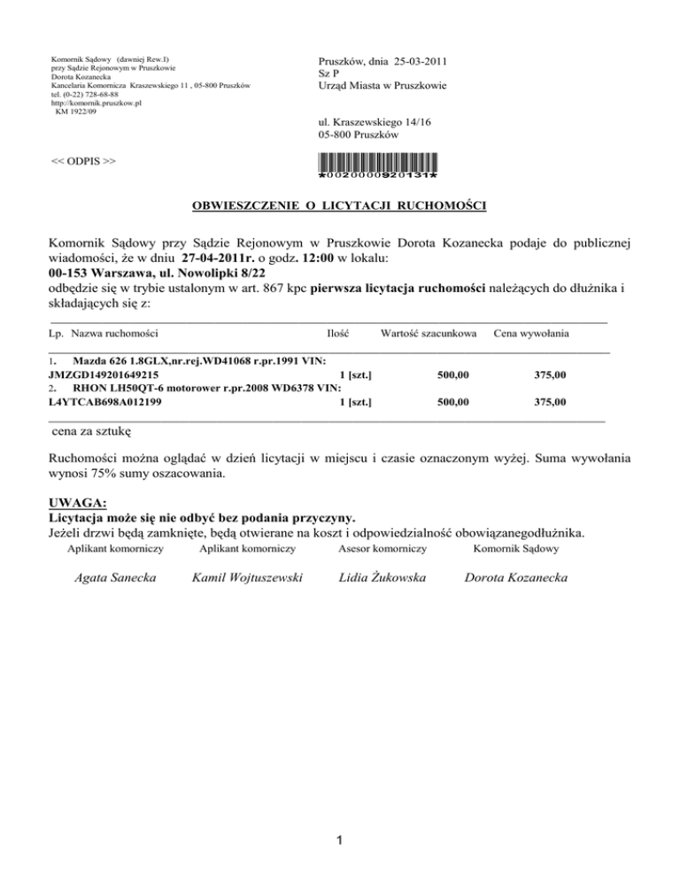 Komornik Sądowy (dawniej Rew.I) przy Sądzie Rejonowym w Pruszkowie Dorota Kozanecka Kancelaria Komornicza Kraszewskiego 11 , 05-800 Pruszków tel. (0-22) 728-68-88 http://komornik.pruszkow.pl KM 1922/09 Pruszków, dnia 25-03-2011 Sz P Urząd Miasta w Pruszkowie ul. Kraszewskiego 14/16 05-800 Pruszków *0020000920131* << ODPIS >> OBWIESZCZENIE O LICYTACJI RUCHOMOŚCI Komornik Sądowy przy Sądzie Rejonowym w Pruszkowie Dorota Kozanecka podaje do publicznej wiadomości, że w dniu 27-04-2011r. o godz. 12:00 w lokalu: 00-153 Warszawa, ul. Nowolipki 8/22 odbędzie się w trybie ustalonym w art. 867 kpc pierwsza licytacja ruchomości należących do dłużnika i składających się z: _______________________________________________________________________________________________________________________ Lp. Nazwa ruchomości Ilość Wartość szacunkowa Cena wywołania ________________________________________________________________________________________________________________________ 1. Mazda 626 1.8GLX,nr.rej.WD41068 r.pr.1991 VIN: JMZGD149201649215 1 [szt.] 2. RHON LH50QT-6 motorower r.pr.2008 WD6378 VIN: L4YTCAB698A012199 1 [szt.] 500,00 375,00 500,00 375,00 _______________________________________________________________________________________________________________________ cena za sztukę Ruchomości można oglądać w dzień licytacji w miejscu i czasie oznaczonym wyżej. Suma wywołania wynosi 75% sumy oszacowania. UWAGA: Licytacja może się nie odbyć bez podania przyczyny. Jeżeli drzwi będą zamknięte, będą otwierane na koszt i odpowiedzialność obowiązanegodłużnika. Aplikant komorniczy Aplikant komorniczy Asesor komorniczy Komornik Sądowy Agata Sanecka Kamil Wojtuszewski Lidia Żukowska Dorota Kozanecka 1