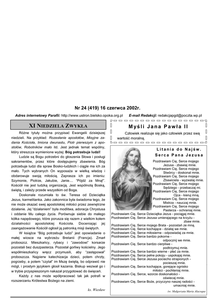 Nr 24 (419)/1 PO GÓRACH, DOLINACH... 16 czerwca 2002r. Nr 24 (419) 16 czerwca 2002r. Adres internetowy Parafii: http://www.ustron.bielsko.opoka.org.pl E-mail Redakcji: [email protected] XI NIEDZIELA ZWYKŁA M yś l i Ja na P aw ła II RóŜne tytuły moŜna przypisać Ewangelii dzisiejszej niedzieli. Na przykład: Rozesłanie apostołów, Misyjne zadania Kościoła, Imiona dwunastu, Piotr pierwszym z apostołów, Robotników mało itd. Jest jednak temat wspólny, który streszcza wymienione wyŜej: Bóg potrzebuje ludzi! Ludzie są Bogu potrzebni do głoszenia Słowa i posługi sakramentów, przez które dostępujemy zbawienia. Bóg potrzebuje ludzi dla spraw Bosko-ludzkich i ciągle ma ich za mało. Tych wybranych On wyposaŜa w wielką władzę i obdarowuje swoją miłością. Zaprasza ich po imieniu: Szymonie, Piotrze, Jakubie, Janie.... “Pójdź za Mną!”. Kościół nie jest ludzką organizacją. Jest wspólnotą Boską, świętą, i zaleŜy przede wszystkim od Boga. Doskonale rozumiała to św. Teresa od Dzieciątka Jezus, karmelitanka. Jako zakonnica była świadoma tego, Ŝe nie moŜe okazać swej apostolskiej miłości przez zewnętrzne działanie. Jej “działaniem” była modlitwa, adoracja Chrystusa i oddanie Mu całego Ŝycia. Porównuje siebie do małego kółka napędowego, które porusza się razem z wielkim kołem działalności apostolskiej Kościoła. Doceniając jej zaangaŜowanie Kościół ogłosił ją patronką misji świętych. W ksiąŜce “Bóg potrzebuje ludzi” jest opowiadanie o małej wiosce na wybrzeŜu Bretanii (Francja). Zmarł proboszcz. Mieszkańcy, rybacy i “zawodowi” korsarze pozostali bez duszpasterza. Pozostał gorliwy kościelny. Jego współmieszkańcy wręcz przymusili, aby “zastępował” proboszcza. Najpierw katechizacja dzieci, potem chrzty, pogrzeby, a potem “czytał” im Mszę świętą, bo odprawić nie mógł, i prostym językiem głosił kazania. Biskup wezwał go i w trybie przyspieszonym nakazał przygotować do święceń. KaŜdy z nas moŜe wpółpracować tak jak potrafi w rozszerzaniu Królestwa BoŜego na ziemi. Człowiek realizuje się jako człowiek przez swą wartość moralną. ks. Wiesław Litania do Najśw. Serca Pana Jezusa Pozdrawiam Cię, Serce mojego Jezusa - zbawiaj mnie. Pozdrawiam Cię, Serce mojego Stwórcy - doskonal mnie. Pozdrawiam Cię, Serce mojego Zbawiciela - wyzwalaj mnie. Pozdrawiam Cię, Serce mojego Sędziego - przebaczaj mi. Pozdrawiam Cię, Serce mojego Ojca - kieruj mną. Pozdrawiam Cię, Serce mojego Mistrza - nauczaj mnie. Pozdrawiam Cię, Serce mojego Pasterza - ochraniaj mnie. Pozdrawiam Cię, Serce Dzieciątka Jezus - pociągaj mnie. Pozdrawiam Cię, Serce Jezusa umierającego na krzyŜu zbaw mnie. Pozdrawiam Cię, Serce mojego Brata - pozostań ze mną. Pozdrawiam Cię, Serce kochające - działaj we mnie. Pozdrawiam Cię, Serce miłosierne - odpowiadaj za mnie. Pozdrawiam Cię, Serce bardzo pokorne odpocznij we mnie. Pozdrawiam Cię, Serce bardzo cierpliwe podtrzymuj mnie. Pozdrawiam Cię, Serce bardzo wierne - płać za mnie. Pozdrawiam Cię, Serce pełne pokoju - uspokajaj mnie. Pozdrawiam Cię, Serce Jezusa pociecho strapionych pocieszaj mnie. Pozdrawiam Cię, Serce kochające, gorejące ognisko miłości - pochłaniaj mnie. Pozdrawiam Cię, Serce, wzorze doskonałości oświecaj mnie. Pozdrawiam Cię, Serce BoŜe, przyczyno naszej radości umacniaj mnie. św. Małgorzata Maria Alacoque Nr 24 (419)/2 PO GÓRACH, DOLINACH... sakrament chorych Na łamach eSPe nr 56 ukazała się rozmowa kleryka M. Wilka z ks. J. Tarnawskim o sakramencie chorych i o tym, co na ten temat pisze KKK. Michał Wilk: W punkcie 1501 Katechizmu Kościoła Katolickiego znajdujemy słowa: Bardzo często choroba pobu- dza do szukania Boga i powrotu do Niego. Często moŜemy zaobserwować, czytając chociaŜby Ewangelię, Ŝe Jezus, ilekroć uzdrawiał kogoś, tylekroć szło to w parze z uzdrowie-niem duchowym czy samego chorego, czy teŜ świadków tego wydarzenia. Przypomina mi się scena biblijna, w której Jezus, zanim uzdrowił młodego człowieka, uzdrowił duchowo jego ojca. Ilekroć Jezus kogoś uzdrawiał bądź sam uzdrowiony, bądź świadkowie nawracali się, zaczynali wierzyć w Chrystu-sa. Czy istnieje powiązanie między chorobą ciała i chorobą ducha, między uzdrowieniem ciała i uzdrowieniem ducha? ks. Józef Tarnawski: Jezusowi przynoszono chorych, a On wykorzystywał takie momenty, aby budzić w nich wiarę. Tak samo Kościół, udzielając Sakramentu Namaszczenia Chorych, chce pomóc zarówno w chorobie fizycznej, jak i w wymiarze duchowym: umocnić wiarę, zbliŜyć do Chrystusa cierpiącego, dać nadzieję. Łaska udzielona w tym sakramen-cie - uzdrowienie duchowe, powrót do Chrystusa - równieŜ oddziałuje w jakimś sensie na stan kondycji fizycznej człowieka. Człowiek jest jednością, duch powiązany jest z jego cielesnością i w związku z tym, pomoc duchowi ludzkiemu, przekłada się na pomoc w powrocie do zdrowia ciała. Czy w Biblii moglibyśmy szukać źródeł Sakramentu Chorych? Nie znajdziemy w Piśmie Św. tekstu mówiącego o ustanowieniu Sakramentu Namaszczenia Chorych tak bezpośrednio, jak o ustanowieniu Eucharystii czy Sakramentu Pojednania. Ale nie brakuje takich sytuacji, z których moŜna z łatwością wywnioskować, Ŝe Jezus miał intencję ustanowienia go. Jedną z takich okoliczności było wysłanie przez Jezusa uczniów na wyprawe misyjną po to, aby głosili Królestwo BoŜe i orędzie nawrócenia oraz aby namaszczali i uzdrawiali. Ten obrzęd namaszczenia stanowi zapowiedź sakramentu. Intencją Jezusa było nie tylko głoszenie Królestwa, ale takŜe doraźna pomoc ludziom chorym. To mieli czynić Apostołowie. Gdy wrócą z wyprawy, będą się radowali i opowiedzą Chrystusowi o tym, jak leczyli i uzdrawiali, jak wypędzali złe duchy itd. W związku z tym w praktyce apostolskiej jeszcze za czasów Chrystusa mamy wyraźne udzielanie tego prasak