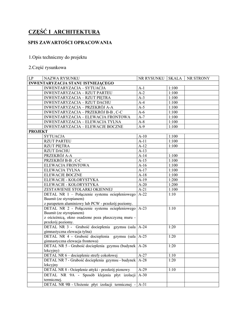 CZĘŚĆ I ARCHITEKTURA SPIS ZAWARTOŚCI OPRACOWANIA 1.Opis techniczny do projektu 2.Część rysunkowa LP NAZWA RYSUNKU INWENTARYZACJA STANU ISTNIEJĄCEGO INWENTARYZACJA – SYTUACJA INWENTARYZACJA – RZUT PARTEU INWENTARYZACJA – RZUT PIĘTRA INWENTARYZACJA – RZUT DACHU INWENTARYZACJA – PRZEKRÓJ A-A INWENTARYZACJA – PRZEKRÓJ B-B , C-C INWENTARYZACJA – ELEWACJA FRONTOWA INWENTARYZACJA – ELEWACJA TYLNA INWENTARYZACJA – ELEWACJE BOCZNE PROJEKT SYTUACJA RZUT PARTEU RZUT PIĘTRA RZUT DACHU PRZEKRÓJ A-A PRZEKRÓJ B-B , C-C ELEWACJA FRONTOWA ELEWACJA TYLNA ELEWACJE BOCZNE ELEWACJE - KOLORYSTYKA ELEWACJE - KOLORYSTYKA ZESTAWIENIE STOLARKI OKIENNEJ DETAL NR 1 – Połączenie systemu ociepleniowego Baumit (ze styropianem) z parapetem aluminiowy lub PCW - przekrój poziomy. DETAL NR 2 - Połączenie systemu ociepleniowego Baumit (ze styropianem) z ościeżnicą, okno osadzone poza płaszczyzną muru przekrój poziomy. DETAL NR 3 - Grubość docieplenia gzymsu (sala gimnastyczna elewacja tylna) DETAL NR 4 - Grubość docieplenia gzymsu (sala gimnastyczna elewacja frontowa) DETAL NR 5 - Grubość docieplenia gzymsu (budynek lekcyjny) DETAL NR 6 – docieplenie strefy cokołowej DETAL NR 7 - Grubość docieplenia gzymsu - budynek lekcyjny DETAL NR 8 - Ocieplenie attyki - przekrój pionowy. DETAL NR 9A - Sposób klejenia płyt izolacji termicznej. DETAL NR 9B - Ułożenie płyt izolacji termicznej - NR RYSUNKU SKALA A-1 A-2 A-3 A-4 A-5 A-6 A-7 A-8 A-9 1:100 1:100 1:100 1:100 1:100 1:100 1:100 1:100 1:100 A-10 A-11 A-12 A-13 A-14 A-15 A-16 A-17 A-18 A-19 A-20 A-21 A-22 1:100 1:100 1:100 1:100 1:100 1:100 1:100 1:100 1:200 1:200 1:100 1:10 A-23 1:10 A-24 1:20 A-25 1:20 A-26 1:20 A-27 A-28 1:10 1:20 A-29 A-30 1:10 A-31 NR STRONY naroże. DETAL NR 10A - Rozmieszczenie łączników mocujących płyty izolacji termicznej (100 x 50 cm). Powierzchnia fasady. DETAL NR 10B - Rozmieszczenie łączników mocujących płyty izolacji termicznej (100 x 50 cm). Pas krawędziowy. Wariant I, IIa. DETAL NR 10C - Rozmieszczenie łączników mocujących płyty izolacji termicznej (100 x 50 cm). Pas krawędziowy. Wariant IIb, III. DETAL 11 - Zbrojenie narożników otworów w elewacji (np: okien, drzwi). A-32 A-33 A-34 A-35 OPIS TECHNICZNY PROJEKTU DOCIEPLENIA TEMAT OPRACOWANIA: TERMOMODERNIZACJA BUDYNKU SZKOLNEGO WRAZ Z SALĄ GIMNASTYCZNĄ LOKALIZACJA: SZKOŁA PODSTAWOWA W ŻÓRAWINIE, UL. KOPERNIKA 15 55-020 ŻÓRAWINA, AM 2, DZ NR 311/2 INWESTOR: URZĄD GMINY ŻÓRAWINA DOLNOŚLĄSKIE UL. KOLEJOWA 6, 55-020 ŻÓRAWINA WOJ. PRZEDMIOT, CEL I ZAKRES OPRACOWANIA: Przedmiotem opracowania jest docieplenie ścian zewnętrznych i stropodachu budynku oraz częściowa wymiana stolarki okiennej i drzwiowej w budynku Szkoły Podstawowej im. Bolesława Chrobrego w Żórawinie Celem opracowania jest dostosowanie termoizolacyjności przegród zewnętrznych budynku do obowiązujących przepisów. Przewiduje się zastosowanie zewnętrznego zespolonego systemu ocieplania Baumit ze styropianem, co zapewni zmniejszenie strat energii cieplnej zgodnie z Rozporządzeniem Ministra Infrastruktury z dnia 12.04.2002 r. w sprawie warunków technicznych, jakim powinny odpowiadać budynki i ich usytuowanie (Dz.U. Nr 75, poz. 690). Zakres opracowania obejmuje docieplenie ścian zewnętrznych i stropodachu oraz wymianę stolarki wraz z robotami towarzyszącymi. OGÓLNA CHARAKTERYSTYKA BUDYNKU: .Budynek wolno stojący, .Budynek zrealizowany w technologii tradycyjnej, .Liczba kondygnacji nadziemnych – 2 (część budynku parterowa), brak podpiwniczenia .Ściany zewnętrzne z cegły palonej pełnej, obustronnie tynkowane, .Stropodach: Nad częścią 2 kondygnacyjną budynku lekcyjnego oraz nad łącznikiem i pomieszczeniami towarzyszącymi sali gimnastycznej niewentylowany, kryty papą, spadek ukształtowany z zastosowaniem płyt korytkowych. Nad częścią sali gimnastycznej niewentylowany, kryty papą, spadek ukształtowany przez zastosowanie stropu żelbetowego. .Stolarka okienna wymieniona na PCV, w strefie wyjścia tylnego jako element portalu przeszklenie w postaci luksferów. .Powierzchnia .Kubatura użytkowa – 1 240,04 m2, – 4213,05 m3, PODSTAWA OPRACOWANIA I WYKORZYSTANE MATERIAŁY .Umowa z Inwestorem, .Rozporządzenie Ministra Infrastruktury z dnia 12.04.2002 r. w sprawie warunków technicznych, jakim powinny odpowiadać budynki i ich usytuowanie (Dz. U. Nr 75, poz. 690), .Bilans energetyczny - opracowanie mgr inż. Bartosz Kuszkowski .Polska Norma PN – EN ISO – 6946:1999 „Komponenty budowlane i elementy budynku. Opór cieplny i współczynnik przenikania ciepła. Metoda obliczania”, .Polska Norma PN – B – 02025:2001 „Obliczanie sezonowego zapotrzebowania na ciepło do ogrzewania budynków mieszkalnych i zamieszkania zbiorowego”, .Polska Norma PN – B – 03430:1983 „Wentylacja w budynkach mieszkalnych zamieszkania zbiorowego i użyteczności publicznej – wymagania”, .Polska Norma PN – EN 13163:2004 „Wyroby do izolacji cieplnej w budownictwie. Wyroby ze styropianu (EPS) produkowane fabrycznie. Specyfikacja.”, .Polska Norma PN – B – 20132:2005 „ Wyroby do izolacji cieplnej w budownictwie. Wyroby ze styropianu (EPS) produkowane fabrycznie. Zastosowania.”, .Polska Norma PN – EN 13162:2002 „Wyroby do izolacji cieplnej w budownictwie. Wyroby z wełny mineralnej (MW) produkowane fabrycznie. Specyfikacja.”, .Polska Norma PN – EN 13499:2005 „Wyroby do izolacji cieplnej w budownictwie. Zewnętrzne zespolone systemy ocieplania (ETICS) ze styropianem. Specyfikacja.”, .Instrukcja ITB 334/02 „Bezspoinowy system ocieplania ścian zewnętrznych budynków”, .„Kryteria oceny jakości wykonania bezspoinowego systemu ocieplania ścian zewnętrznych budynków” – Instytut Techniki Budowlanej, Zakład Certyfikacji, wydanie I, lipiec 2002, .Aprobaty Techniczne ITB dotyczące wybranych systemów dociepleń, .Materiały pomocnicze, instrukcje i karty produktów producenta zestawu dotycz