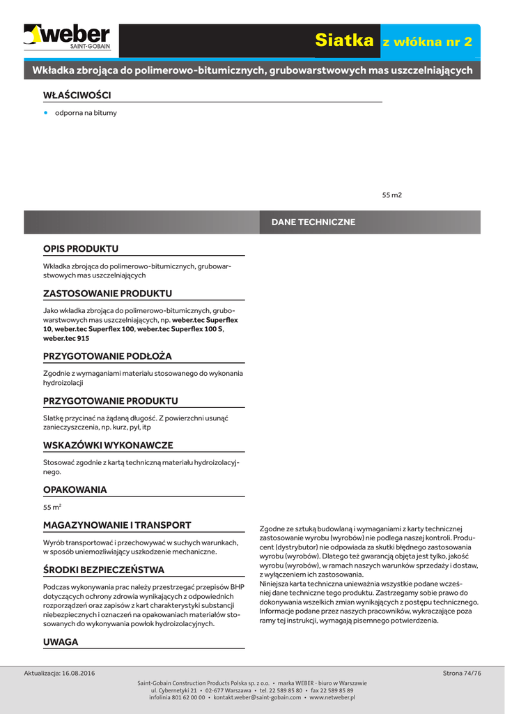 Siatka z włókna nr 2 Wkładka zbrojąca do polimerowo-bitumicznych, grubowarstwowych mas uszczelniających WŁAŚCIWOŚCI • odporna na bitumy 55 m2 DANE TECHNICZNE OPIS PRODUKTU Wkładka zbrojąca do polimerowo-bitumicznych, grubowarstwowych mas uszczelniających ZASTOSOWANIE PRODUKTU Jako wkładka zbrojąca do polimerowo-bitumicznych, grubowarstwowych mas uszczelniających, np. weber.tec Superflex 10, weber.tec Superflex 100, weber.tec Superflex 100 S, weber.tec 915 PRZYGOTOWANIE PODŁOŻA Zgodnie z wymaganiami materiału stosowanego do wykonania hydroizolacji PRZYGOTOWANIE PRODUKTU SIatkę przycinać na żądaną długość. Z powierzchni usunąć zanieczyszczenia, np. kurz, pył, itp WSKAZÓWKI WYKONAWCZE Stosować zgodnie z kartą techniczną materiału hydroizolacyjnego. OPAKOWANIA 55 m2 MAGAZYNOWANIE I TRANSPORT Wyrób transportować i przechowywać w suchych warunkach, w sposób uniemozliwiający uszkodzenie mechaniczne. ŚRODKI BEZPIECZEŃSTWA Podczas wykonywania prac należy przestrzegać przepisów BHP dotyczących ochrony zdrowia wynikających z odpowiednich rozporządzeń oraz zapisów z kart charakterystyki substancji niebezpiecznych i oznaczeń na opakowaniach materiałów stosowanych do wykonywania powłok hydroizolacyjnych. Zgodne ze sztuką budowlaną i wymaganiami z karty technicznej zastosowanie wyrobu (wyrobów) nie podlega naszej kontroli. Producent (dystrybutor) nie odpowiada za skutki błędnego zastosowania wyrobu (wyrobów). Dlatego też gwarancją objęta jest tylko, jakość wyrobu (wyrobów), w ramach naszych warunków sprzedaży i dostaw, z wyłączeniem ich zastosowania. Niniejsza karta techniczna unieważnia wszystkie podane wcześniej dane techniczne tego produktu. Zastrzegamy sobie prawo do dokonywania wszelkich zmian wynikających z postępu technicznego. Informacje podane przez naszych pracowników, wykraczające poza ramy tej instrukcji, wymagają pisemnego potwierdzenia. UWAGA Aktualizacja: 16.08.2016 Strona 74/76 Saint-Gobain Construction Products Polska sp. z o.o. • marka WEBER - biuro w Warszawie ul. Cybernetyki 21 • 02-677 Warszawa • tel. 22 589 85 80 • fax 22 589 85 89 infolinia 801 62 00 00 • [email protected] • www.netweber.pl Siatka z włókna nr 2 Wkładka zbrojąca do polimerowo-bitumicznych, grubowarstwowych mas uszczelniających Aktualizacja: 16.08.2016 Strona 75/76 Saint-Gobain Construction Products Polska sp. z o.o. • marka WEBER - biuro w Warszawie ul. Cybernetyki 21 • 02-677 Warszawa • tel. 22 589 85 80 • fax 22 589 85 89 infolinia 801 62 00 00 • [email protected] • www.netweber.pl Siatka z włókna nr 2 Wkładka zbrojąca do polimerowo-bitumicznych, grubowarstwowych mas uszczelniających Aktualizacja: 16.08.2016 Strona 76/76 Saint-Gobain Construction Products Polska sp. z o.o. • marka WEBER - biuro w Warszawie ul. Cybernetyki 21 • 02-677 Warszawa • tel. 22 589 85 80 • fax 22 589 85 89 infolinia 801 62 00 00 • [email protected] • www.netweber.pl