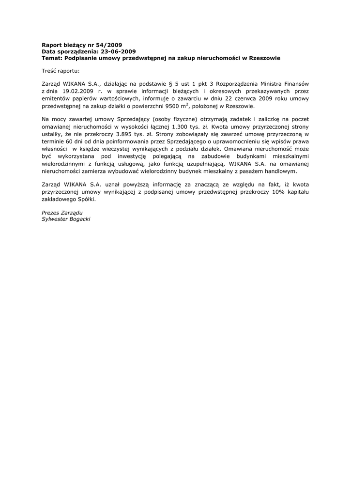 Raport bieżący nr 54/2009 Data sporządzenia: 23-06-2009 Temat: Podpisanie umowy przedwstępnej na zakup nieruchomości w Rzeszowie Treść raportu: Zarząd WIKANA S.A., działając na podstawie § 5 ust 1 pkt 3 Rozporządzenia Ministra Finansów z dnia 19.02.2009 r. w sprawie informacji bieżących i okresowych przekazywanych przez emitentów papierów wartościowych, informuje o zawarciu w dniu 22 czerwca 2009 roku umowy przedwstępnej na zakup działki o powierzchni 9500 m2, położonej w Rzeszowie. Na mocy zawartej umowy Sprzedający (osoby fizyczne) otrzymają zadatek i zaliczkę na poczet omawianej nieruchomości w wysokości łącznej 1.300 tys. zł. Kwota umowy przyrzeczonej strony ustaliły, że nie przekroczy 3.895 tys. zł. Strony zobowiązały się zawrzeć umowę przyrzeczoną w terminie 60 dni od dnia poinformowania przez Sprzedającego o uprawomocnieniu się wpisów prawa własności w księdze wieczystej wynikających z podziału działek. Omawiana nieruchomość może być wykorzystana pod inwestycję polegającą na zabudowie budynkami mieszkalnymi wielorodzinnymi z funkcją usługową, jako funkcją uzupełniającą. WIKANA S.A. na omawianej nieruchomości zamierza wybudować wielorodzinny budynek mieszkalny z pasażem handlowym. Zarząd WIKANA S.A. uznał powyższą informację za znaczącą ze względu na fakt, iż kwota przyrzeczonej umowy wynikającej z podpisanej umowy przedwstępnej przekroczy 10% kapitału zakładowego Spółki. Prezes Zarządu Sylwester Bogacki