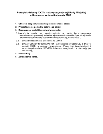 Porządek dzienny XXXIV nadzwyczajnej sesji Rady Miejskiej w Sosnowcu w dniu 6 stycznia 2005 r. 1. Otwarcie sesji i stwierdzenie prawomocności obrad. 2. Przedstawienie porządku dziennego obrad. 3. Rozpatrzenie projektów uchwał w sprawie: 3.1.wyrażenia zgody na wydzierżawienie w trybie bezprzetargowym nieruchomości gruntowej, wchodzącej w obszar katowickiej Specjalnej Strefy Ekonomicznej Podstrefy Sosnowiecko-Dąbrowskiej „Narutowicza”, 3.2. zmian budżetu miasta Sosnowca na 2005 r. 3.3. zmiany Uchwały Nr 528/XXXIII/04 Rady Miejskiej w Sosnowcu z dnia 16 grudnia 2004r. w sprawie zatwierdzenia „Planu prac inwestycyjnych i remontowych na lata 2005-2006 i dalsze z uwagi na ich kontynuację (po aktualizacji). 4. Komunikaty. 5. Zakończenie obrad. Porządek dzienny XXXV sesji Rady Miejskiej w Sosnowcu w dniu 27 stycznia 2005 r. 1. Otwarcie sesji i stwierdzenie prawomocności obrad. 2. Przedstawienie porządku dziennego obrad. 3. Przyjęcie protokołu z XXXIII i XXXIV sesji RM. 4. Informacje: 4.1. Przewodniczącego RM o działaniach Rady w okresie międzysesyjnym. 4.2. Prezydenta Miasta o pracy w okresie międzysesyjnym. 5. Odpowiedzi na interpelacje, zapytania i wnioski. 6. Sprawozdanie z działalności Komisji Zdrowia, Rodziny i Opieki Społecznej. 7. Sprawozdanie z działalności w 2004 r. Komendy Miejskiej Państwowej Straży Pożarnej i Powiatowego Inspektora Nadzoru Budowlanego. 7.1.Wystąpienie przedstawicieli w/w jednostek. 7.2.Zapytania i uwagi radnych. 8. Sprawozdanie z działalności Powiatowej Komisji Bezpieczeństwa i Porządku. 8.1.Wystąpienie Prezydenta Miasta. 8.2.Stanowisko Komisji Bezpieczeństwa i Porządku Publicznego. 8.3.Dyskusja. 8.4.Podjęcie uchwały w sprawie przyjęcia sprawozdania z działalności Powiatowej Komisji Bezpieczeństwa i Porządku za okres 01.01.2004 r. do 31.12.2004 r. 9. Informacja o skutkach finansowych spowodowanych uchwalonymi miejscowymi planami zagospodarowania przestrzennego. 9.1.Wystąpienie przedstawiciela Prezydenta Miasta. 9.2.Opinia Komisji Rozwoju Miasta i Ochrony Środowiska. 9.3.Dyskusja. 10. Rozpatrzenie projektów uchwał w sprawie: 10.1.zmian budżetu miasta Sosnowca na 2005 rok (zmiana II), 10.2.zmiany uchwały Nr 528/XXXIII/04 Rady Miejskiej w Sosnowcu z dnia 16 grudnia 2004 r. w sprawie zatwierdzenia „Planu prac inwestycyjnych i remontowych na lata 2005-2006 i dalsze z uwagi na ich kontynuację (po aktualizacji)” /zmiana w poz. 44/, 10.3.zmiany uchwały Nr 528/XXXIII/04 Rady Miejskiej w Sosnowcu z dnia 16 grudnia 2004 r. w sprawie zatwierdzenia „Planu prac inwestycyjnych i remontowych na lata 2005-2006 i dalsze z uwagi na ich kontynuację (po aktualizacji)”, 10.4.przystąpienia do sporządzenia miejscowego planu zagospodarowania przestrzennego miasta Sosnowca dla obszaru „Zagórze-rejon ul.K.Szymanowskiego”, 10.5.przystąpienia do sporządzenia miejscowego planu zagospodarowania przestrzennego miasta Sosnowca dla obszaru „Zagórze-Północ”, 10.6.przystąpienia do sporządzenia miejscowego planu zagospodarowania przestrzennego miasta Sosnowca dla obszaru „Zagórze-Wschód”, 10.7.przystąpienia do sporządzenia miejscowego planu zagospodarowania przestrzennego miasta Sosnowca dla obszaru „Zagórze Centrum”, 10.8.odmowy udzielenia 50% bonifikaty z tytułu sprzedaży gruntu położonego przy ul. Piłsudskiego na rzecz wieczystego użytkownika – Sosnowieckiej Spółdzielni Mieszkaniowej, 10.9.przyznania pierwszeństwa w nabyciu lokalu użytkowego zlokalizowanego w budynku położonym w Sosnowcu przy ul. 3-go Maja 35, 1 10.10.przyznania pierwszeństwa w nabyciu lokalu użytkowego zlokalizowanego w budynku położonym w Sosnowcu przy Al. Zwycięstwa 8a, 10.11.przyznania pierwszeństwa w nabyciu lokalu użytkowego zlokalizowanego w budynku położonym w Sosnowcu przy ul. Modrzejowskiej 47, 10.12.współfinansowania zadania pod nazwą: Przebudowa chodnika przy cmentarzu – ul. Małobądzka w Będzinie, 10.13.zmiany uchwały 390/XXVI/04 Rady Miejskiej w Sosnowcu z dnia 27 maja 2004 r. w sprawie współfinansowania z budżetu miasta realizacji zadania objętego wnioskiem do konkursu o przyznanie dotacji ze środków Europejskiego Funduszu Rozwoju Regionalnego na projekt realizowany w ramach Zintegrowanego Programu Operacyjnego Rozwoju Regionalnego, 10.14.wyrażenia zgody na wydzierżawienie na okres 10 lat gruntu położonego przy ul.Gacka, 10.15.zmiany w uchwale nr 541/XXXIV/05 Rady Miejskiej w Sosnowcu z dnia 6 stycznia 2005 r. dot. wyrażenia zgody na wydzierżawienie w trybie bezprzetargowym nieruchomości gruntowej, wchodzącej w obszar Katowickiej Specjalnej Strefy Ekonomicznej Podstrefy Sosnowiecko-Dąbrowskiej „Narutowicza”, 10.16.zmiany uchwały nr 386/XXVI/04 Rady Miejskiej w Sosnowcu z dnia 27 maja 2004 r. ws. ustalenia stawek opłat za zajęcie pasa drogowego dróg publicznych w granicach administracyjnych miasta Sosnowca, dla których zarządcą jest Prezydent Miasta Sosnowca, 10.17.zatwierdzenia Zintegrowanego Planu Rozwoju Transportu Publicznego dla Miast: Dąbrowa Górnicza, Sosnowiec i Będzin, 10.18.wyrażenia zgody na zawarcie Porozumienia pomiędzy Gminą Sosnowiec a Gminami Będzin i Dąbrowa Górnicza oraz Przedsiębiorstwem Komunikacji Miejskiej Sp. z o.o. w Sosnowcu, 10.19.zatwierdzenia zmian w statucie oraz zatwierdzenia jednolitego tekstu statutu Samodzielnego Publicznego Zespołu Zakładów Opieki Zdrowotnej „Zagórze” w Sosnowcu ul. Szpitalna 1, 10.20.zmiany Przedstawiciela Wojewody Śląskiego w składzie Rady Społecznej Zakładu Lecznictwa Ambulatoryjnego w Sosnowcu przy ul. Korczaka 7, 10.21.zatwierdzenia zmian w statucie oraz zatwierdzenia jednolitego tekstu statutu Zakładu Lecznictwa Ambulatoryjnego w Sosnowcu przy ul. Korczaka 7, 10.22.utworzenia Miejskiego Przedszkola Nr 43 z Oddziałami Integracyjnymi przy ul.Boh. Monte Cassino 46 w Sosnowcu, 10.23.utworzenia Miejskiego Przedszkola Nr 55 z Oddziałami Specjalnymi przy ul.Akacjowej 81 w Sosnowcu, 10.24.utw