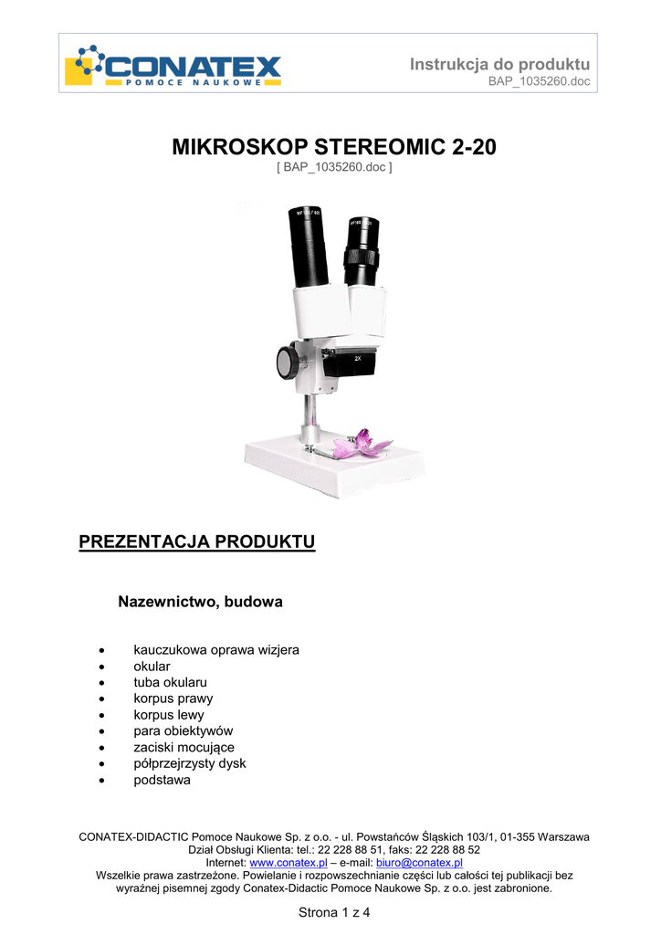 Instrukcja do produktu BAP_1035260.doc MIKROSKOP STEREOMIC 2-20 [ BAP_1035260.doc ] PREZENTACJA PRODUKTU Nazewnictwo, budowa • • • • • • • • • kauczukowa oprawa wizjera okular tuba okularu korpus prawy korpus lewy para obiektywów zaciski mocujące półprzejrzysty dysk podstawa CONATEX-DIDACTIC Pomoce Naukowe Sp. z o.o. - ul. Powstańców Śląskich 103/1, 01-355 Warszawa Dział Obsługi Klienta: tel.: 22 228 88 51, faks: 22 228 88 52 Internet: www.conatex.pl – e-mail: [email protected] Wszelkie prawa zastrzeżone. Powielanie i rozpowszechnianie części lub całości tej publikacji bez wyraźnej pisemnej zgody Conatex-Didactic Pomoce Naukowe Sp. z o.o. jest zabronione. Strona 1 z 4 Instrukcja do produktu BAP_1035260.doc • • • • gałka regulacji pionowej (zębatka) śruba blokująca kolumna pierścień regulacji okularu Wyposażenie optyczne: • • 1 para obiektywów 2x ; złączonych i zamontowanych na ślizgającym się wózku 1 para okularów szerokopolowych 10x wraz z oprawkami Podstawka jest wyposażona w półprzejrzysty dysk i w dwa zaciski mocujące . Szybkie ustawianie ostrości poprzez przesunięcie bloku optycznego wzdłuż kolumny . Dokładne ustawienie ostrości przy użyciu zębatki. INSTALACJA I UTRZYMANIE Montaż • • • Wyjąć mikroskop z opakowania Ustawić na płaskiej i stabilnej powierzchni Wsunąć okulary do tuby okularowej Konserwacja, czyszczenie Konserwacja części mechanicznych: Wytrzeć części metalowe delikatną szmatką lub czystym pędzelkiem. Odciski palców i ślady tłuszczu usunąć przy pomocy tkaniny lekko zwilżonej alkoholem lub ksylenem. CONATEX-DIDACTIC Pomoce Naukowe Sp. z o.o. - ul. Powstańców Śląskich 103/1, 01-355 Warszawa Dział Obsługi Klienta: tel.: 22 228 88 51, faks: 22 228 88 52 Internet: www.conatex.pl – e-mail: [email protected] Wszelkie prawa zastrzeżone. Powielanie i rozpowszechnianie części lub całości tej publikacji bez wyraźnej pisemnej zgody Conatex-Didactic Pomoce Naukowe Sp. z o.o. jest zabronione. Strona 2 z 4 Instrukcja do produktu BAP_1035260.doc Czyszczenie części optycznych: Unikać dotykania palcami soczewek (obiektywów i okularów). Jeśli soczewki ulegną zabrudzeniu, należy je wyczyścić papierkiem przeznaczonym specjalnie do czyszczenia części optycznych lub miękką, czystą, bawełnianą ściereczką. Kurz może być usuwany przy pomocy sprężonego powietrza. W ekstremalnych przypadkach, czyszczenie może się odbyć przy użyciu papierka do czyszczenia optyki, lekko nasączonego ksylenem lub alkoholem. Nigdy nie stosować tych produktów bezpośrednio na soczewki. UWAGA! Nie wolno demontować okularów i obiektywów! UŻYCIE MIKROSKOPU Obsługa: • Dopasować rozsunięcie źrenicowe do obu oczu. • Zwolnić śrubę blokującą i umieścić blok optyczny w ten sposób, by odległość między preparatem a obiektywami wynosiła ok. 8 cm . • Patrząc lewym okiem w lewy okular nastawić ostrość używając gałki regulacji pionowej (10) UWAGA: Jeśli każde oko użytkownika widzi inny obraz, skorygować uruchamiając pierścień moletowany. Dostosowując oko bardzo szybko, ustawić ponownie dwa lub trzy razy ostatnią regulację. Regulację pionową można zmienić bez przestawiania pierścienia okularu. • wymiana obiektywów odbywa się przez prostą zamianę wózka na poziomie przesuwu uchwytów okularów. • System optyczny może obracać się o 360’; obserwacja jest więc możliwa bądź na podstawce bądź poza nią. CONATEX-DIDACTIC Pomoce Naukowe Sp. z o.o. - ul. Powstańców Śląskich 103/1, 01-355 Warszawa Dział Obsługi Klienta: tel.: 22 228 88 51, faks: 22 228 88 52 Internet: www.conatex.pl – e-mail: [email protected] Wszelkie prawa zastrzeżone. Powielanie i rozpowszechnianie części lub całości tej publikacji bez wyraźnej pisemnej zgody Conatex-Didactic Pomoce Naukowe Sp. z o.o. jest zabronione. Strona 3 z 4 Instrukcja do produktu BAP_1035260.doc Charakterystyka techniczna: • • • • • • • • • • • powiększenie : moc obiektywów : moc okularu : regulacja międzyźrenicowa : pole widzenia : dystans pracy : maksymalna grubość preparatu wymiary mikroskopu : grubość podstawy : średnica półprzejrzystego dysku waga : : : 20x 2x 10X 56 do 74 mm 10 mm dla 20x 82 mm 65 mm 115x160x290mm 24 mm 59 mm 1,3 kg CONATEX-DIDACTIC Pomoce Naukowe Sp. z o.o. - ul. Powstańców Śląskich 103/1, 01-355 Warszawa Dział Obsługi Klienta: tel.: 22 228 88 51, faks: 22 228 88 52 Internet: www.conatex.pl – e-mail: [email protected] Wszelkie prawa zastrzeżone. Powielanie i rozpowszechnianie części lub całości tej publikacji bez wyraźnej pisemnej zgody Conatex-Didactic Pomoce Naukowe Sp. z o.o. jest zabronione. Strona 4 z 4