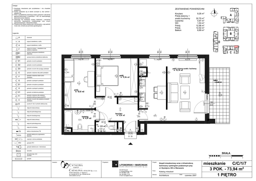 Uwaga: 1. AranŜacja mieszkania jest przykładowa i ma charakter poglądowy. 2. Ściany pokazane są w stanie surowym tj. bez tynków i okładzin itp. 3. Wraz z przykładową aranŜacją wnętrz pokazano zabudowę gipsowo-kartonową w łazienkach i WC do ewentualnego wykonania przez lokatora. 4. Zastrzega się moŜliwość zmiany lokalizacji i wymiarów elementów wyposaŜenia instalacyjnego oraz innych zaprezentowanych elementów lokalu. 5. Powierzchnia lokalu podana jest orientacyjnie, a jej wartość moŜe ulec zmianie po pomiarze geodezyjnym. ZESTAWIENIE POWIERZCHNI Korytarz Pokój dzienny + aneks kuchenny Łazienka WC Pokój Pokój Balkon 9,26 m2 A 32,70 m2 4,97 m2 1,53 m2 12,96 m2 12,52 m2 8,89 m2 Legenda: oprawa ścienna oświetlenia balkonów gniazdo w kuchni podwµjne D2 gniazdo w kuchni podwµjne D3 gniazdo w kuchni dla wyciągu podwµjne E gniazdo w łazience dla pralki podwµjne F gniazdo w łazience obok lustra podwµjne G gniazdo w pokojach podwµjne G1 gniazdo w korytarzu podwµjne H gniazdo w pokojach podwµjne H1 gniazdo na balkonie podwµjne F1 gniazdo w łazience dla zasilania grzejnika elektrycznego podwµjne C 3K w.p.30 G H pokój dzienny+aneks kuchenny A: 32,70 m2 RTV D1 WK A A 1 2 H KS pokój A: 12,96 m2 3 1 K EDONRQ $P D1 2 D2 pokój A: 12,52 m2 2 G gniazdo w kuchni dla zasilania zmywarki podwµjne G puszka 3f. dla kuchenki elektrycznej 1 G 7# 2 F F włącznik świecznikowy D2 2 korytarz A: 9,26 m2 80 205 80 205 A łazienka A: 4,97 m2 włącznik jednobiegunowy PE WŁ grzejnik elektryczny ogrzewania łazienek F F S 1 3 E B1 2 3 180 240 4 3 A 3 H H D KS A WŁ KS 1 5 80 205 A wc A: 1,53 m2 włącznik schodowy A 4 ww 1 F1 5 C G1 A tablica mieszkaniowa TM A D2 80 205 włącznik dwubiegunowy ww w.p.30 H D1 G WO włącznik jednobiegunowy 70 w.p.85 L G włącznik świecznikowy ww w.p.85 RTV G w.p.0 B2 D1 C RTV oprawa nastropowa oświetlenia balkonów 180 210 B1 7# wypust ze ściany - oświetlenie nad lustrem w łazience 185 155 F D D 70 RS 100 205 wypust oświetlenia z sufitu 7# wypust oświetlenia z sufitu A 185 155 A 80 205 1 dzwonek 180 210 2 B A EI 30 osprzęt w ramce podwójnej RTV gniazdo RTV 7# gniazdo telefoniczne / internetowe ' domofon SKALA skrzynka typu mini DomNet 0 grzejnik Inwestor: Projektant: Projekt: LITOBORSKI + MARCINIAK B I U R O A R C H I T E K T O N I C Z N E Sp. z o.o. C ATALINA AVALON Sp. z o.o. 02-647 Warszawa, ul. Tagore'a 3 tel: 022/854 08 74, fax: 022/854 08 59 www.catalina.com.pl 60-749 Poznań ul. Wyspiańskiego 10/9 tel: 061/866 13 84 fax: 061/866 17 36 e-mail: [email protected] Zespół mieszkaniowy wraz z infrastrukturą techniczną i parkingiem podziemnym przy ul. Dywizjonu 303 w Warszawie Faza: Katalog mieszkań BranŜa: Architektura Data: czerwiec 2007 1 2 3 mieszkanie C/C/1/7 3 POK. - 73,94 m2 1 PIĘTRO