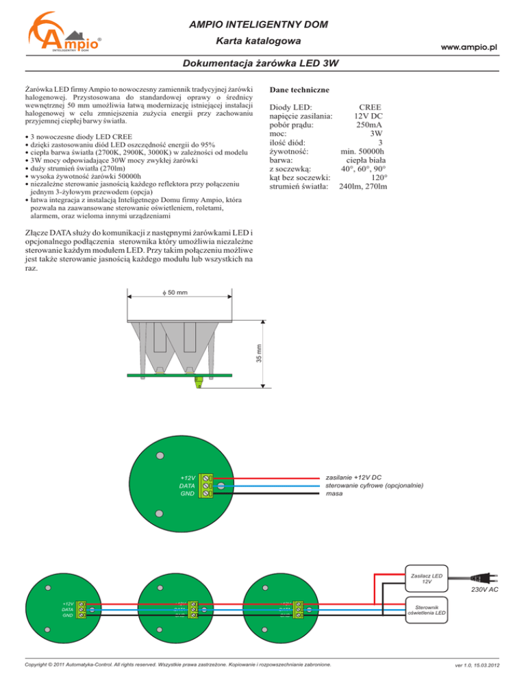 AMPIO INTELIGENTNY DOM Karta katalogowa ® INTELIGENTNY www.ampio.pl DOM Dokumentacja żarówka LED 3W Żarówka LED firmy Ampio to nowoczesny zamiennik tradycyjnej żarówki halogenowej. Przystosowana do standardowej oprawy o średnicy wewnętrznej 50 mm umożliwia łatwą modernizację istniejącej instalacji halogenowej w celu zmniejszenia zużycia energii przy zachowaniu przyjemnej ciepłej barwy światła. Dane techniczne Diody LED: CREE napięcie zasilania: 12V DC pobór prądu: 250mA moc: 3W ilość diód: 3 żywotność: min. 50000h barwa: ciepła biała z soczewką: 40°, 60°, 90° kąt bez soczewki: 120° strumień światła: 240lm, 270lm 3 nowoczesne diody LED CREE dzięki zastosowaniu diód LED oszczędność energii do 95% l ciepła barwa światła (2700K, 2900K, 3000K) w zależności od modelu l 3W mocy odpowiadające 30W mocy zwykłej żarówki l duży strumień światła (270lm) l wysoka żywotność żarówki 50000h l niezależne sterowanie jasnością każdego reflektora przy połączeniu jednym 3-żyłowym przewodem (opcja) l łatwa integracja z instalacją Inteligetnego Domu firmy Ampio, która pozwala na zaawansowane sterowanie oświetleniem, roletami, alarmem, oraz wieloma innymi urządzeniami l l Złącze DATA służy do komunikacji z następnymi żarówkami LED i opcjonalnego podłączenia sterownika który umożliwia niezależne sterowanie każdym modułem LED. Przy takim połączeniu możliwe jest także sterowanie jasnością każdego modułu lub wszystkich na raz. 35 mm f 50 mm zasilanie +12V DC sterowanie cyfrowe (opcjonalnie) masa +12V DATA GND Zasilacz LED 12V 230V AC +12V DATA GND +12V DATA GND +12V DATA GND Copyright © 2011 Automatyka-Control. All rights reserved. Wszystkie prawa zastrzeżone. Kopiowanie i rozpowszechnianie zabronione. Sterownik oświetlenia LED ver 1.0, 15.03.2012
