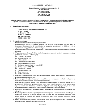 OGŁOSZENIE O PRZETARGU Zespół Szkół z Oddziałami Sportowymi nr 5 61-329 Poznań ul. Głuszyna 187 tel./fax 61 8788 006 NIP 782-23-85-366 REGON 000241927 ogłasza: przetarg pisemny nieograniczony na wynajmem pomieszczeń bloku żywieniowego o łącznej powierzchni 44m2 z przeznaczeniem do przygotowania posiłków dla uczniów, pracowników oraz klientów z zewnątrz I. Organizator przetargu: Zespół Szkół z Oddziałami Sportowymi nr 5 61-329 Poznań ul. Głuszyna 187 tel./fax 61 8788 006 NIP 782-23-85-366 REGON 000241927 II. Przedmiot przetargu: 2 1. Powierzchnia bloku żywieniowego wynosi: 44 m . 2. Przeznaczenie: do przygotowania posiłków dla uczniów, pracowników Zespołu Szkół z Oddziałami Sportowymi nr 5 oraz klientów z zewnątrz w godzinach od 9.00 do 14.30 z wyłączeniem świąt państwowych i kościelnych. 3. Najemca ponosi koszty napraw i remontów, z wyłączeniem awarii instalacji będących częścią budynku. 4. Wyposażenie pomieszczeń bloku żywieniowego (wyposażenie zostanie przekzane według protokółem zdawczo – odbiorczym): a) Zmywarka do naczyń b) Szatkownica RG 100 c) Mikser spiralny d) Obieraczka do ziemniaków e) Patelnia elektryczna – 2 szt. f) Kuchenka gazowa 4 pal – 2 szt. AMICA g) Tabiret gazowy KROMET h) Lodówka POLAR 60 i) Lodówka AMICA 260 j) Okap kuchenny k) Szafka kuchenna 5. Najemca zobowiązany jest do przestrzegania zapisów ustawy o wychowaniu w trzeźwości i przeciwdziałaniu alkoholizmowi. 6. Najemca ponosi odpowiedzialność materialną za wyrządzone szkody związane z niewłaściwym użytkowaniem wynajętych pomieszczeń. 7. Najemca doposaży na własny koszt wynajęte pomieszczenia w urządzenia niezbędne do prowadzenia działalności gastronomicznej przez okres trwania umowy, a po jej wygaśnięciu są one własnością Najemcy. Urządzenia będące własnością Wynajmującego będą do dyspozycji Najemcy, który będzie wykorzystywać je zgodnie z przeznaczeniem. 8. Zniszczony lub skradziony sprzęt stanowiący wyposażenie kuchni Najemca zobowiązuje się odkupić. 9. Najemca jest zobowiązany używać pomieszczenia zgodnie z przeznaczeniem określonym w niniejszym przetargu. Używanie pomieszczeń na inne cele niż określone w umowie oraz użycie lokalu w okresie ferii letnich i zimowych oraz świąt wymaga pisemnej zgody wynajmującego. 10. Każde dodatkowe korzystanie z pomieszczeń bloku żywieniowego musi być uzgodnione z wynajmującym i opłacane wg odrębnych umów. Strona 1 z 3 11. Najemca jest zobowiązany do utrzymania czystości, właściwych warunków sanitarnych oraz usuwania odpadów kuchennych na własny koszt. 12. Najemca ponosi odpowiedzialność materialną za wyrządzone szkody związane z niewłaściwym użytkowaniem wynajętych pomieszczeń. 13. Przygotowane posiłku muszą być zgodne z normami żywieniowym stosowanymi w zbiorowym żywieniu dzieci i młodzieży dla odpowiednich grup wiekowych oraz zgodne z zaleceniami Sanepidu. Najemca będzie przygotowywał jadłospis z 5 - io dniowym wyprzedzeniem. 14. Jadłospis Najemca przygotowuje w formie zapisu elektronicznego, który będzie zamieszczany na stronie internetowej Wynajmującego i Najemcy. 15. Koszty posiłków nie mogą łącznie przekroczyć następujących kwot: - śniadanie: 4,00 PLN - obiad: 11,00 PLN (łącznie dwa dania) 16. Najemca zapewnia żywienie dzieci od poniedziałku do piątku, godziny wydawania posiłków zostaną ustalone z Organizatorem przetargu: Codzienne przygotowanie (zgodnie z normami żywieniowym stosowanymi w zbiorowym żywieniu dzieci i młodzieży) i wydawanie śniadań i obiadów dla uczniów szkoły z wyłączeniem dni wolnych od nauki . Śniadania Herbata;; bułki;; masło;; zupy mleczne;; kawa zbożowa /herbata /kakao bez ograniczeń Śniadanie urozmaicone w nabiał, wędliny, warzywa (2składniki) Dżem, bez ograniczeń w stałym jadłospisie Możliwość dokładek Obiady Obiady dwudaniowe(zupa, drugie danie ,surówki, kompot) Mięso 3 x w tygodniu Kompoty gotowane na miejscu ze świeżych, mrożonych (w okresie zimowym) owoców Surówki przygotowane na miejscu ze świeżych warzyw Ziemniaki obierane na miejscu W ramach podawanych potraw możliwość podawania potraw dietetycznych Dodatki do obiadu 2 x w tygodniu (np. jogurt, owoce,) Produkcja posiłków ze świeżych surowców bez stosowania półproduktów lub wyrobów gotowych Możliwość dokładek ( zupa, surówka, kompot) III. Cena wywoławcza: Cena wywoławcza najmu wynosi miesięcznie 1 200,00 PLN brutto Dodatkowo najmujący podnosić będzie opłaty z tytułu: a) podatek od nieruchomości płatny co kwartał z góry według obowiązujących stawek podatku od nieruchomości;; b) opłata za gaz: na podstawie odczytu licznika w terminie 14 dni od daty wystawienia rachunku;; c) opłata za wodę i odprowadzanie ścieków: ryczałtem w terminie 14 dni od daty wystawienia rachunku; d) opłata za energię elektryczną: na podstawie licznika prądu w terminie 14 dni od daty otrzymania rachunku; e) opłata za ogrzewanie w sezonie grzewczym: kwota proporcjonalna do ogrzewanej powierzchni szkoły i ceny ogrzewania 1 m2 szkoły w terminie 14 dni od daty otrzymania rachunku. Sezon grzewczy będzie liczony od 1 października do 30 kwietnia. IV. Okres najmu: Okres najmu od dnia podpisania umowy (01.07.2013 r.) do dnia 31 stycznia 2015 r. V. Wadium: Organizator przetargu nie żąda wniesienia wadium. VI. Dokumenty składające się na ofertę: Oferty przetargowe złożone na piśmie powinny zawierać: 1. Złożenie pisemnej oferty w zamkniętej kopercie z napisem „Przetarg na wynajem stołówki” w miejscu i terminie wskazanym w ogłoszeniu o przetargu. Strona 2 z 3 2. Oferta powinna zawierać: imię, nazwisko, adres, nr PESEL lub nazwę, siedzibę i adres oferenta (W przypadku podmiotów prowadzących działalność gospodarczą oferent jest zobowiązany przedstawić zaświadczenie o wpisie do ewidencji działalności gospodarczej lub aktualny wypis z kraj