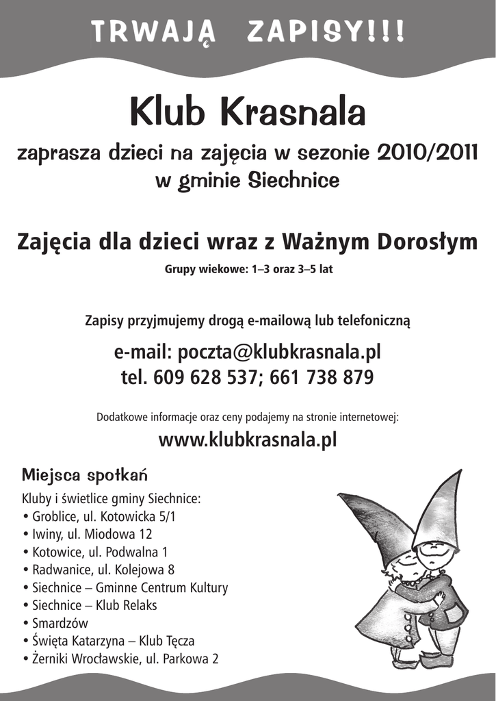 trwają zapiSy!!! Klub Krasnala zaprasza dzieci na zajęcia w sezonie 2010/2011 w gminie Siechnice Zajęcia dla dzieci wraz z Ważnym Dorosłym Grupy wiekowe: 1–3 oraz 3–5 lat Zapisy przyjmujemy drogą e-mailową lub telefoniczną e-mail: [email protected] tel. 609 628 537; 661 738 879 Dodatkowe informacje oraz ceny podajemy na stronie internetowej: www.klubkrasnala.pl Miejsca spotkań Kluby i świetlice gminy Siechnice: • Groblice, ul. Kotowicka 5/1 • Iwiny, ul. Miodowa 12 • Kotowice, ul. Podwalna 1 • Radwanice, ul. Kolejowa 8 • Siechnice – Gminne Centrum Kultury • Siechnice – Klub Relaks • Smardzów • Święta Katarzyna – Klub Tęcza • Żerniki Wrocławskie, ul. Parkowa 2