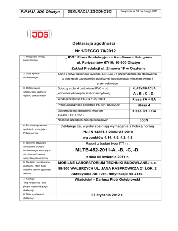 F.P.H.U. JDG Olsztyn DEKLRACJA ZGODNOŚCI Załącznik Nr 18 do Księgi ZKP Deklaracja zgodności Nr 1/DECCO 70/2012 1. Producent wyrobu budowlanego „JDG” Firma Produkcyjno – Handlowo – Usługowa ul. Partyzantów 67/10; 10-900 Olsztyn Zakład Produkcji ul. Zimowa 1F w Olsztynie 2. Opis wyrobu budowlanego Okna i drzwi balkonowe systemu DECCO 71 przeznaczone do stosowania w obiektach użyteczności publicznej, budownictwa mieszkaniowego i przemysłowego 3. Deklarowane Dotyczy stolarki budowlanej PVC – od właściwości użytkowe jednoskrzydłowej do sześcioskrzydowej KLASYFIKACJA A ; B ; C ; D; wyrobu budowlanego Wodoszczelność PN-EN 1027:2001 Klasa 7A ÷ 8A Przepuszczalność powietrza PN-EN 1026:2001 Odporność na obciążenia wiatrem Klasa 4 Klasa C1 ÷ C4 PN-EN 12211:2001 Nośność urządzeń zabezpieczających 4. Podstawa prawna o 350N Deklaruję że, wyroby spełniają wymagania z Polską normą spełnieniu wymogów z Polską normą. PN-EN 14351-1:2006+A1:2010 wg punktów 4.14, 4.5, 4.2, 4.8 5. Warunki dotyczące Raport z badań typu ITT nr. stosowania wyrobu budowlanego, wynikające MLTB-452-2011-A, -B, -C, -D. ze zharmonizowanej specyfikacji technicznej 6. Siedziba notyfikowanej jednostki , która brała udział w ocenie zgodności wyrobu 7. Funkcja – z dnia 05 kwietnia 2011 r. MOBILNE LABORATORIUM TECHNIKI BUDOWLANEJ s.c. 58-300 WAŁBRZYCH UL. JANA KASPROWICZA 21 LOK. 2 Akredytacja AB 1054, notyfikacja NB 2189. Właściciel – Dariusz Piotr Gołębiowski imię i nazwisko oraz podpis wystawiającego deklaracji 8. Data wystawienia deklaracji 07 stycznia 2012 r.