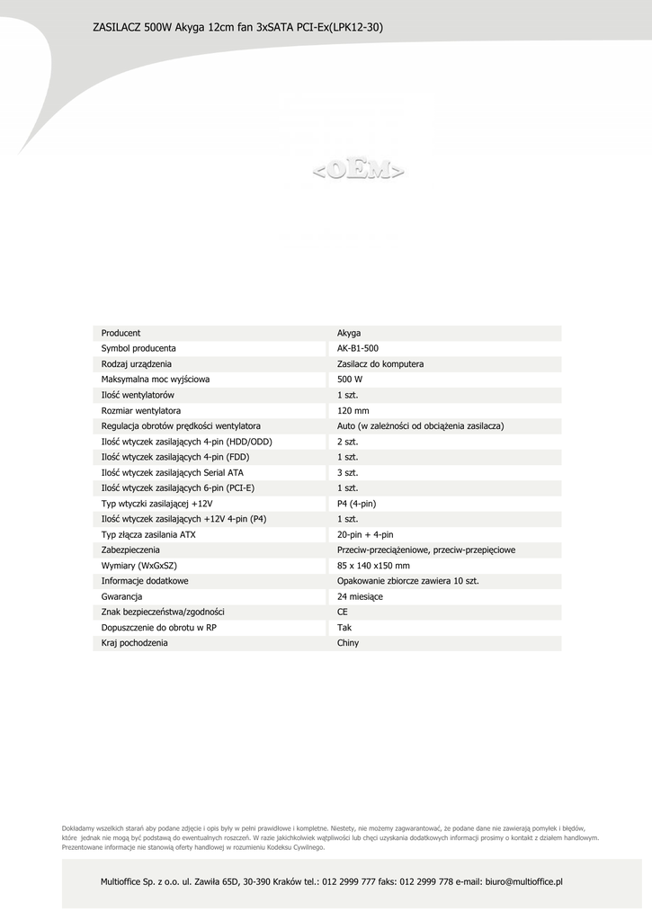 ZASILACZ 500W Akyga 12cm fan 3xSATA PCI-Ex(LPK12-30) Producent Akyga Symbol producenta AK-B1-500 Rodzaj urządzenia Zasilacz do komputera Maksymalna moc wyjściowa 500 W Ilość wentylatorów 1 szt. Rozmiar wentylatora 120 mm Regulacja obrotów prędkości wentylatora Auto (w zależności od obciążenia zasilacza) Ilość wtyczek zasilających 4-pin (HDD/ODD) 2 szt. Ilość wtyczek zasilających 4-pin (FDD) 1 szt. Ilość wtyczek zasilających Serial ATA 3 szt. Ilość wtyczek zasilających 6-pin (PCI-E) 1 szt. Typ wtyczki zasilającej +12V P4 (4-pin) Ilość wtyczek zasilających +12V 4-pin (P4) 1 szt. Typ złącza zasilania ATX 20-pin + 4-pin Zabezpieczenia Przeciw-przeciążeniowe, przeciw-przepięciowe Wymiary (WxGxSZ) 85 x 140 x150 mm Informacje dodatkowe Opakowanie zbiorcze zawiera 10 szt. Gwarancja 24 miesiące Znak bezpieczeństwa/zgodności CE Dopuszczenie do obrotu w RP Tak Kraj pochodzenia Chiny Dokładamy wszelkich starań aby podane zdjęcie i opis były w pełni prawidłowe i kompletne. Niestety, nie możemy zagwarantować, że podane dane nie zawierają pomyłek i błędów, które jednak nie mogą być podstawą do ewentualnych roszczeń. W razie jakichkolwiek wątpliwości lub chęci uzyskania dodatkowych informacji prosimy o kontakt z działem handlowym. Prezentowane informacje nie stanowią oferty handlowej w rozumieniu Kodeksu Cywilnego. Multioffice Sp. z o.o. ul. Zawiła 65D, 30-390 Kraków tel.: 012 2999 777 faks: 012 2999 778 e-mail: [email protected]