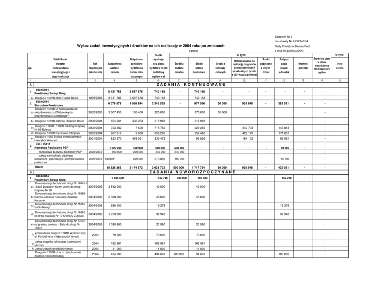 Zał cznik Nr 3 do uchwały Nr XXVI/146/04 Wykaz zada inwestycyjnych i rodków na ich realizacj w 2004 roku po zmianach Rady Powiatu w Bielsku Podl. z dnia 30 grudnia 2004r. w tym: /5 # * # ! " # + $% & ' , ( + ( + . ) , a) Droga Nr 1697B Mie -Rudka-Bo ki 600/60014 2 Starostwo Powiatowe Droga Nr 1601B ul. Mickiewicza od a) skrzy owania z ul.Widowsk do skrzy owania z ul.Kleberga*** b) Droga Nr 1691B odcinek Olszewo-Bo ki Drogi Nr 1689B i 1688B od drogi krajowej c) Nr 66-Bolesty d) Droga Nr 1693B Kiersnowo-Chojewo Droga Nr 1692 B ulica w miejscowo ci e) Hawryłki i Wiercie 754 / 75411 2 Komenda Powiatowa PSP - rozbudowa budynku Komendy PSP - zakup samochodu ci kiego ratowniczo- ga niczego (skompletowanie podwozia) 8 131 786 3 697 678 740 168 8 131 786 3 697 678 740 168 6 076 579 1 056 994 2 345 535 2002/2005 3 007 450 108 400 2000/2004 654 261 2002/2004 2002/2004 1999/2006 ' ( ) +' / ) ( ) ZADANIA 600/60014 Powiatowy Zarz d Dróg 1 + /' * 23 4 ( +' / 0 ) &$ , . -' KONTNUOWANE - 740 168 - - - - - - 740 168 50 000 225 000 175 000 50 000 438 273 215 988 215 988 723 382 7 600 715 782 229 266 342 703 143 813 - 867 916 9 630 858 286 257 486 429 143 171 657 - 2001/2004 823 570 493 091 330 479 99 826 164 102 66 551 - 2003/2004 1 320 000 690 000 420 000 200 000 550 000 340 000 500 000 340 000 220 000 210 000 160 000 3 635 703 500 000 2003/2004 / 630000* 15 528 365 5 174 672 - - 977 566 - 935 948 - 382 021 - - - - - 50 000 - - 50 000 1 717 734 50 000 935 948 - 432 021 - - ZADANIA NOWOROZPOCZYNANE 1 600/60014 Powiatowy Zarz d Dróg Dokumentacja techniczna drogi Nr 1684B i a) 1683B Dubia yn-Kozły-Lewki-do drogi 2004/2006 krajowej Nr 66 Dokumentacja techniczna drogi Nr 1599B b) Bra sk-Załuskie Ko cielne-Załuskie 2004/2006 Koronne Dokumentacja techniczna drogi Nr 1585B c) 2004/2006 Ba ki-Nałogi 1 9 685 530 - 842 746 300 000 390 530 - - - 152 216 - - 2 542 000 42 000 42 000 - 2 398 000 48 000 48 000 - 930 000 19 276 19 276 - 32 940 - Dokumentacja techniczna drogi Nr 1608B od drogi krajowej Nr 19 Knorozy-Zubowo 2004/2006 1 750 000 32 940 Dokumentacja techniczna drogi Nr 1704B e) od granicy powiatu - Sielc-do drogi Nr 1697B 2004/2006 1 386 960 21 960 21 960 - 2004 70 000 70 000 70 000 - 2004 162 961 162 961 162 961 - 2004 11 000 11 000 11 000 2004 434 609 434 609 d) f) przebudowa drogi Nr 1581B Wyszki-Filipy ul. Ko cielnej w miejscowo ci Wyszki zakup ci gnika rolniczego i zamiatarki ulicznej h zakup zespołu pr dotwórczego Droga Nr 1707B ul. w m. Jakubowskie (ł cznie z dokumentacj ) g i ) ( 300 000 34 609 - 100 000 - Inne ródła w tym: /5 # * # ! " # + $% 3 a) b) c) d) 710 / 71015 Powiatowy Inspektorat Nadzoru Budowlanego w Bielsku Podlaskim zakup samochodu osobowego 750 / 75020 Starostwo Powiatowe w Bielsku Podl. zakup zestawów komputerowych zakup 2 kserokopiarek, centralki telefonicznej i faksu wykonanie podjazdu dla osób niepełnosprawnych do budynku biurowego oraz utwardzenie placu, b d cych współwłasno ci powiatu i gminy Bielsk Podlaski budowa kotłowni w budynku przy ul. 3 Maja 17 w Bielsku Podlaskim e) zakup u ywanego samochodu osobowego 4 854 / 85415 Starostwo Powiatowe w Bielsku Podl. zakup komputera w ramach programu „Fundusz Stypendialny dla uczniów szkół ponadgimnazjalnych z obszarów wiejskich” z Europejskiego Funduszu Społecznego 5 6 7 8 9 ' , ( + 2 & ( + . ( ) ) , +' / 30 000 30 000 127 245 23 4 ( - ) &$ , . -' 127 245 - - 127 245 - - - - - - 26 500 26 500 26 500 - 2004 20 800 20 800 20 800 - 2004 54 000 54 000 54 000 - 2004** 1 945 1 945 1 945 - 2004 24 000 24 000 24 000 - 2004 750 / 75095 Starostwo Powiatowe w Bielsku Podlaskim - remont dachu w budynku przy ul. 3 Maja 2004 17 - modernizacja i remont budynku SPZOZ w Bielsku Podlaskim przy ul. 2004 Kleszczelowskiej 1 801 / 80130 Zespół Szkół Zawodowych Nr 1 w Bielsku Podlaskim - modernizacja stadionu szkolnego przy Zespole Szkół Zawodowych Nr 1 2003/2006 im.Marszałka J.K.Piłsudskiego w Bielsku Podlaskim 801 / 80130 Zespół Szkół Rolniczych w Rudce remont ogrodzenia zabytkowego parku pałacowego w Zespole Szkół Rolniczych w 2004 Rudce 853 / 85333 Powiatowy Urz d Pracy w Bielsku Podlaskim - podjazd dla niepełnosprawnych i wymiana drzwi wej ciowych w budynku 2004 przy ul. 3 Maja 17 do Powiatowego Urz du Pracy w Bielsku Podlaskim 854 / 85406 Poradnia Psychologiczno Pedagogiczna w Bielsku Podlaskim - zakup komputera 2004 - 3 200 195 000 3 200 - - - 3 200 - 195 000 3 200 - - - - 3 200 - 195 000 - - 25 000 25 000 25 000 - 170 000 170 000 170 000 - 2 135 000 15 000 30 080 2 135 000 15 000 30 080 - 20 000 20 000 20 000 14 166 14 166 4 000 4 000 - 30 080 14 166 - 4 000 4 000 - - - - - - 14 166 20 000 - 14 166 - 4 000 4 000 - - - 20 000 14 166 - - 30 080 20 000 - ródła KONTNUOWANE 30 000 2004 3 200 Inne ' ( ) +' / ) ( ) ZADANIA 2004 + /' * - - - - - - - - - w tym: /5 # * # ! " # + $% & , ( + ( 852 / 85202 Dom Pomocy Społecznej w Bra sku przebudowa wej cia z budow 10 podjazdu dla niepełnosprawnych i remont parteru w budynku po byłej przychodni zdrowia 754 / 75411 11 Komenda Powiatowa PSP Zakup samochodu zwi zanego z ochron przyrody i rodowiska powiatu bielskiego (cele ga nicze, dowodzenia i ł czno ci) RAZEM: OGÓŁEM: ' + . ( ) ) , 2004 40 000 80 000 2004 ( ) 80 000 23 4 ( 70 000 70 000 ) &$ , . -' ródła - 40 000 50 000 20 000 50 000 20 000 - - - - - 10 000 10 000 10 000 10 000 12 334 141 15 000 1 376 437 380 000 821 021 20 000 3 200 - 152 216 - 10 000 10 000 27 862 506 5 189 672 5 012 140 880 000 2 538 755 70 000 939 148 - 584 237 - 10 000 10 000 * zakup samochodu ratowniczo- ga niczego do KP PSP w Bielsku Podlaskim b dzie realizowany przy wspóludziale KW PSP w Białymstoku , która organizowała przetarg na jego zakup Warto samochodu wynosi 630.000 zł. Powiat Bielski w 2003r. Wydatkuje kwot 220.000 zł, natomiast w 2004r. 280.000 zł.(refaktura). KW PSP w Białymstoku sfinansuje zakup samochodu w kwocie 130.000 zł. (dotacja z NFO iGW w Białymstoku). ** inwestycja została rozpocz ta i zako czona w 2002 rok