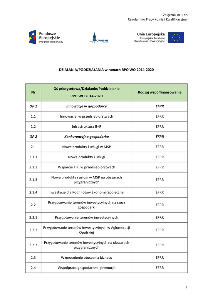 Załącznik nr 1 do Regulaminu Pracy Komisji Kwalifikacyjnej DZIAŁANIA/PODDZIAŁANIA w ramach RPO WO 2014-2020 Nr Oś priorytetowa/Działanie/Poddziałanie RPO WO 2014-2020 Rodzaj współfinansowania OP 1 Innowacje w gospodarce EFRR 1.1 Innowacje w przedsiębiorstwach EFRR 1.2 Infrastruktura B+R EFRR OP 2 Konkurencyjna gospodarka EFRR 2.1 Nowe produkty i usługi w MSP EFRR 2.1.1 Nowe produkty i usługi EFRR 2.1.2 Wsparcie TIK w przedsiębiorstwach EFRR 2.1.3 Nowe produkty i usługi w MSP na obszarach przygranicznych EFRR 2.1.4 Inwestycje dla Podmiotów Ekonomii Społecznej EFRR 2.2 Przygotowanie terenów inwestycyjnych na rzecz gospodarki EFRR 2.2.1 Przygotowanie terenów inwestycyjnych EFRR 2.2.2 Przygotowanie terenów inwestycyjnych w Aglomeracji Opolskiej EFRR 2.2.3 Przygotowanie terenów inwestycyjnych na obszarach przygranicznych EFRR 2.3 Wzmocnienie otoczenia biznesu EFRR 2.4 Współpraca gospodarcza i promocja EFRR 1 Nr Oś priorytetowa/Działanie/Poddziałanie RPO WO 2014-2020 Rodzaj współfinansowania OP 3 Gospodarka niskoemisyjna EFRR 3.1 Strategie niskoemisyjne EFRR 3.1.1 Strategie niskoemisyjne w miastach subregionalnych EFRR 3.1.2 Strategie niskoemisyjne w Aglomeracji Opolskiej EFRR 3.2 Efektywność energetyczna EFRR 3.2.1 Efektywność energetyczna w budynkach publicznych EFRR 3.2.2 Efektywność energetyczna w budynkach publicznych Aglomeracji Opolskiej EFRR 3.2.3 Efektywność energetyczna w mieszkalnictwie EFRR 3.3 Odnawialne źródła energii EFRR 3.4 Efektywność energetyczna w MSP EFRR OP 4 Zapobieganie zagrożeniom EFRR 4.1 Mała retencja EFRR 4.2 System wczesnego reagowania i ratownictwa EFRR OP 5 Ochrona środowiska, dziedzictwa kulturowego i naturalnego EFRR 5.1 Ochrona różnorodności biologicznej EFRR 5.2 Poprawa gospodarowania odpadami komunalnymi EFRR 5.3 Ochrona dziedzictwa kulturowego i kultury EFRR 5.3.1 Dziedzictwo kulturowe i kultura EFRR 5.3.2 Dziedzictwo kulturowe i kultura na obszarach przygranicznych EFRR 5.3.3 Dziedzictwo kulturowe i kultura w Aglomeracji Opolskiej EFRR 2 Nr Oś priorytetowa/Działanie/Poddziałanie RPO WO 2014-2020 Rodzaj współfinansowania 5.4 Gospodarka wodno-ściekowa EFRR OP 6 Zrównoważony transport na rzecz mobilności mieszkańców EFRR 6.1 Infrastruktura drogowa EFRR 6.2 Nowoczesny transport kolejowy EFRR OP 7 Konkurencyjny rynek pracy EFS 7.1 Aktywizacja zawodowa osób pozostających bez pracy realizowana przez PUP EFS 7.2 Aktywizacja zawodowa osób pozostających bez pracy EFS 7.3 Zakładanie działalności gospodarczej EFS 7.4 Wydłużanie aktywności zawodowej EFS 7.5 Szkolenia, doradztwo dla przedsiębiorców i pracowników przedsiębiorstw oraz adaptacyjność przedsiębiorstw EFS 7.6 Godzenie życia prywatnego i zawodowego EFS OP 8 Integracja społeczna EFS 8.1 Dostęp do wysokiej jakości usług zdrowotnych i społecznych EFS 8.2 Włączenie społeczne EFS 8.3 Wsparcie podmiotów ekonomii społecznej EFS OP 9 Wysoka jakość edukacji EFS 9.1 Rozwój edukacji EFS 9.1.1 Wsparcie kształcenia ogólnego EFS 9.1.2 Wsparcie kształcenia ogólnego w Aglomeracji Opolskiej EFS 3 Nr Oś priorytetowa/Działanie/Poddziałanie RPO WO 2014-2020 Rodzaj współfinansowania 9.1.3 Wsparcie edukacji przedszkolnej EFS 9.1.4 Wsparcie edukacji przedszkolnej w Aglomeracji Opolskiej EFS 9.1.5 Programy pomocy stypendialnej EFS 9.2 Rozwój kształcenia zawodowego EFS 9.2.1 Wsparcie kształcenia zawodowego EFS 9.2.2 Wsparcie kształcenia zawodowego w Aglomeracji Opolskiej EFS 9.3 Wsparcie kształcenia ustawicznego EFS OP 10 Inwestycje w infrastrukturę społeczną EFRR 10.1 Infrastruktura społeczna na rzecz wyrównania nierówności w dostępie do usług EFRR 10.1.1 Infrastruktura ochrony zdrowia w zakresie profilaktyki zdrowotnej mieszkańców regionu EFRR 10.1.2 Infrastruktura usług społecznych EFRR 10.2 Inwestycje wynikające z Lokalnych Planów Rewitalizacji EFRR 10.3 E-usługi publiczne EFRR 10.4 Rozwój infrastruktury edukacyjnej i szkoleniowej EFRR 4